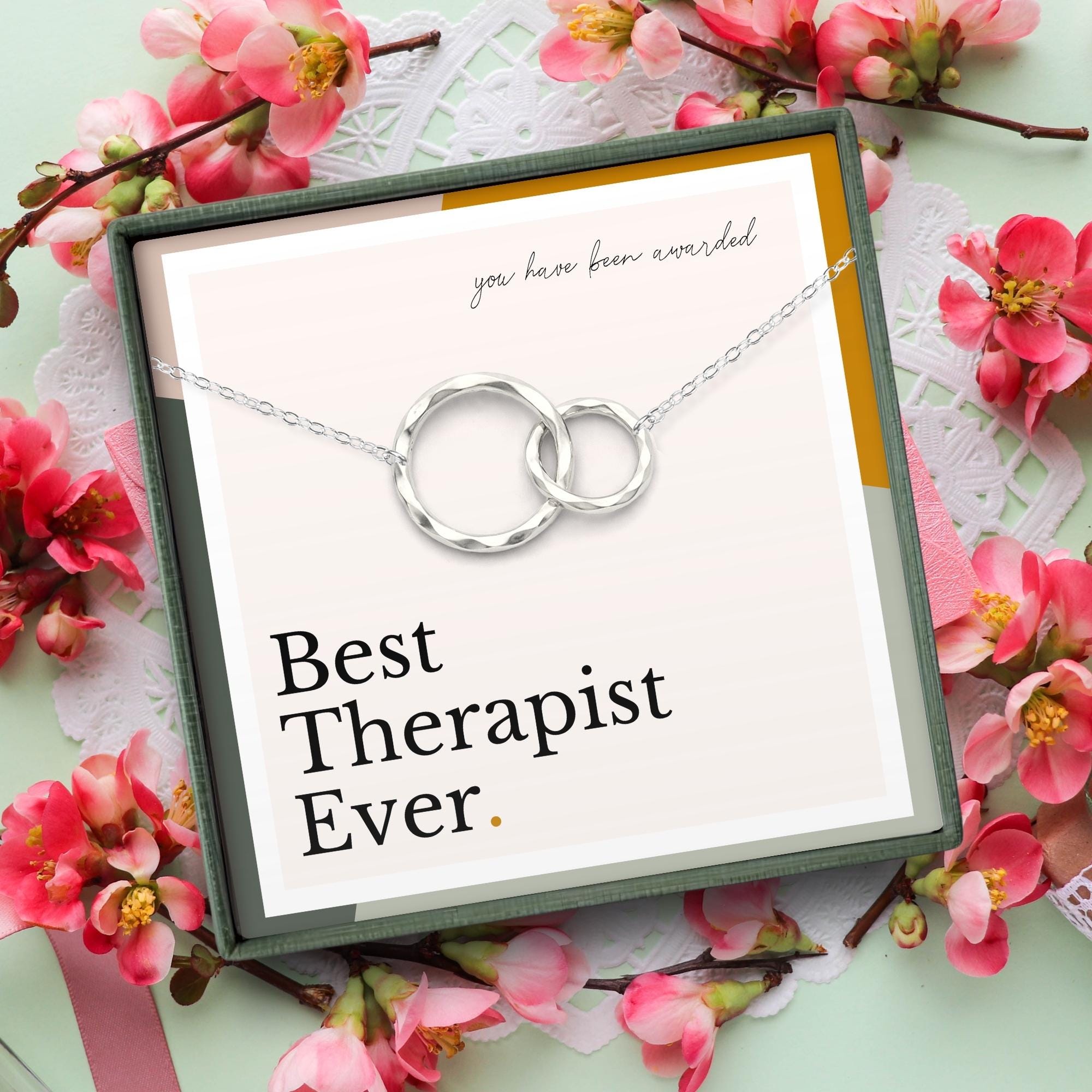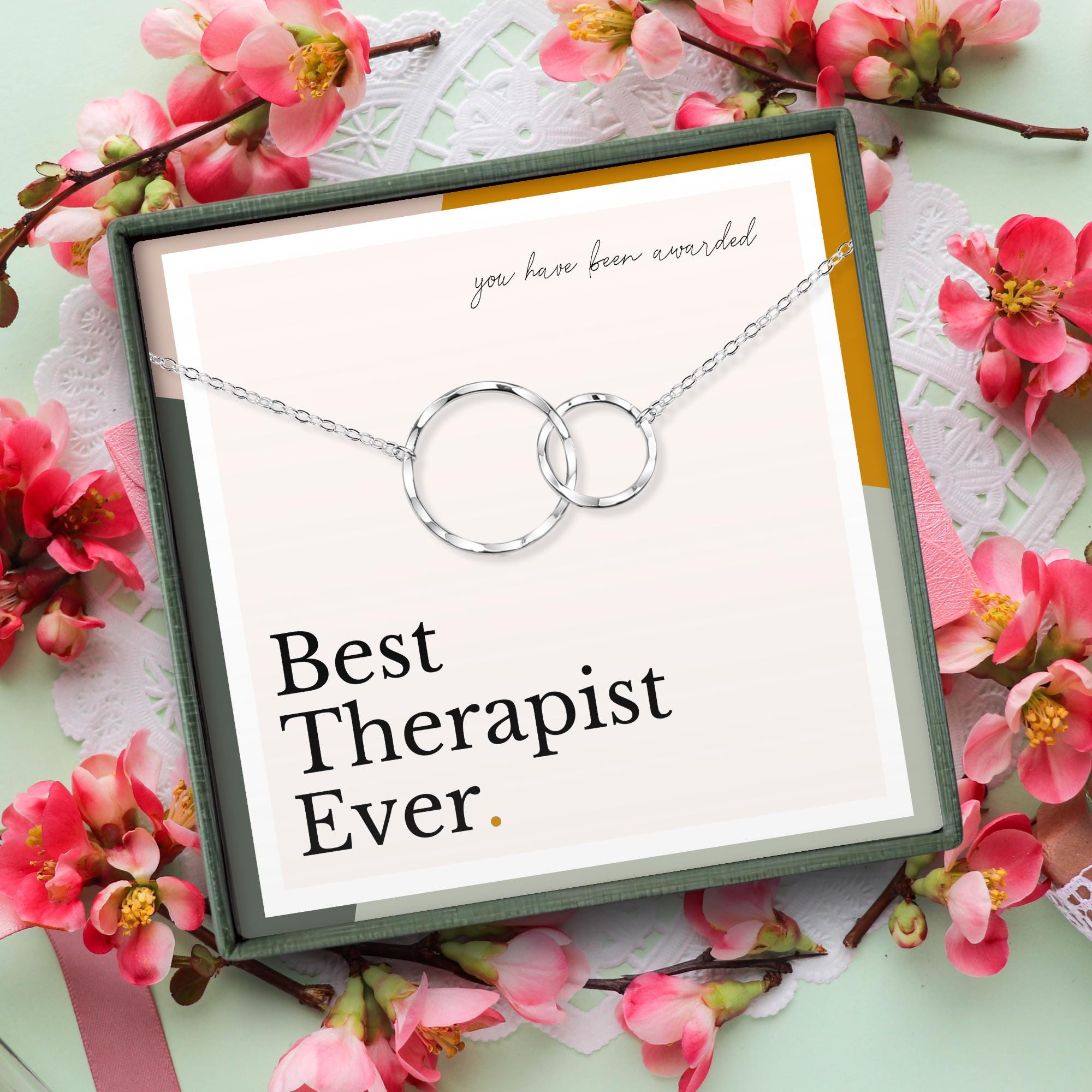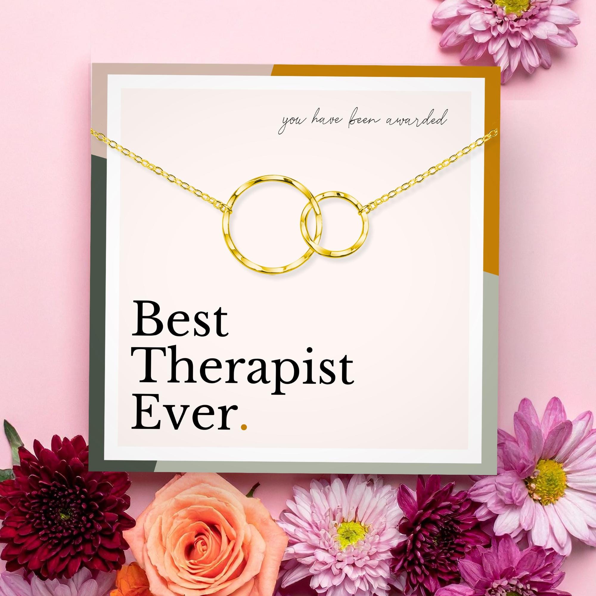 Say thank you in a meaningful way with this “Best Therapist Ever” necklace—a heartfelt gift to honor the support, compassion, and guidance of an exceptional therapist. Featuring a delicate interlocking circles design, this dainty necklace symbolizes connection and trust. Whether you're a client expressing gratitude, or a colleague celebrating a mental health professional, this ready-to-gift box is perfect for therapist appreciation, career milestones, or simply to say: you made a difference. A beautiful way to recognize the heart behind the healing.