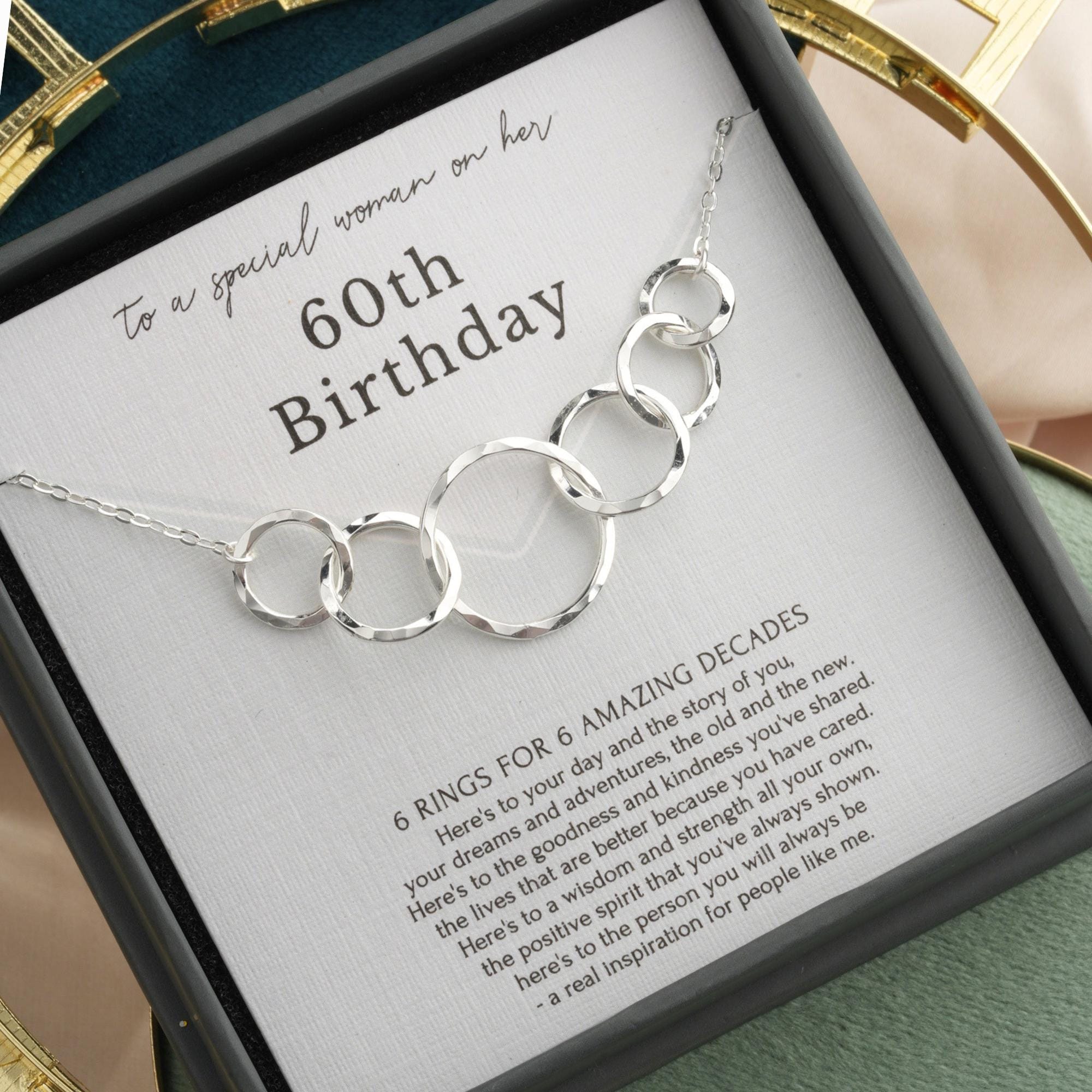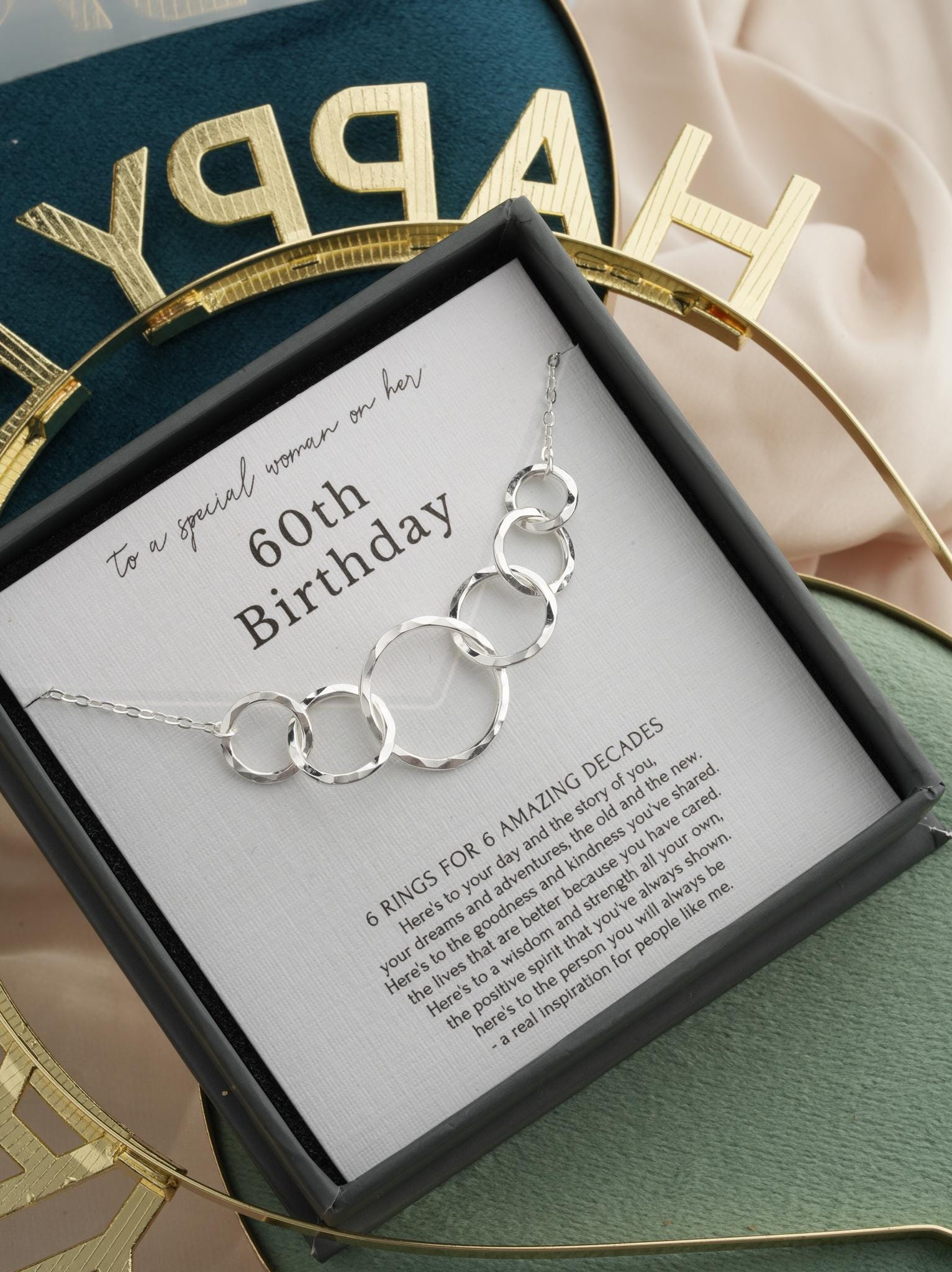 Celebrate her milestone with a beautiful 6 ring necklace—each ring symbolizing a decade of her extraordinary life. This elegant gold or silver necklace is more than jewelry; it’s a tribute to her strength, kindness, and unwavering spirit. Whether she’s your mom, wife, sister, or best friend, this piece honors her 60 years of dreams, wisdom, and the lives she’s touched. Thoughtfully packaged with a heartfelt card that reads “6 RINGS FOR 6 AMAZING DECADES,” it’s the perfect 60th birthday gift to make her feel cherished and inspired. Ideal for anyone looking for a meaningful 60th birthday necklace that celebrates a life well-lived.