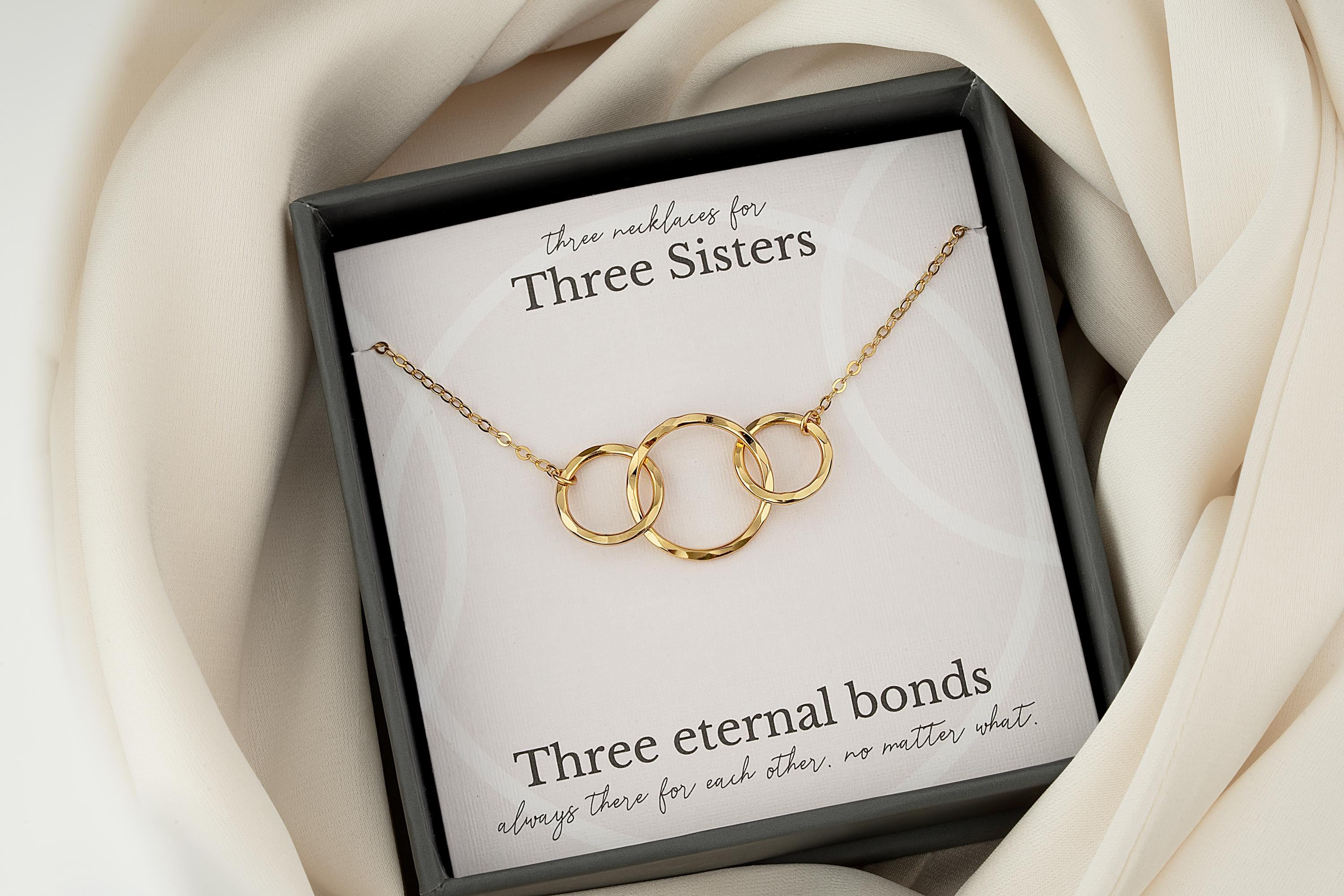 With option V.1 you will receive a set of 3 two ring necklaces - one for each sister. Option V.2 includes a single necklace with 3 interlocking rings. This 3 ring necklace is also available as a set of 3 separate necklaces by choosing option V.3. Please note that with option V.3, each necklace will be packaged separately in its own box.