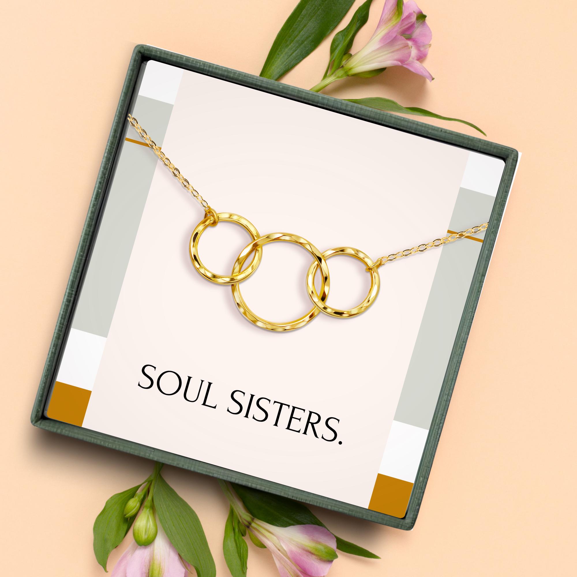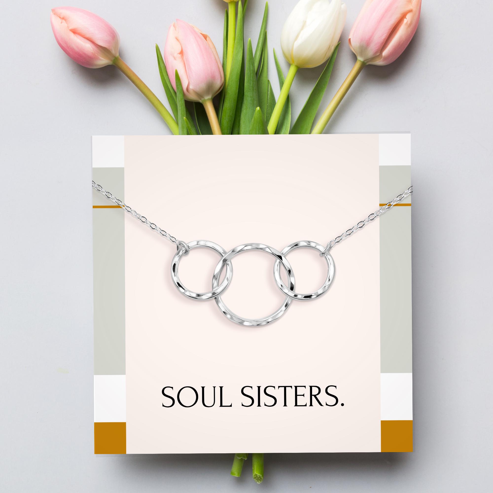 Celebrate your unbreakable bond with this Soul Sisters necklace set — a heartfelt gift for the best friends who feel like family. Whether you're three soul sisters, lifelong besties, or bonded bridesmaids, this matching necklace set is a reminder that true friendship is forever. The card simply reads “Soul Sisters,” letting the meaning speak for itself. A thoughtful and stylish way to say “you mean everything to me,” perfect for birthdays, bridal parties, or just because.