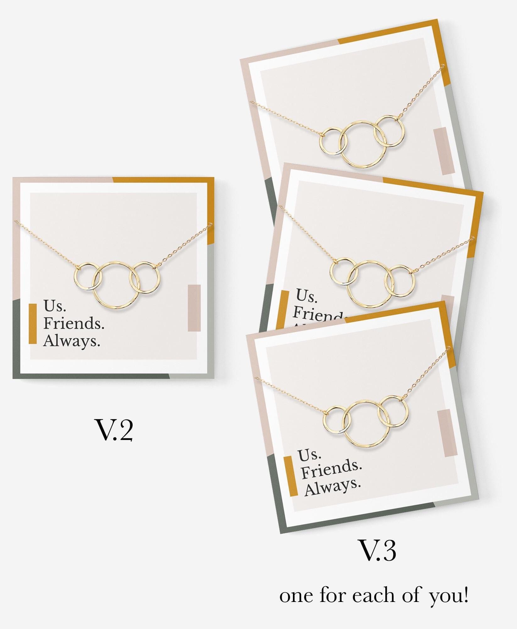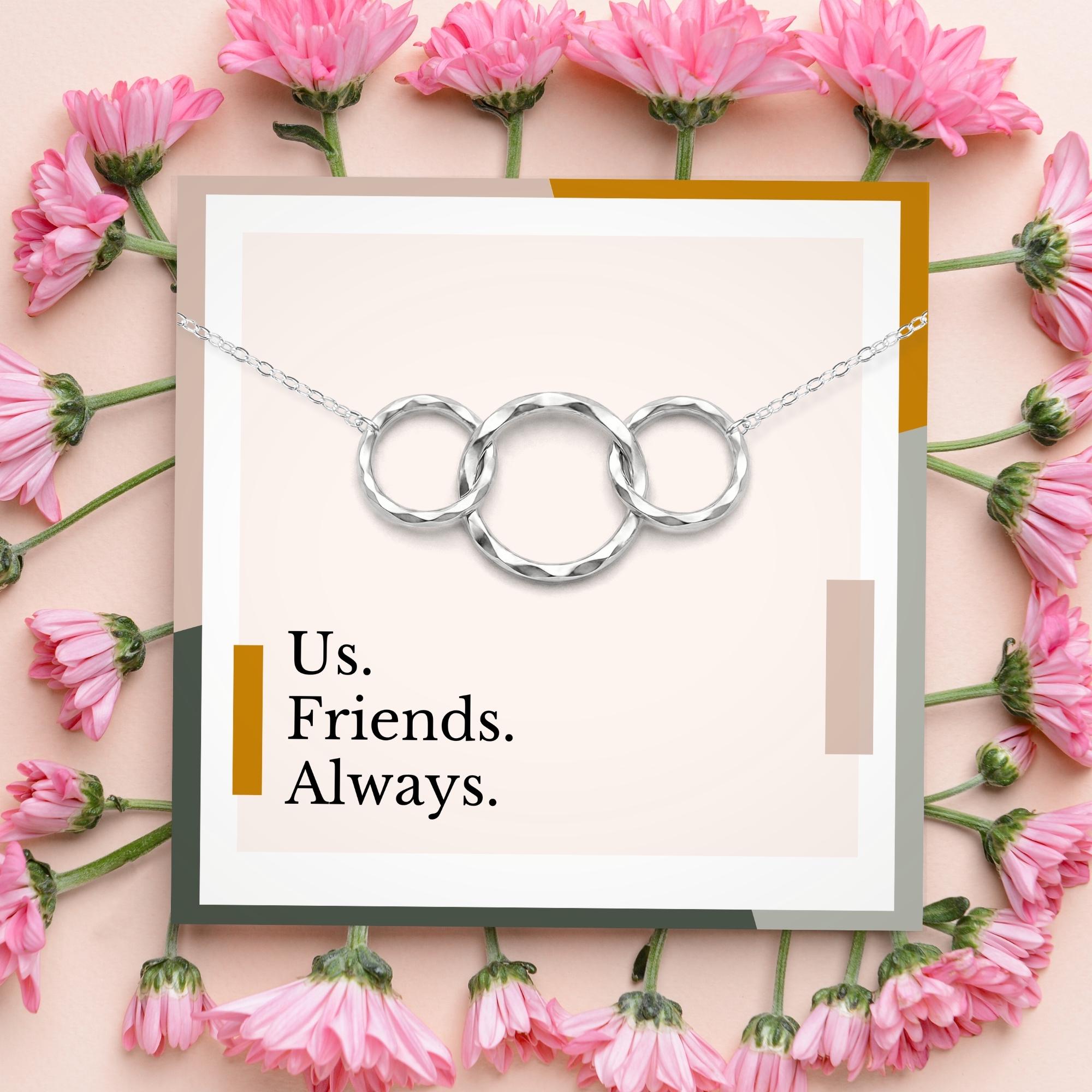 Celebrate your unbreakable bond with this minimalist yet deeply meaningful friendship necklace set. Designed with interlocking sterling silver circles, the matching 3 rings symbolize the forever connection between best friends, sisters, or soulmates — no matter the miles or moments apart. The card simply says it all: “Us. Friends. Always.” — a quiet but powerful reminder of a bond that never fades. Whether you're marking a birthday, sending love across long distances, or gifting just because, this gift speaks volumes with elegant simplicity and lasting sentiment.