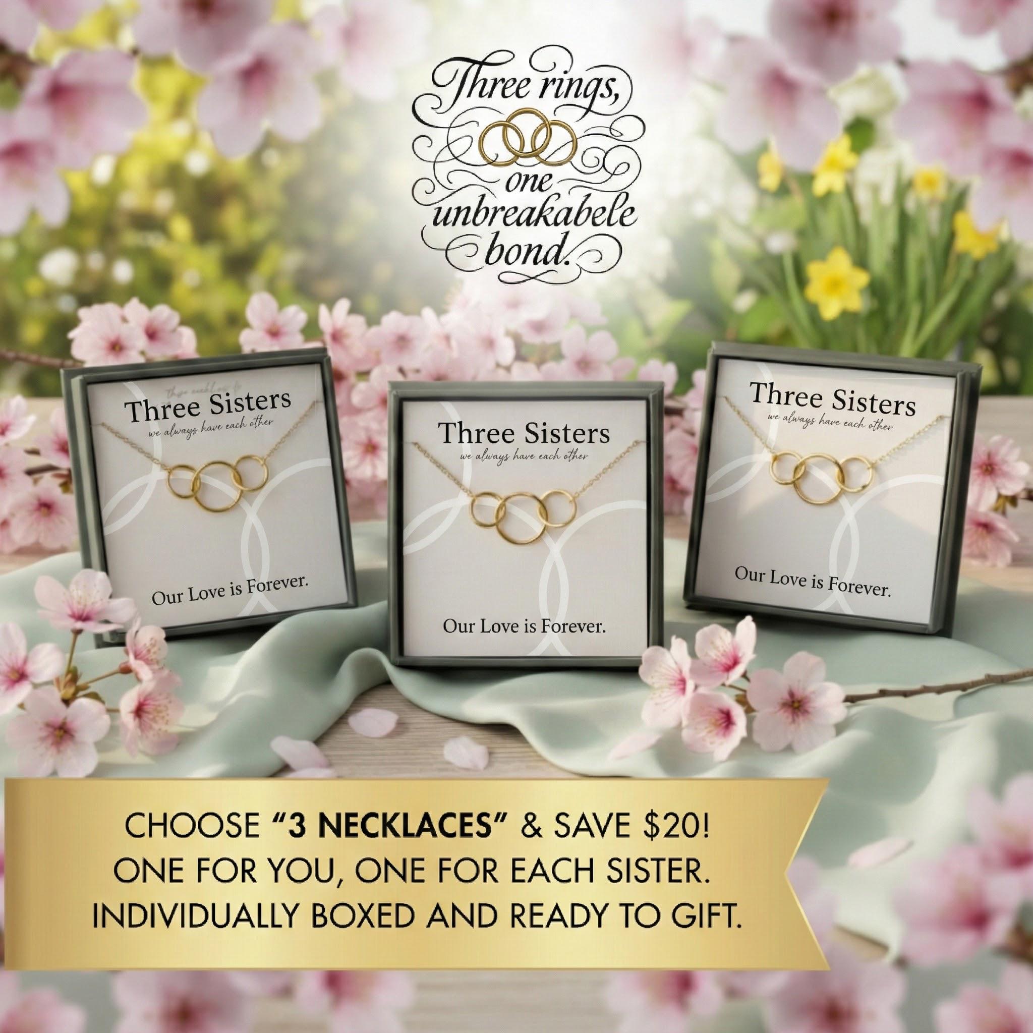 Celebrate the powerful, unbreakable bond of sisterhood with this meaningful three-ring necklace set. Designed for three sisters — big, middle, and little — each interlocking circle represents your eternal connection and unconditional love. The included card reads: “Three Sisters we always have each other. Our Love is Forever.” Whether you're near or far, this matching set is a beautiful reminder that no matter where life leads, you’ll always have each other. A heartfelt gift for birthdays, holidays, or just because — this necklace honors your forever sister bond in a simple, elegant way.
