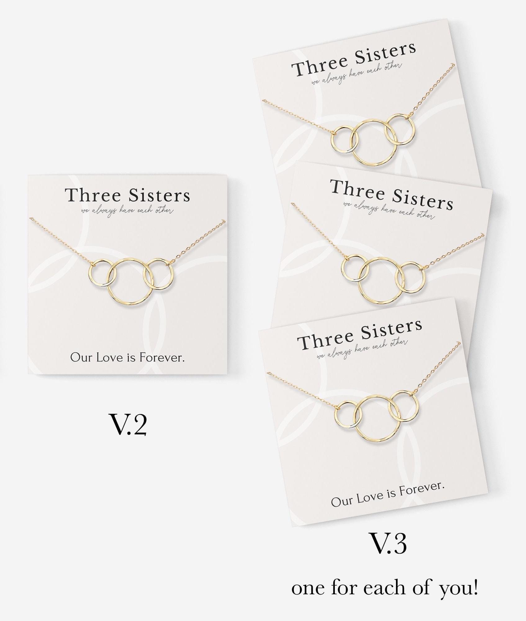 With option V.1 you will receive a set of 3 two ring necklaces - one for each sister. Option V.2 includes a single necklace with 3 interlocking rings. This 3 ring necklace is also available as a set of 3 separate necklaces by choosing option V.3. Please note that with option V.3, each necklace will be packaged separately in it's own box.