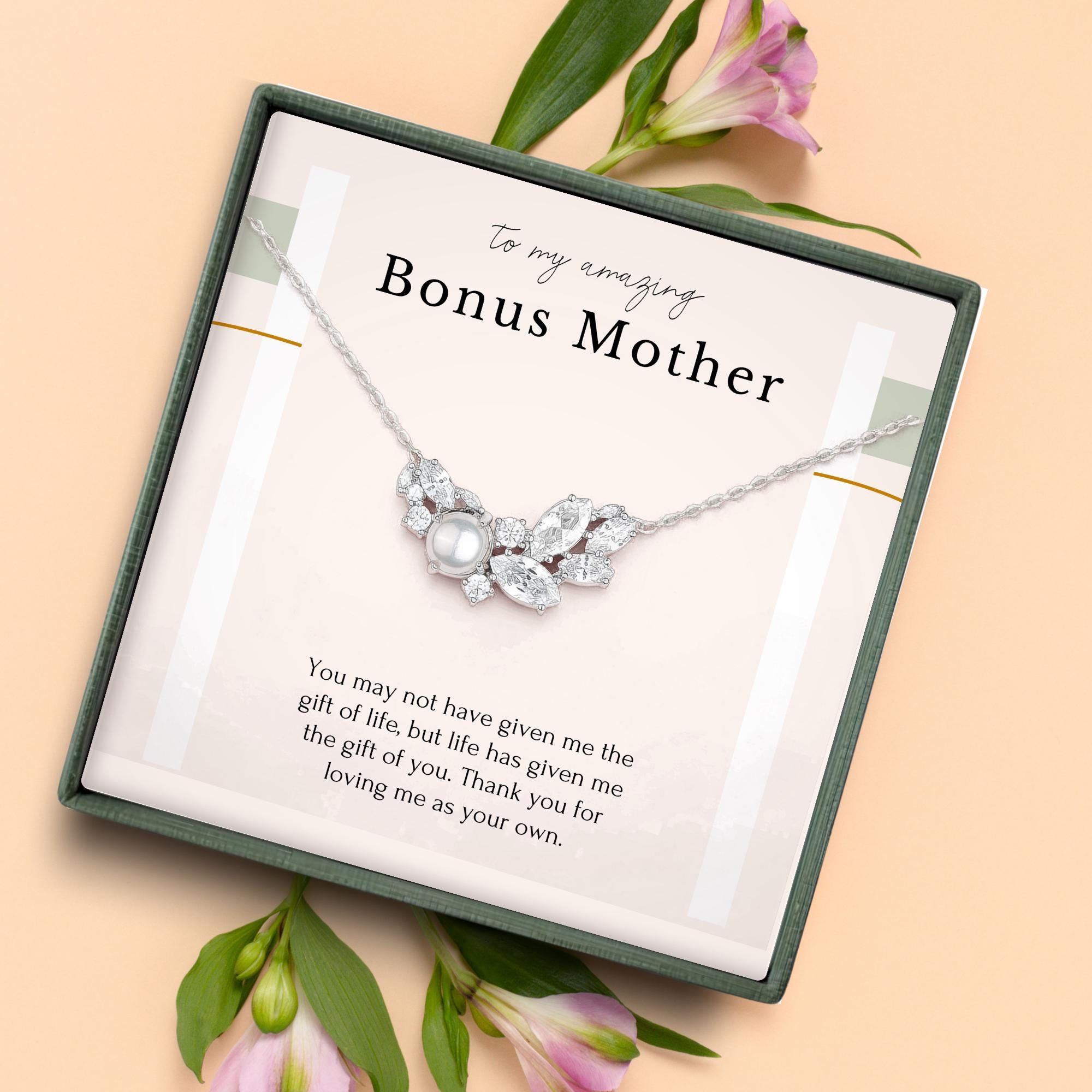 This Bonus Mom Necklace Gift is the perfect way to honor your Step Mother, Gift for Stepmom, Step Mom Wedding Gift, Mother's Day Gift, Stepmother, Mother Figure, Bonus Mom, Second Mom, or Adoptive Mom. It celebrates the special women in our lives who, despite not being biologically related, have stepped up and shown unwavering love and support. Show your appreciation with this beautiful pearl necklace and its heartfelt message.