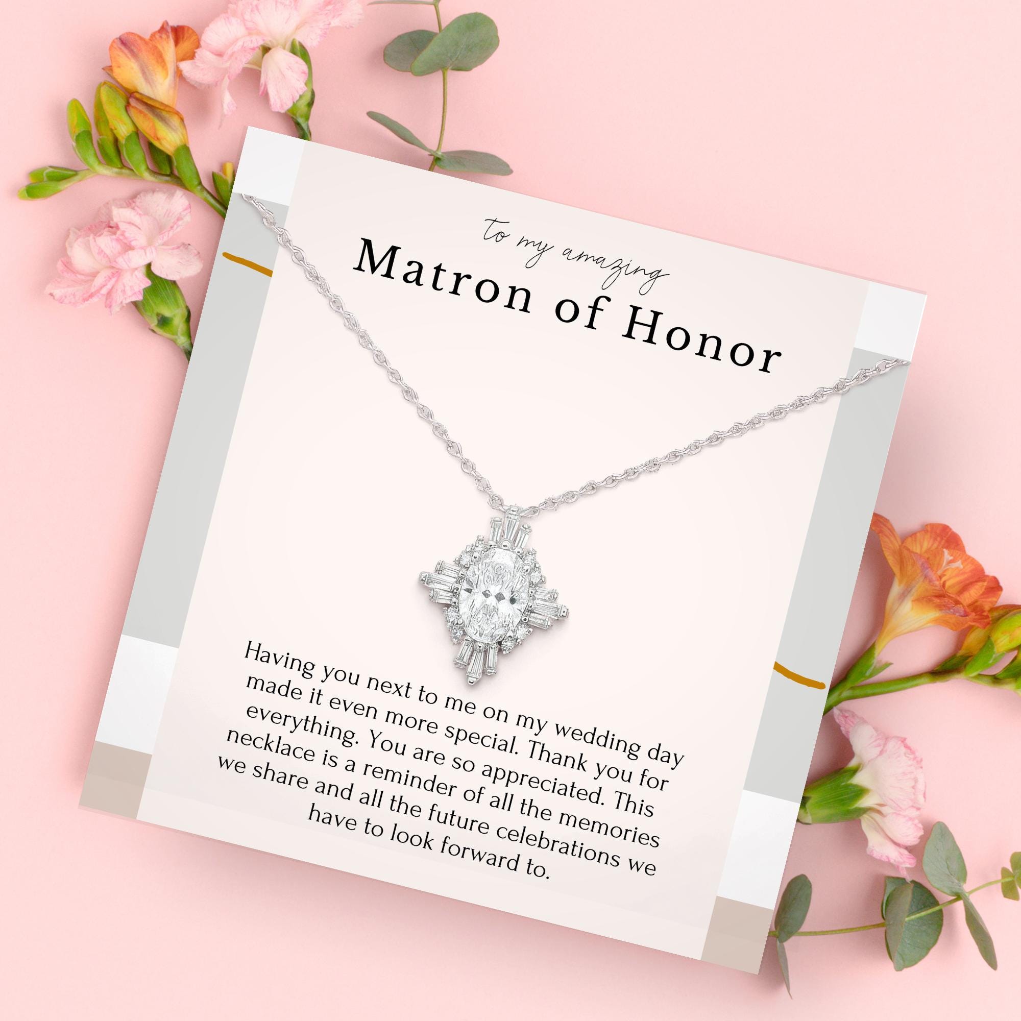 Show your appreciation with this elegant Matron of Honor necklace—an unforgettable thank-you gift that honors the love, laughter, and support she brought to your special day. Featuring a vintage-inspired crystal and pearl design, this sterling silver necklace is as timeless as the bond you share. The included message card expresses heartfelt gratitude for her presence by your side, making it the perfect keepsake to celebrate your wedding memories and the many future celebrations ahead. Thoughtfully gift-boxed and ready to give, it’s more than jewelry—it’s a tribute to your extraordinary Matron of Honor.