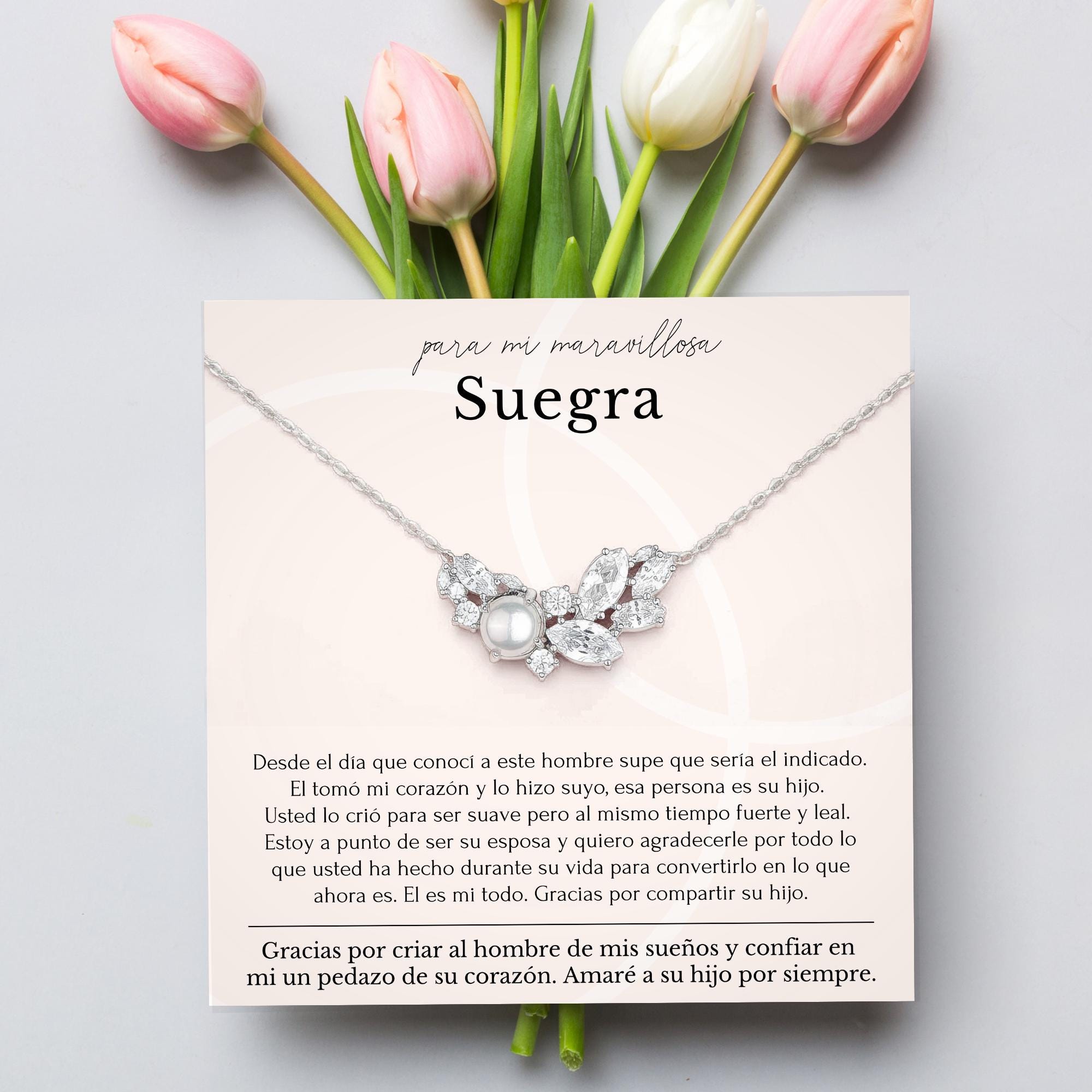 Spanish Mother of the Groom Gift From Bride • Spanish Poem Message for mother in law on wedding day from bride • Collar de perla individual para madre del novio
