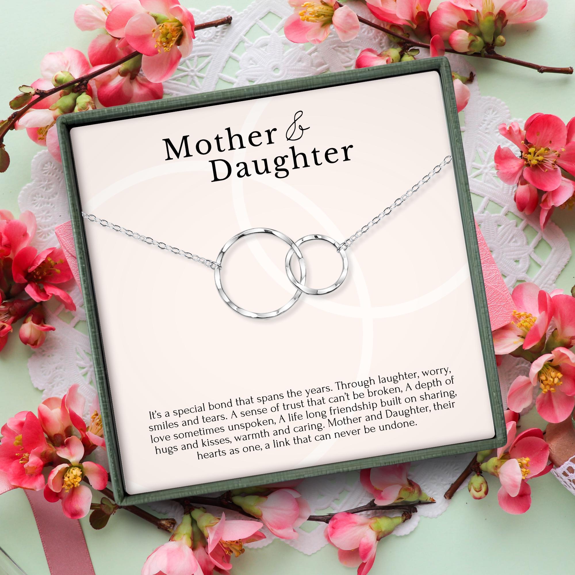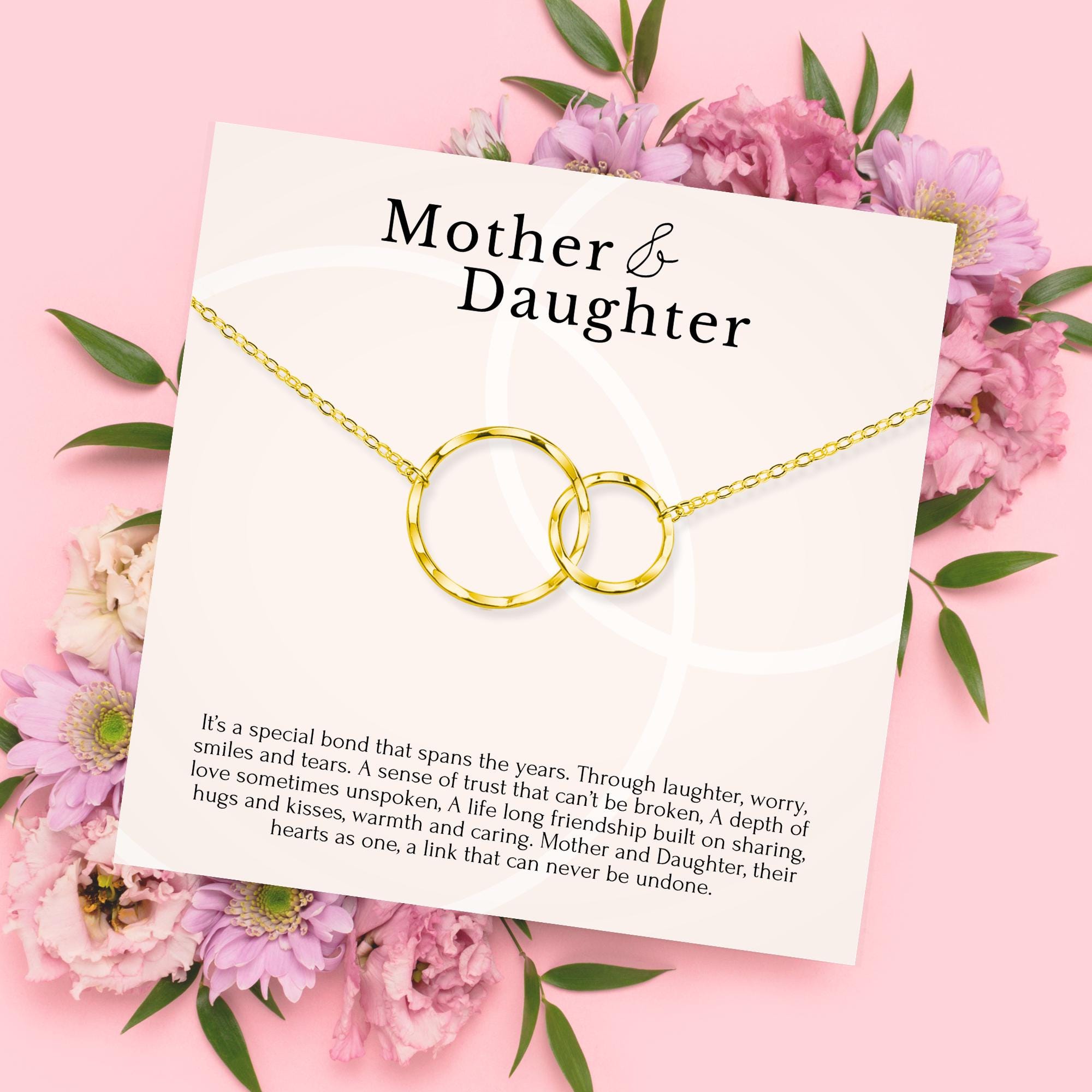 Celebrate your love with a beautiful handmade necklace or a set of 2. The unity link infinity circle pendant represents an eternal bond between a mother and daughter. A thoughtful and meaningful gift for Mother’s day, mom’s birthday, daughter’s birthday or for your mother on your wedding day. 14K gold vermeil and sterling silver rings are soldered in our studio and hand textured with a tiny hammer to create one of a kind pendant. The circles are suspended on dainty but strong chain to create an ethereal "floating" look.