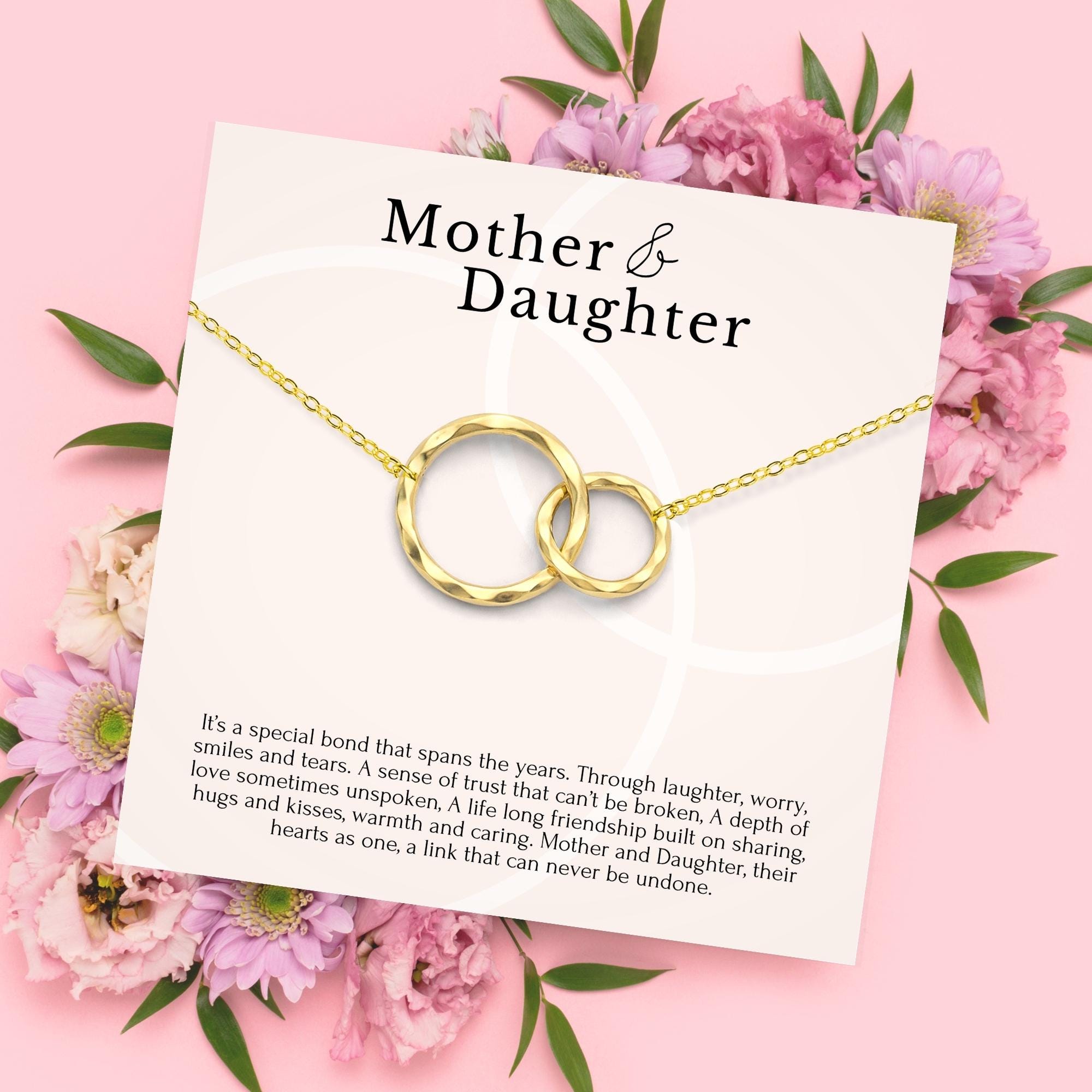 Celebrate your love with a beautiful handmade necklace. The infinity circle pendant represents an eternal bond between a mother and daughter. A thoughtful and meaningful gift for Mother’s day, mom’s birthday, daughter’s birthday or for your mother on your wedding day. 14K gold vermeil and sterling silver rings are soldered in our studio and hand textured with a tiny hammer to create one of a kind pendant. The circles are suspended on dainty but strong chain to create an ethereal "floating" look.