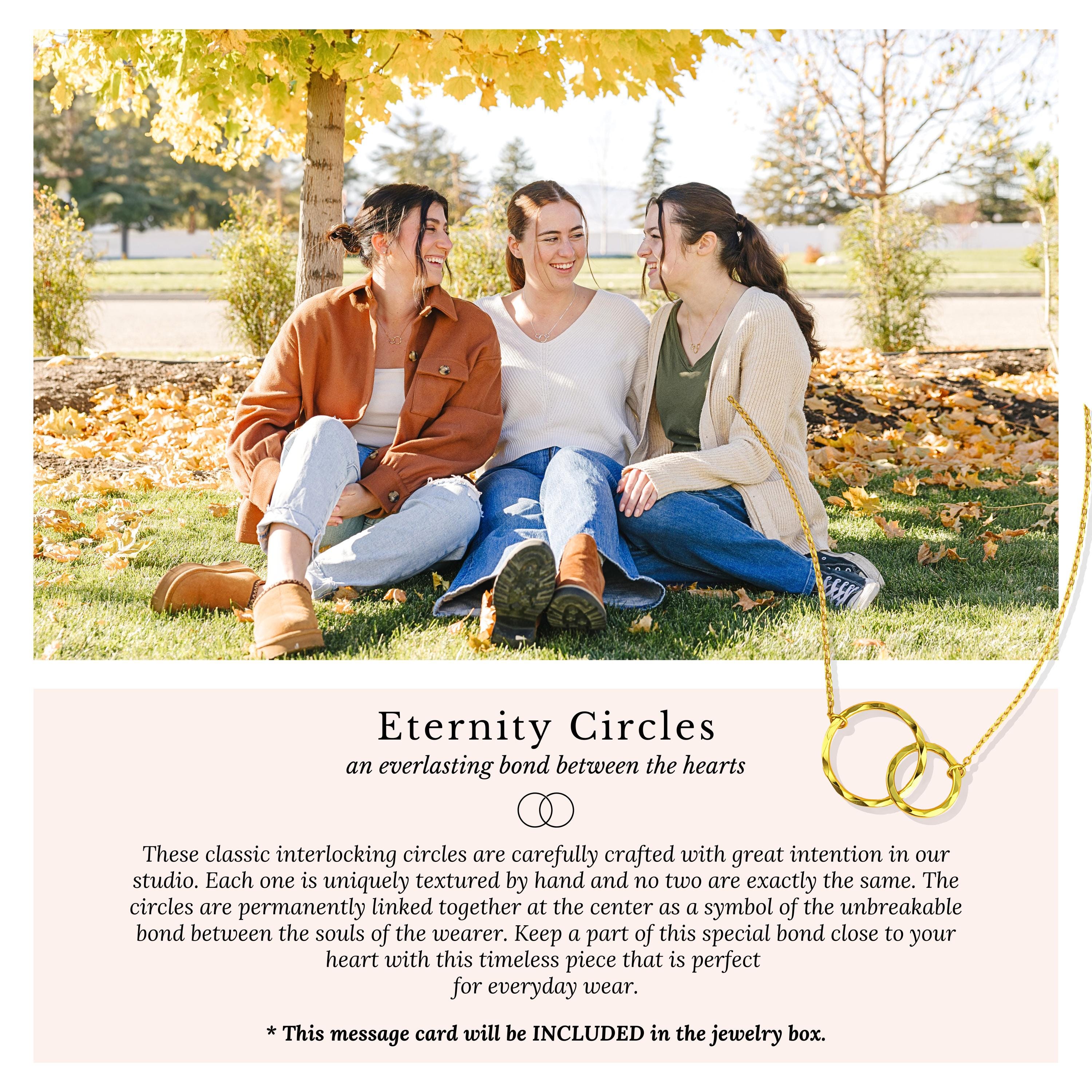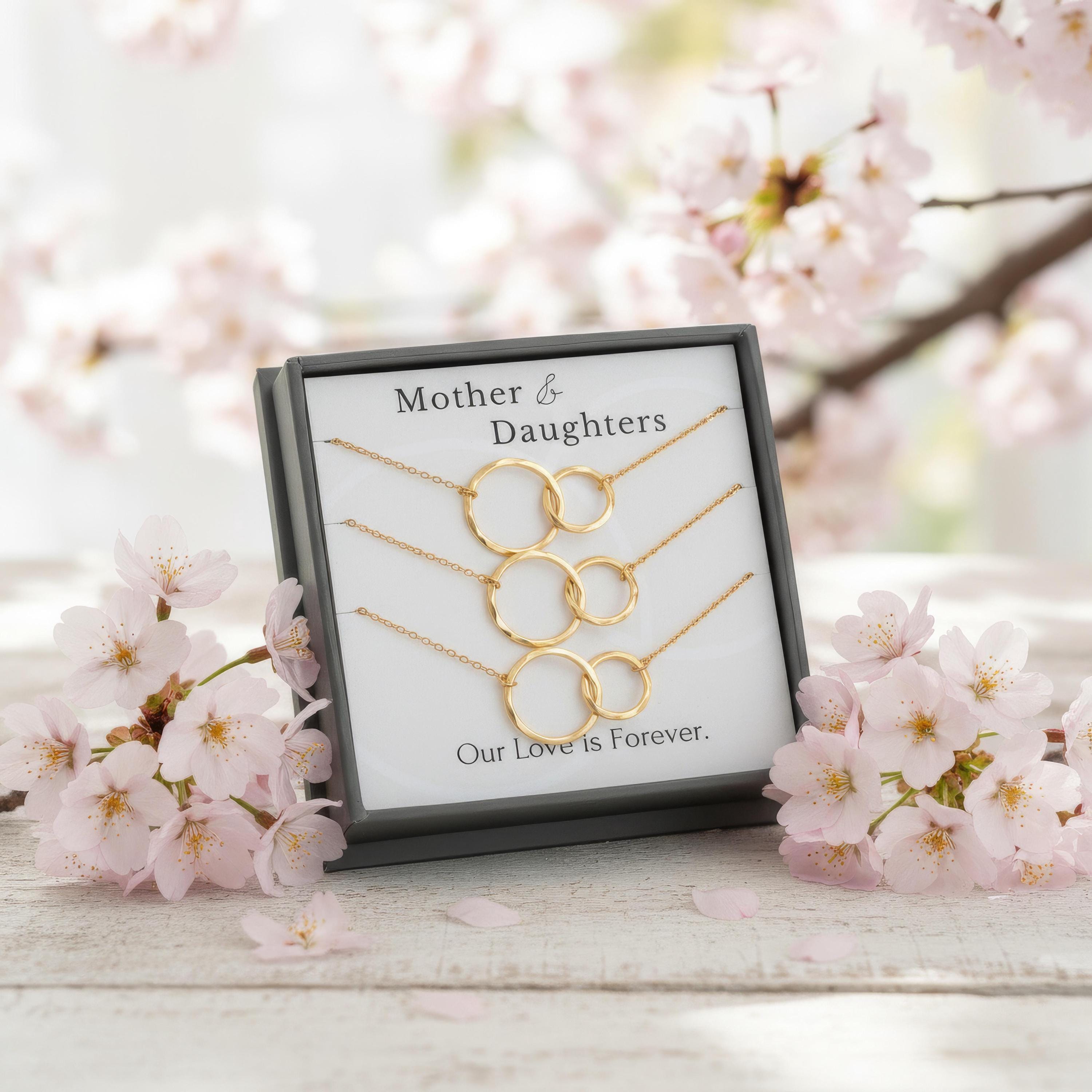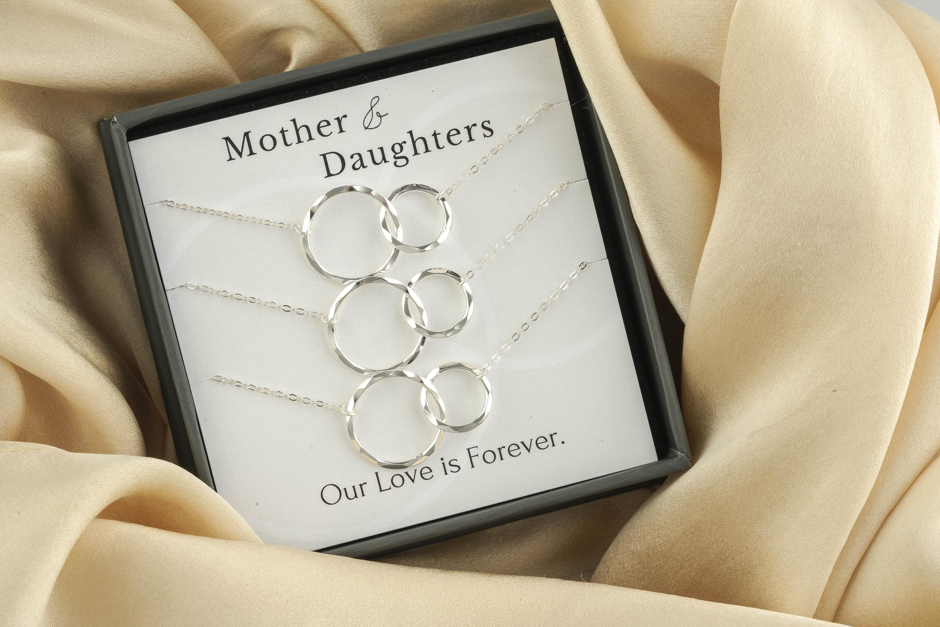 The necklace set includes 3 of 2 interlocking circles necklace representing mother and her daughters, symbolizing the unbreakable connection and love they share, a meaningful reminder of family and affection.