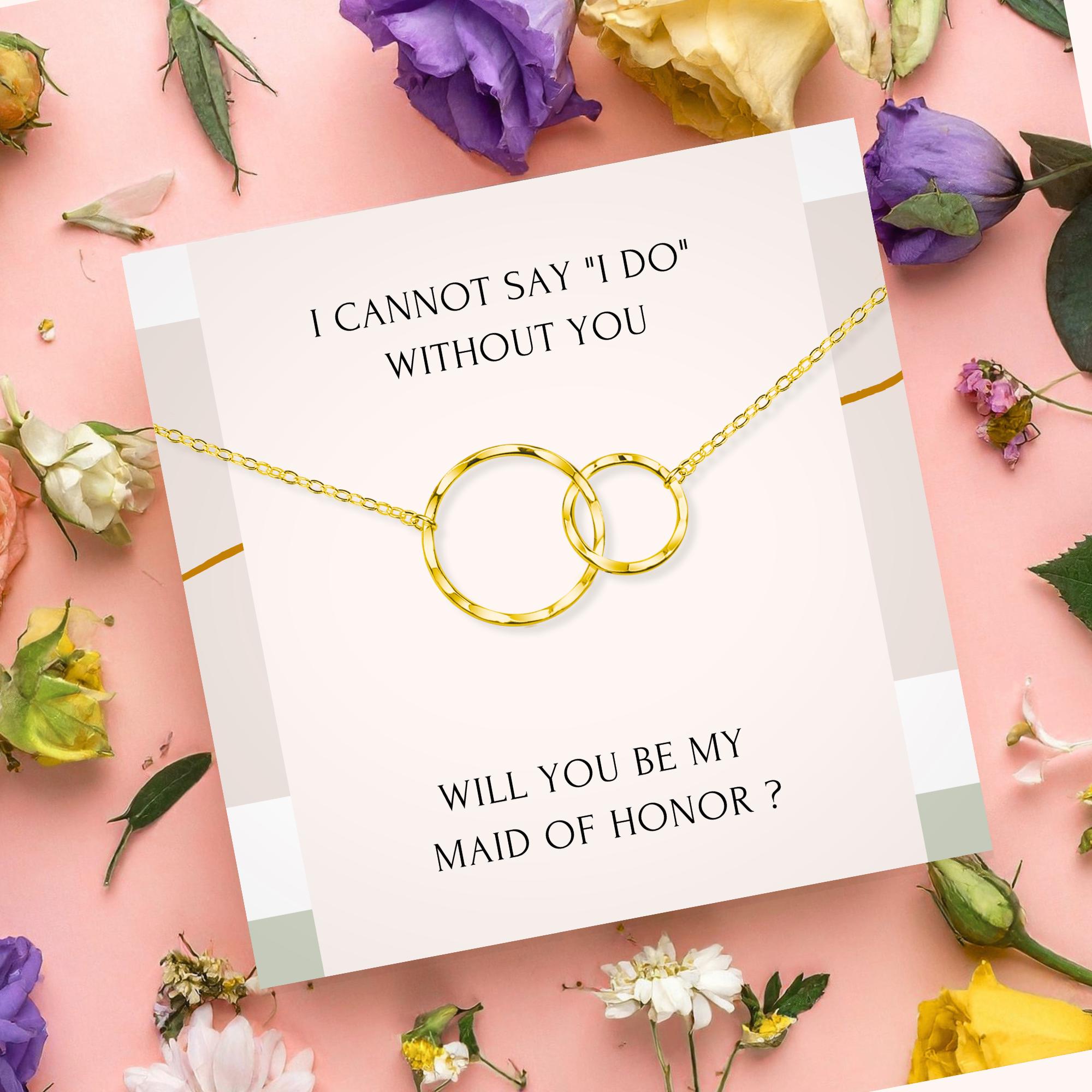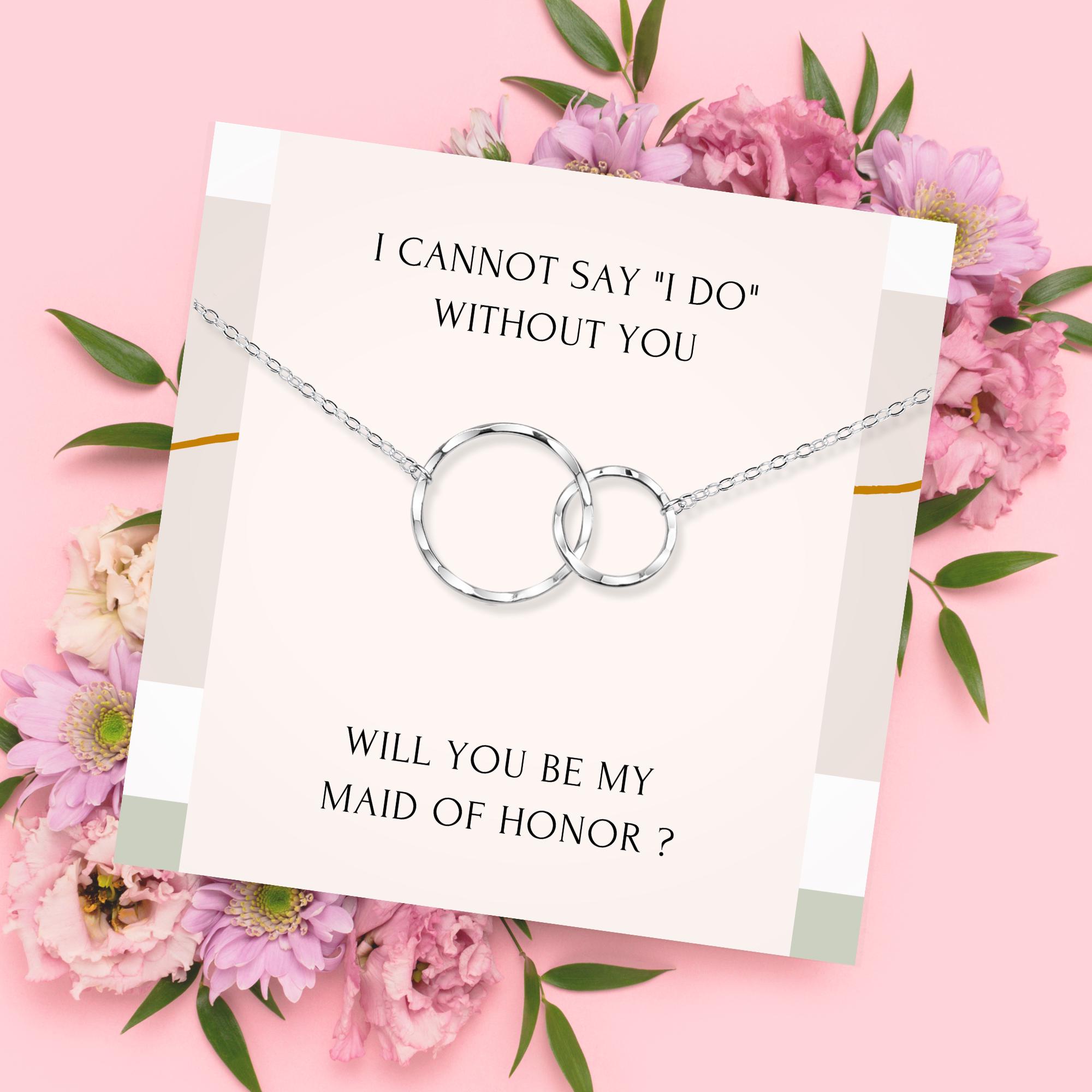 It takes a special person to stand beside you on your wedding day. If you are looking for a creative way to ask your maid of honor to be that person, look no further. Beautifully packaged with a meaningful message, this is a gift she is sure to love. With an option to choose either interlocking circles or a pearl necklace, there is something to fit every style.