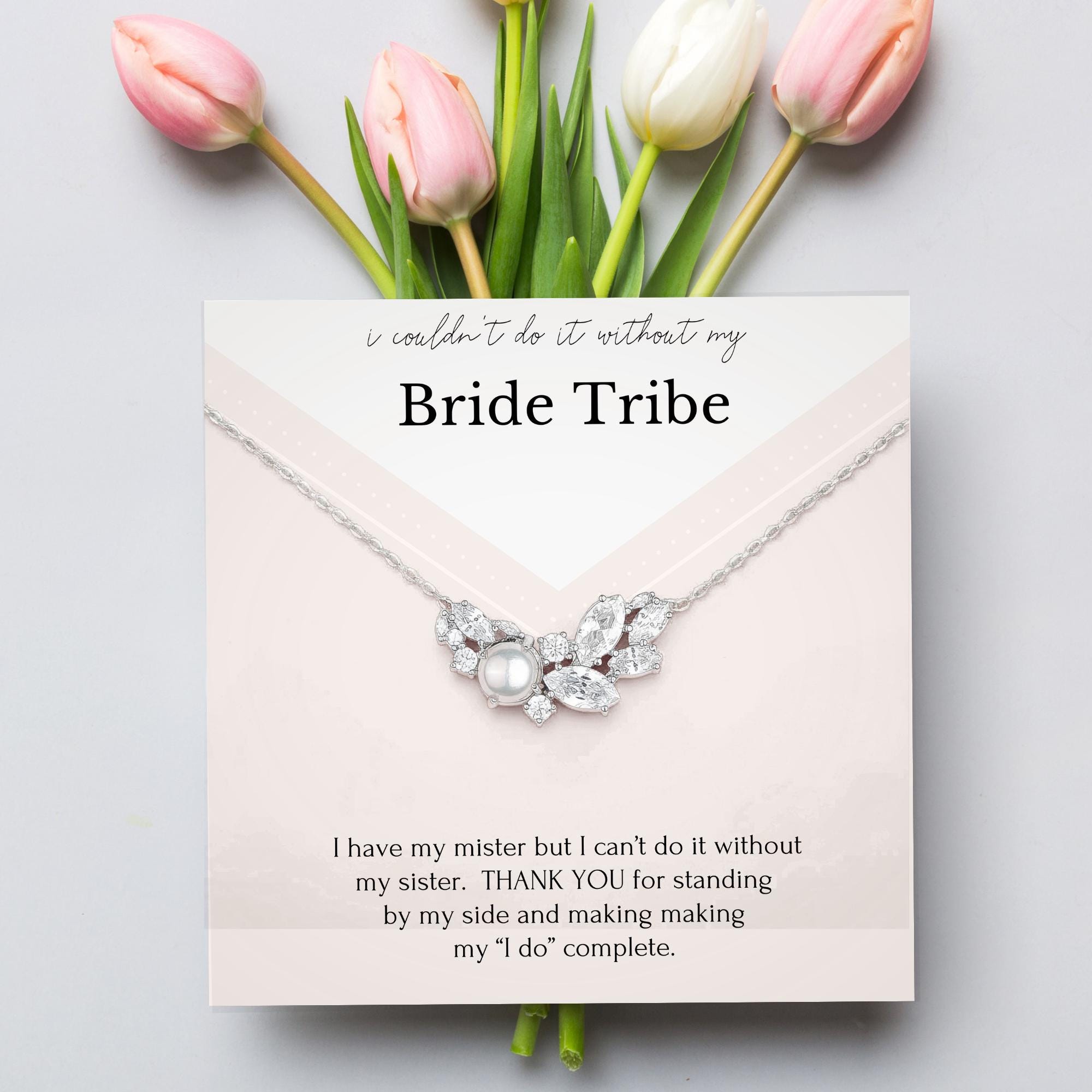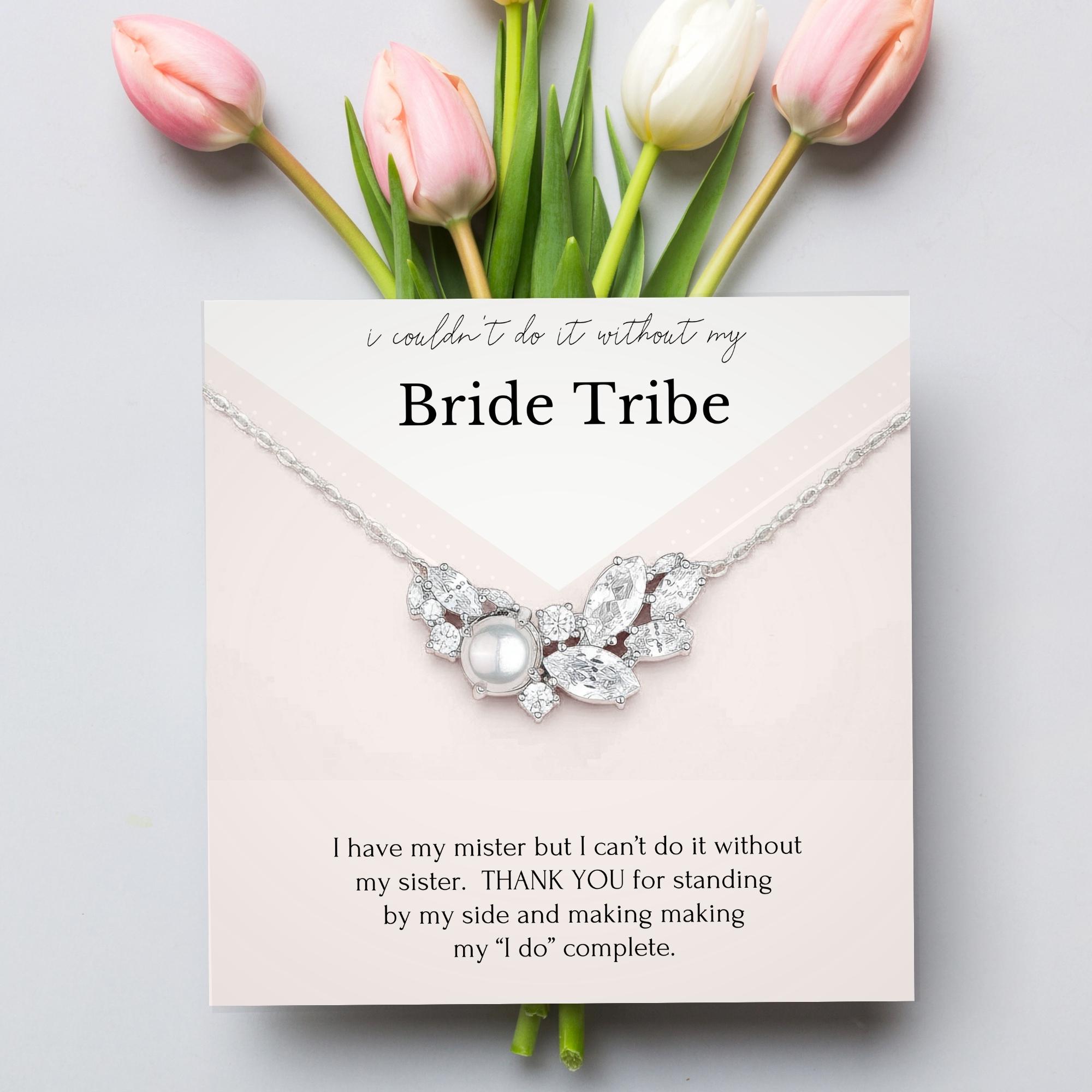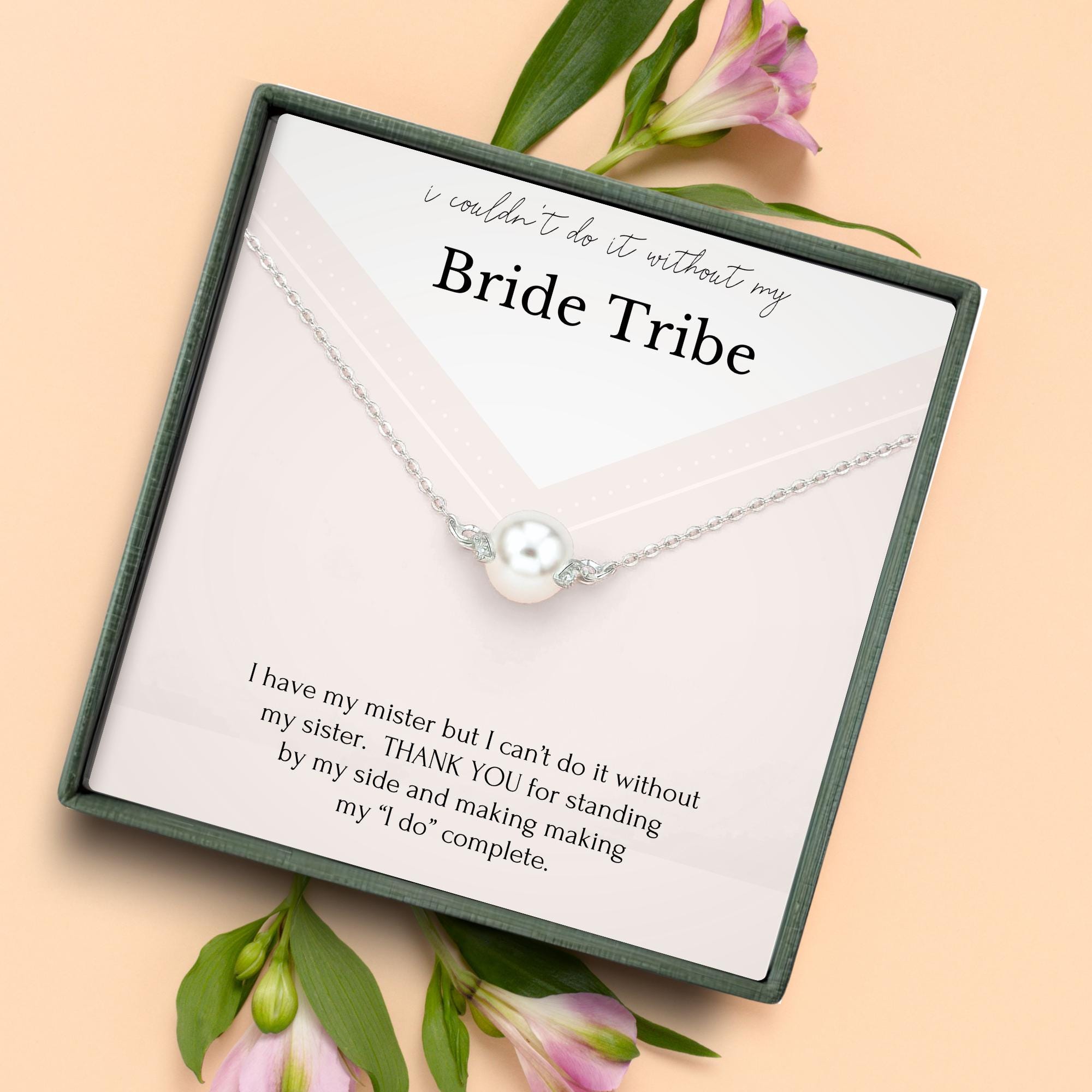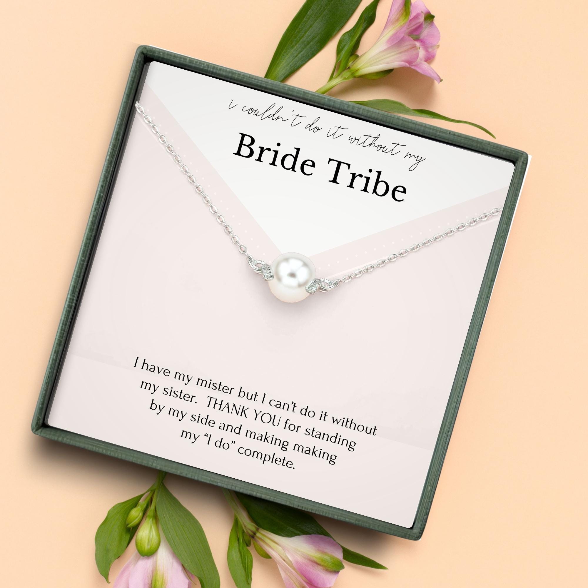 Show your “Bride Tribe” just how much they mean to you with this stunning bridesmaid gift necklace. Designed with vintage-inspired elegance, it features a clustered combination of pearls and crystals in a teardrop shape—perfectly dainty and sparkling. The included message card reads, “I have my mister but I can’t do it without my sister,” making it a heartfelt thank-you for standing by your side on your wedding day. Whether given to your maid of honor, sister, or closest friends, this sterling silver necklace arrives in a beautifully curated gift box ready to celebrate your tribe in style.