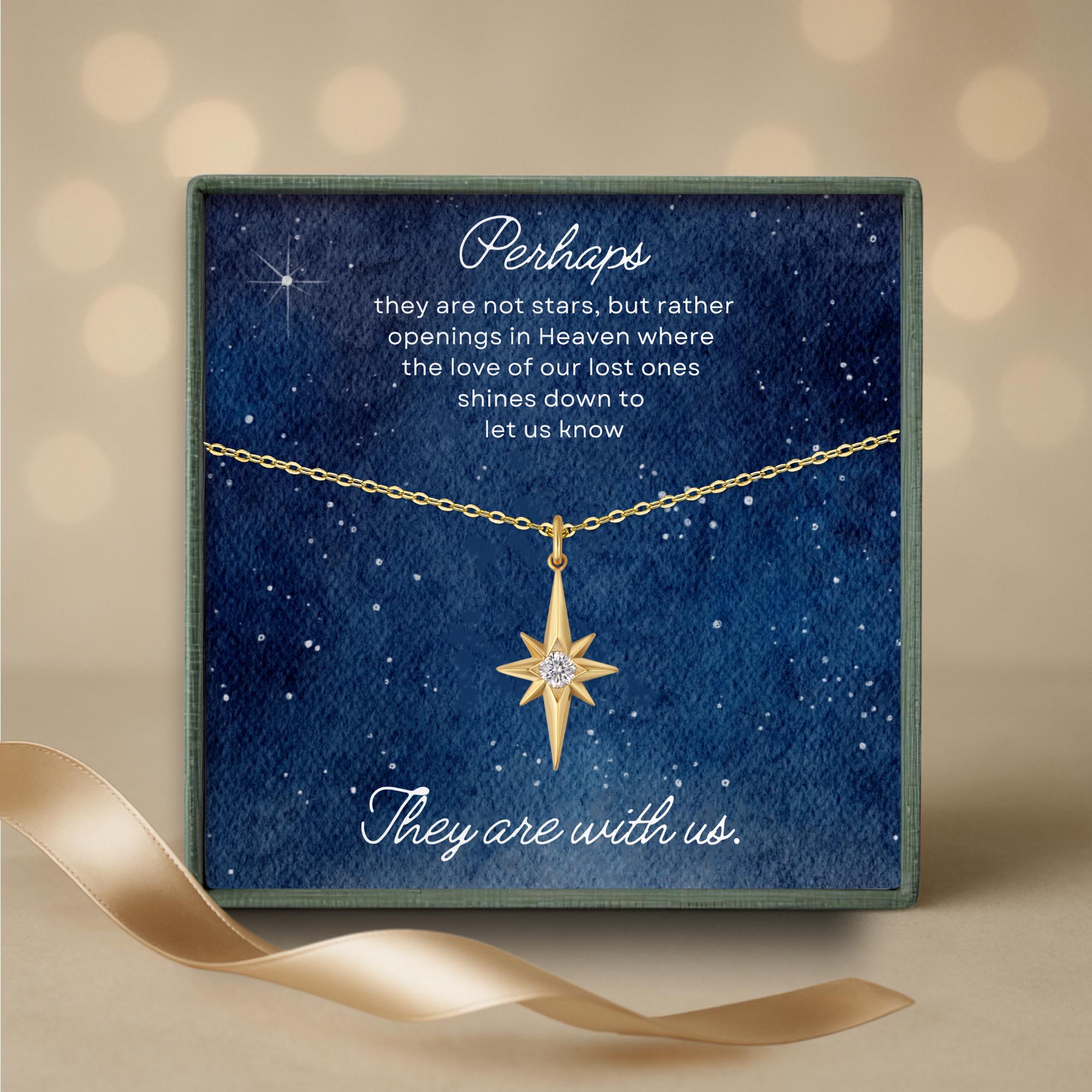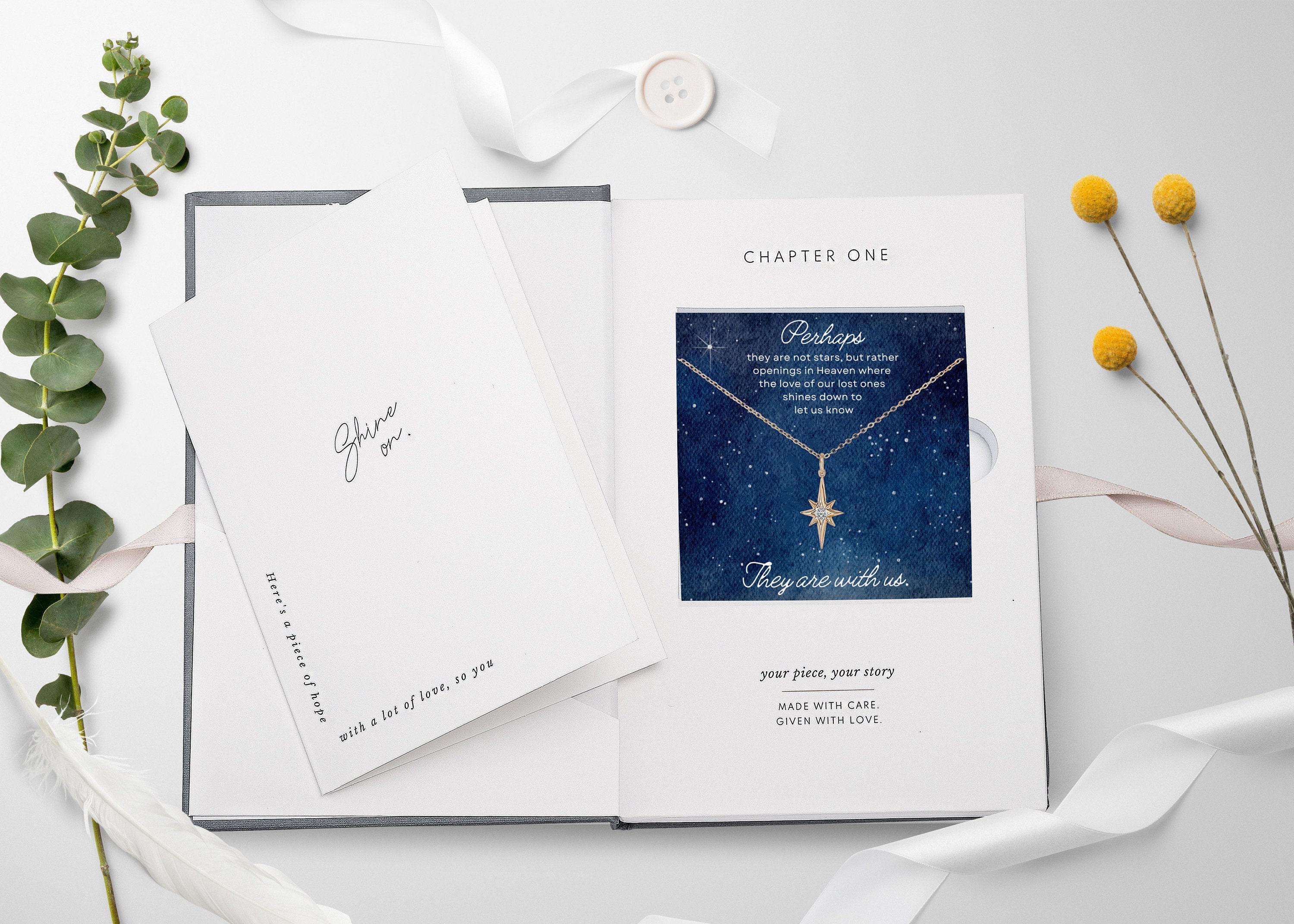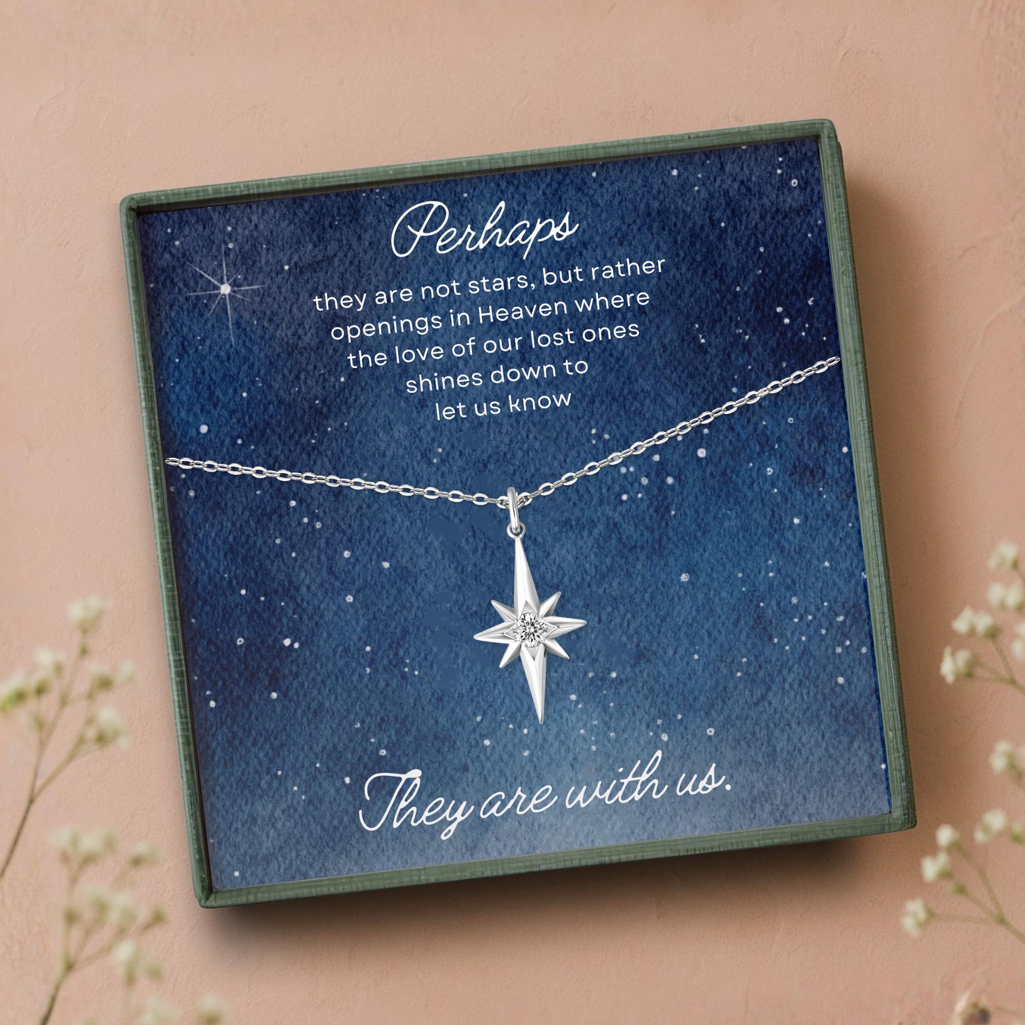 Inside this special package, you'll find a beautiful diamond north star necklace that holds deep meaning. It represents the everlasting bond we share with our loved ones, even when they're no longer physically with us.