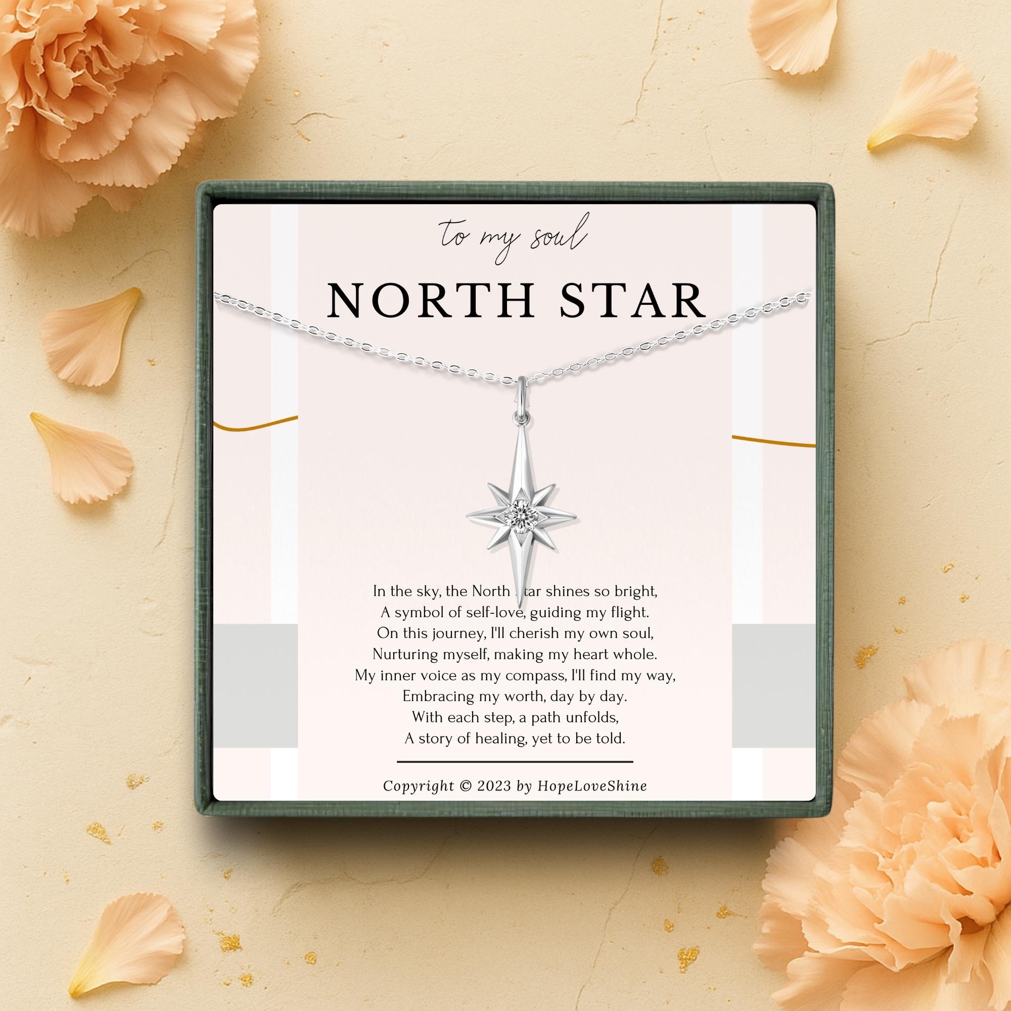 The North Star pendant serves as a constant reminder to listen to your inner voice and to believe that "I Am Enough" and "You Are Enough." This unique piece celebrates your individual journey and encourages self-love and self-care.