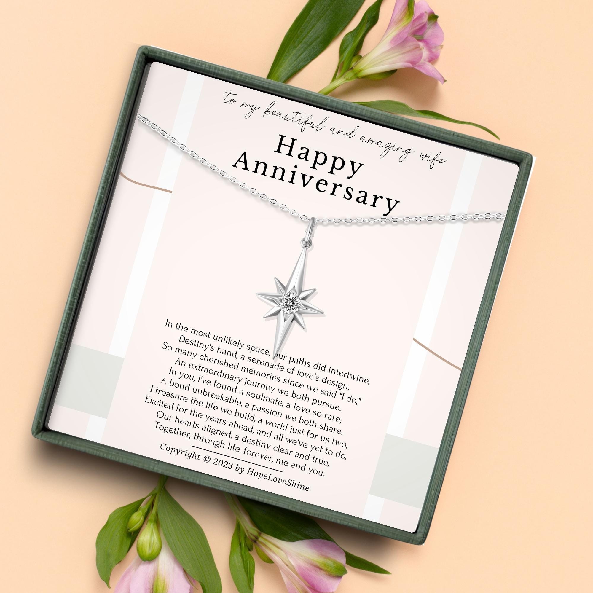 Celebrate your beautiful journey together with a meaningful anniversary gift designed for your amazing wife. This elegant North Star necklace comes with a heartfelt message that speaks of destiny, love, and the unbreakable bond you share. Perfect for a wedding anniversary, this jewelry gift is a romantic reminder of cherished memories and the extraordinary journey you’ve pursued since saying "I do." Whether it’s your 2nd, 4th, 5th, or 8th anniversary, this timeless star necklace makes a sentimental keepsake she’ll treasure. Ideal for last-minute anniversary gifts, a cotton anniversary gift with jewelry, or a thoughtful love token for your soulmate, this piece beautifully honors your love story.
