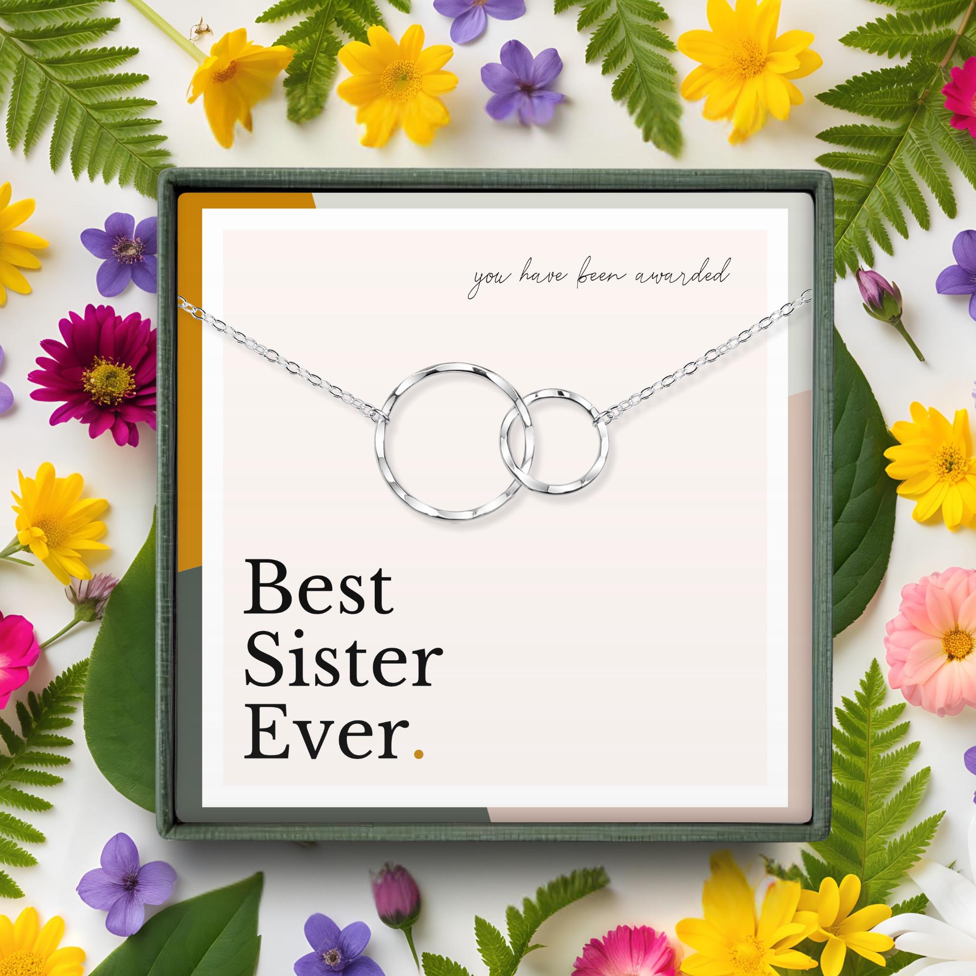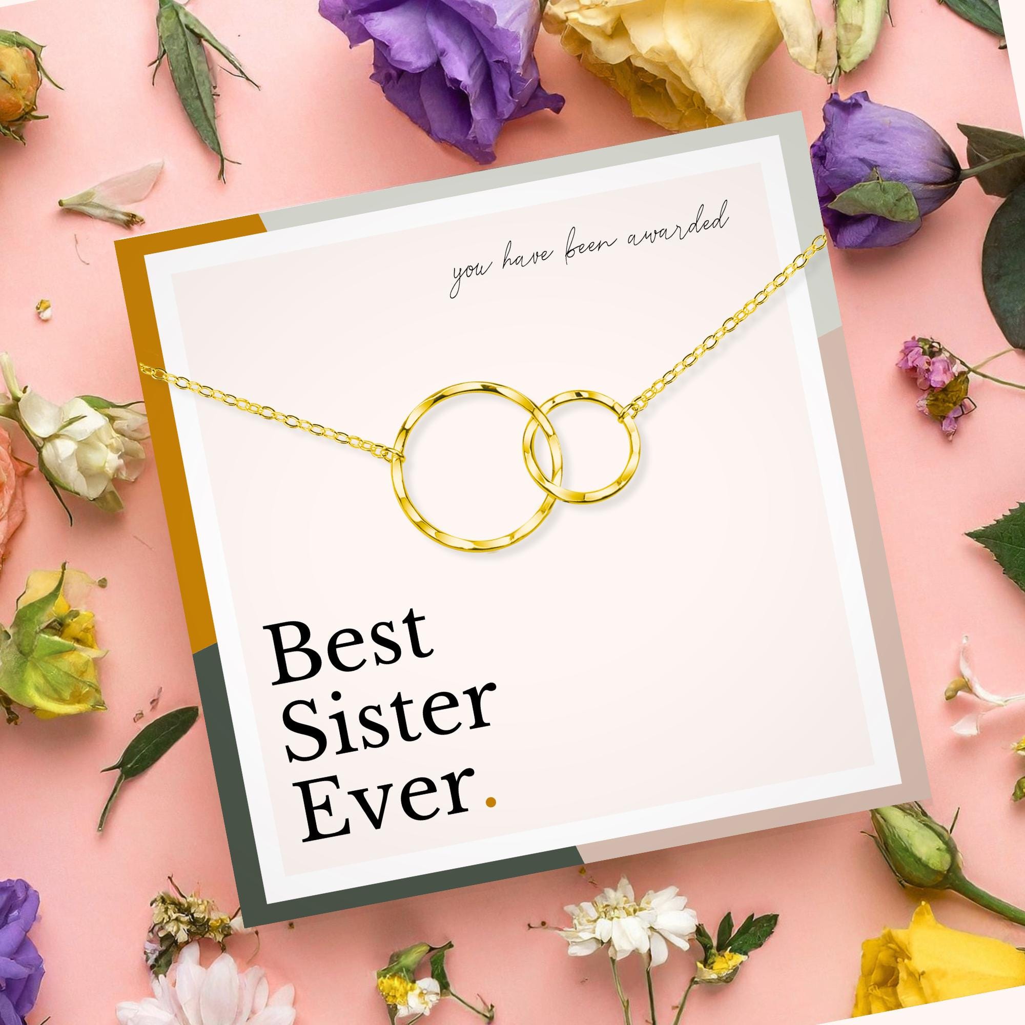 This exquisite "Best Sister Ever" gift is the perfect token of love to celebrate the bond between sisters. Our 2 interlocking circle necklace, available in sterling silver or 14k gold vermeil, is a beautiful symbol of the unbreakable connection and lifelong friendship that only sisters share.