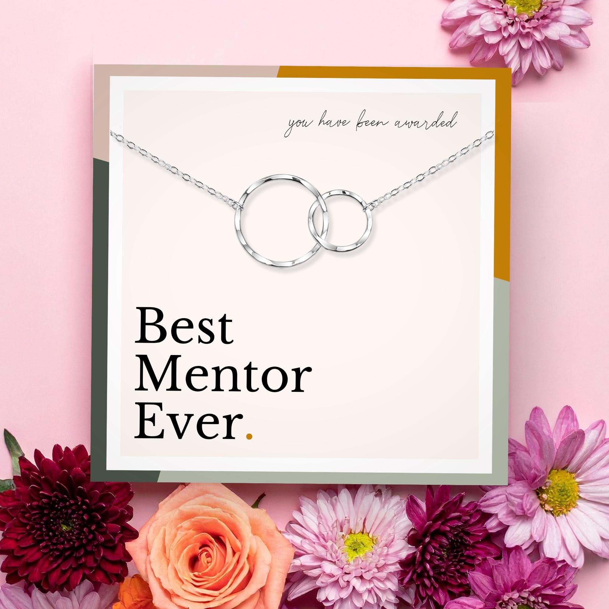 Our "Best Mentor Ever" necklace is a thoughtful and inspirational thank you gift that beautifully symbolizes the unbreakable bond between mentor and mentee. This necklace features two interlocking circles, representing the power of learning and growth that comes from a great mentorship.