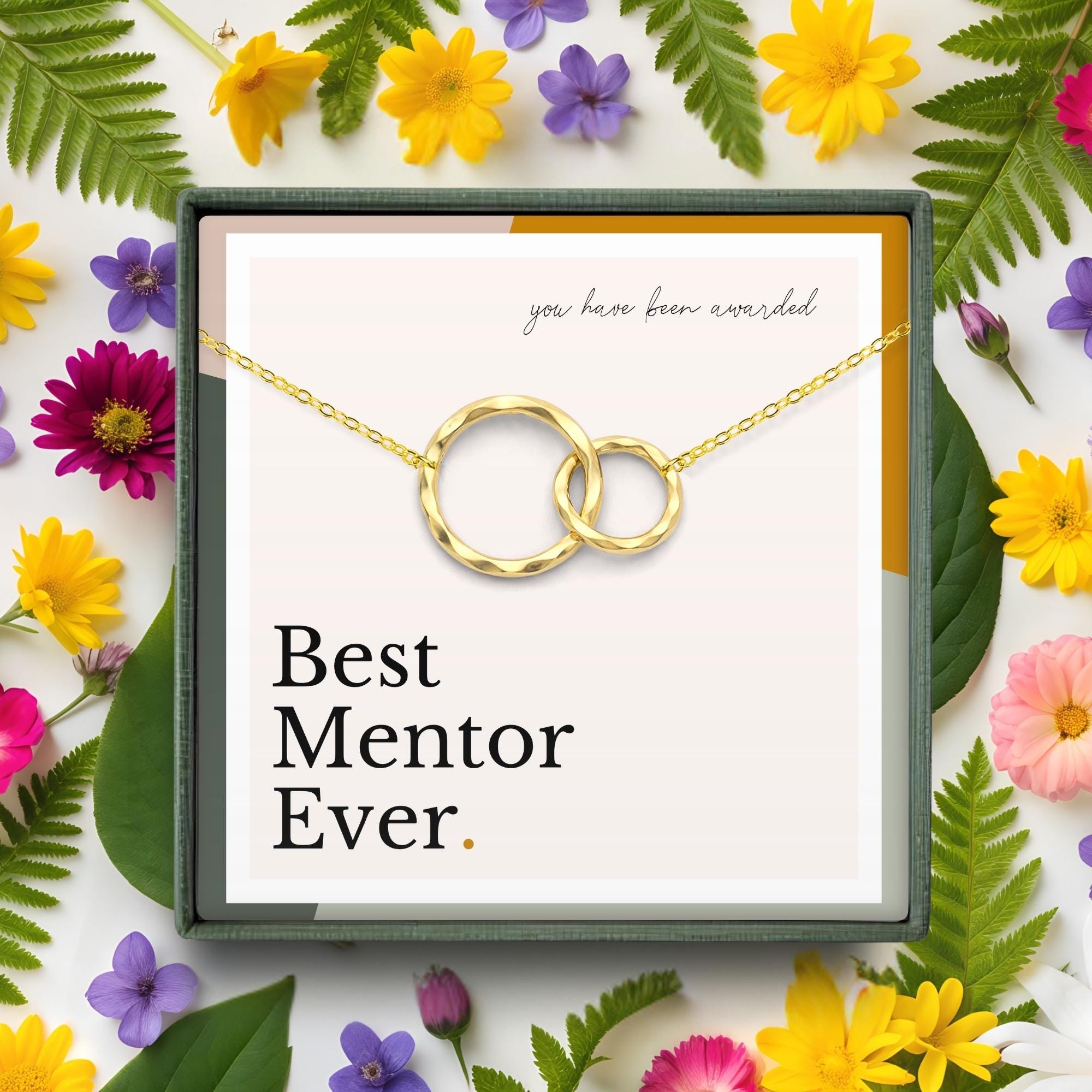 Our "Best Mentor Ever" necklace is a thoughtful and inspirational thank you gift that beautifully symbolizes the unbreakable bond between mentor and mentee. This necklace features two interlocking circles, representing the power of learning and growth that comes from a great mentorship.