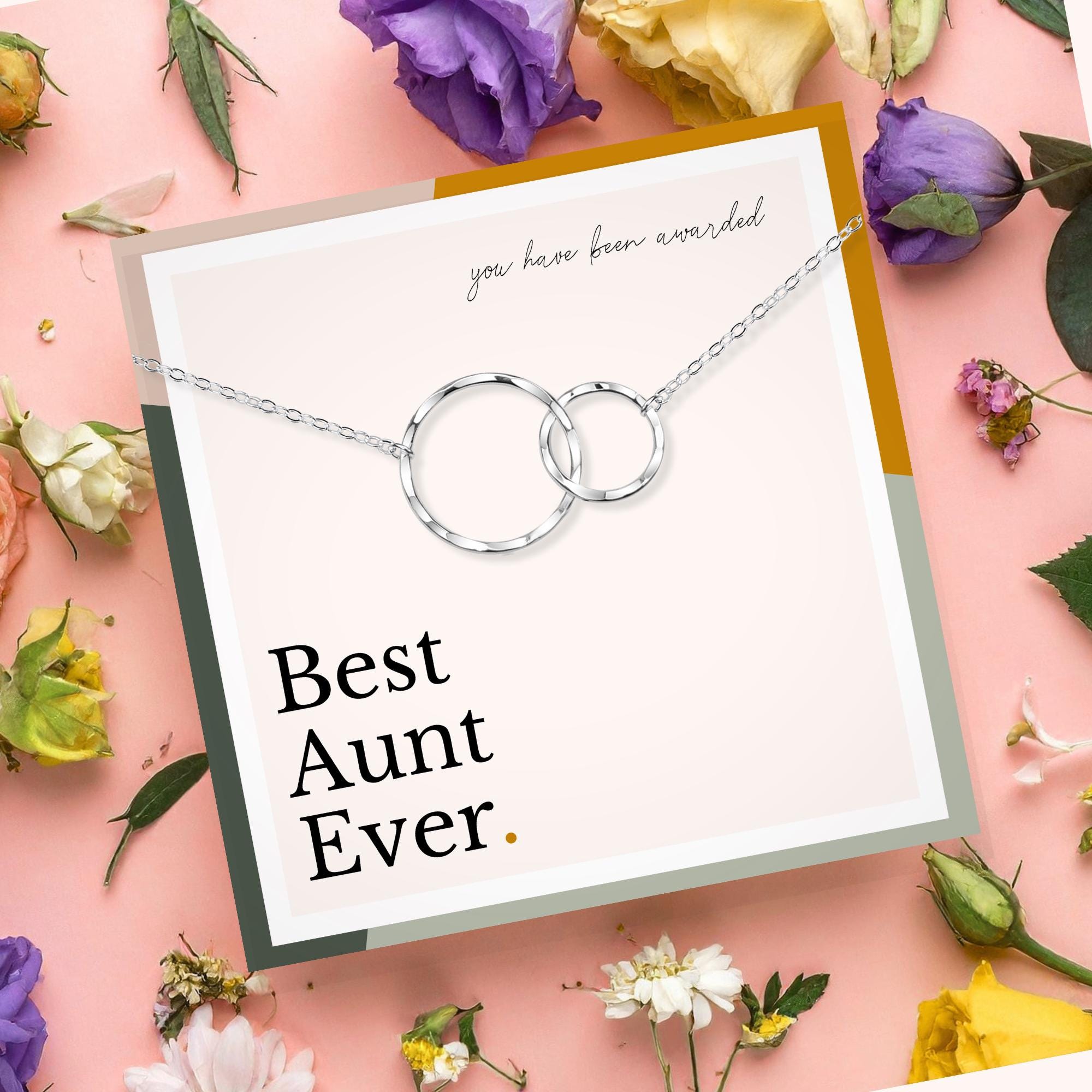 If you're looking for the ideal way to celebrate the special aunt in your life, our "Best Aunt Ever" interlocking circle necklace is a perfect choice. This unique piece of jewelry is not just an adornment, but a symbol of the unbreakable bond that exists between you and your beloved aunt.