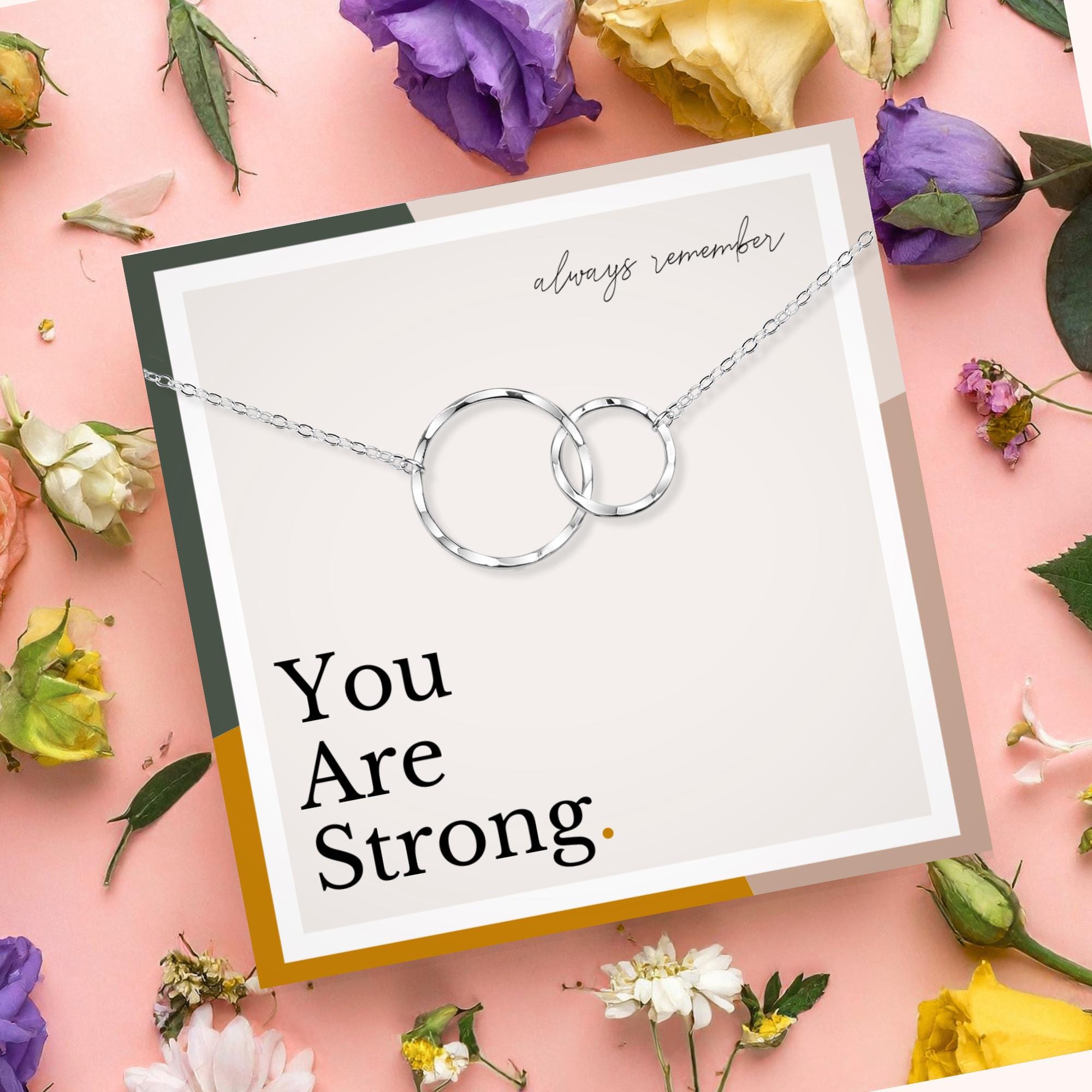 Our interlocking circles necklace symbolizes a fresh start and the strength to overcome obstacles. It serves as a constant reminder of strength, courage, and resilience. This necklace makes a perfect encouragement gift for women going through significant life changes.