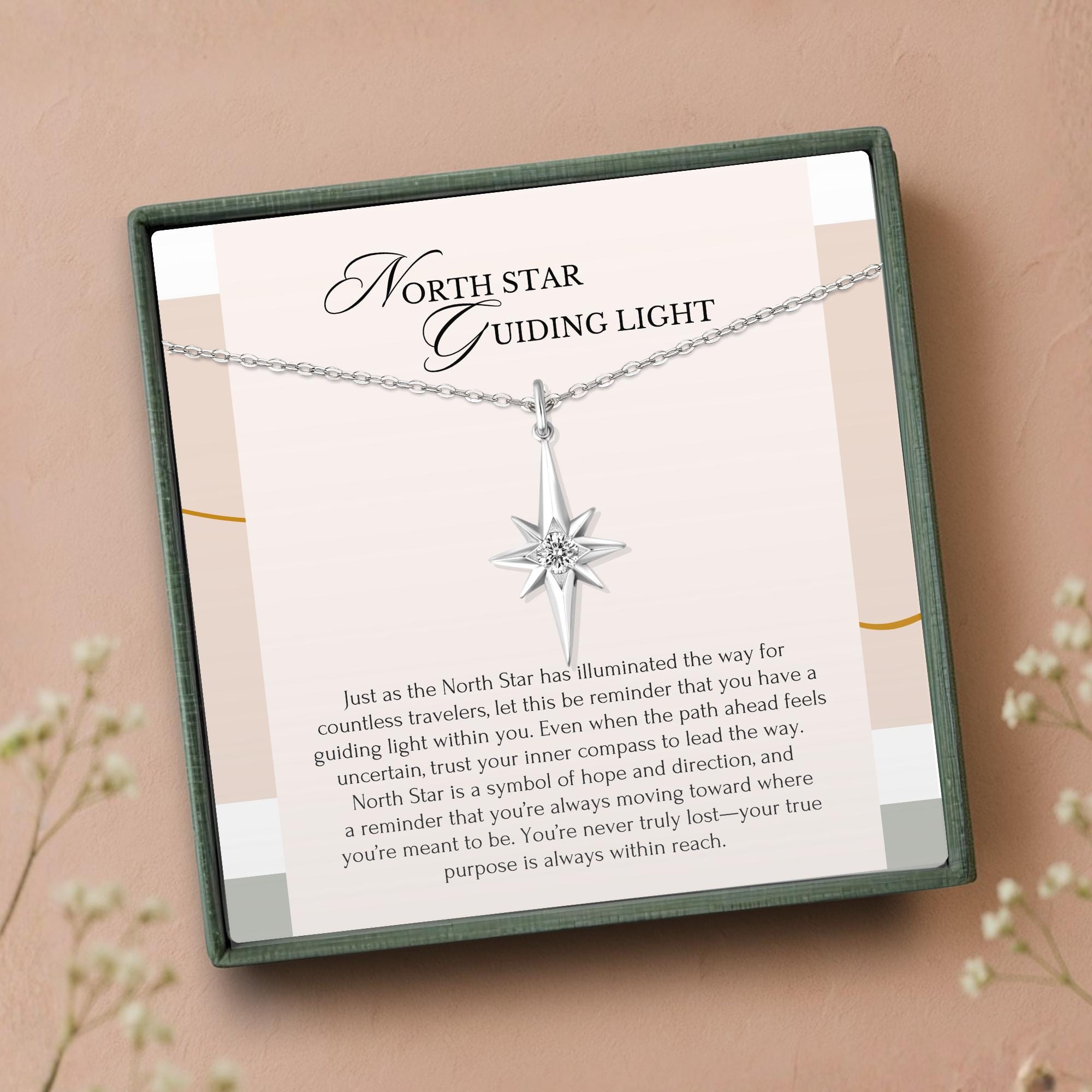 This silver North Star guiding light necklace symbolizes hope and direction, a reminder to trust your inner compass. A meaningful gift for new journeys or daily inspiration.
