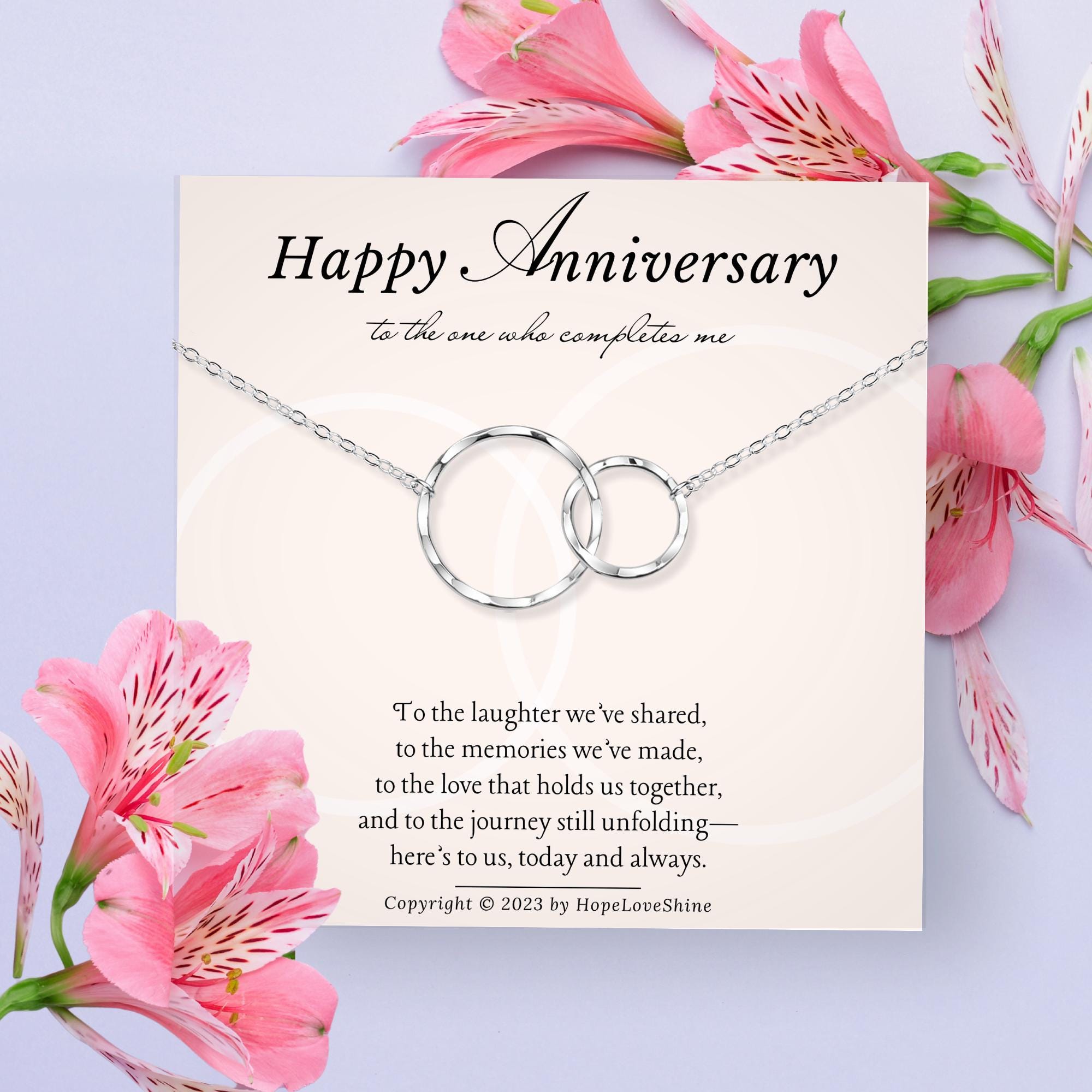 Celebrate your journey together with this beautifully minimalist interlocking circle necklace—a heartfelt anniversary gift for the one who completes you. Featuring two elegant rings linked in unity, this necklace symbolizes the bond you share and the life you’ve built together. Paired with a touching card that honors laughter, memories, and the love that endures through every season, it’s the perfect way to say “here’s to us, today and always.” Whether you’re celebrating your 1st anniversary or 50th, this necklace offers a timeless and emotional reminder of your connection. Ideal for husbands searching for a romantic, meaningful gift for their wife on an anniversary, Valentine’s Day, or just because.