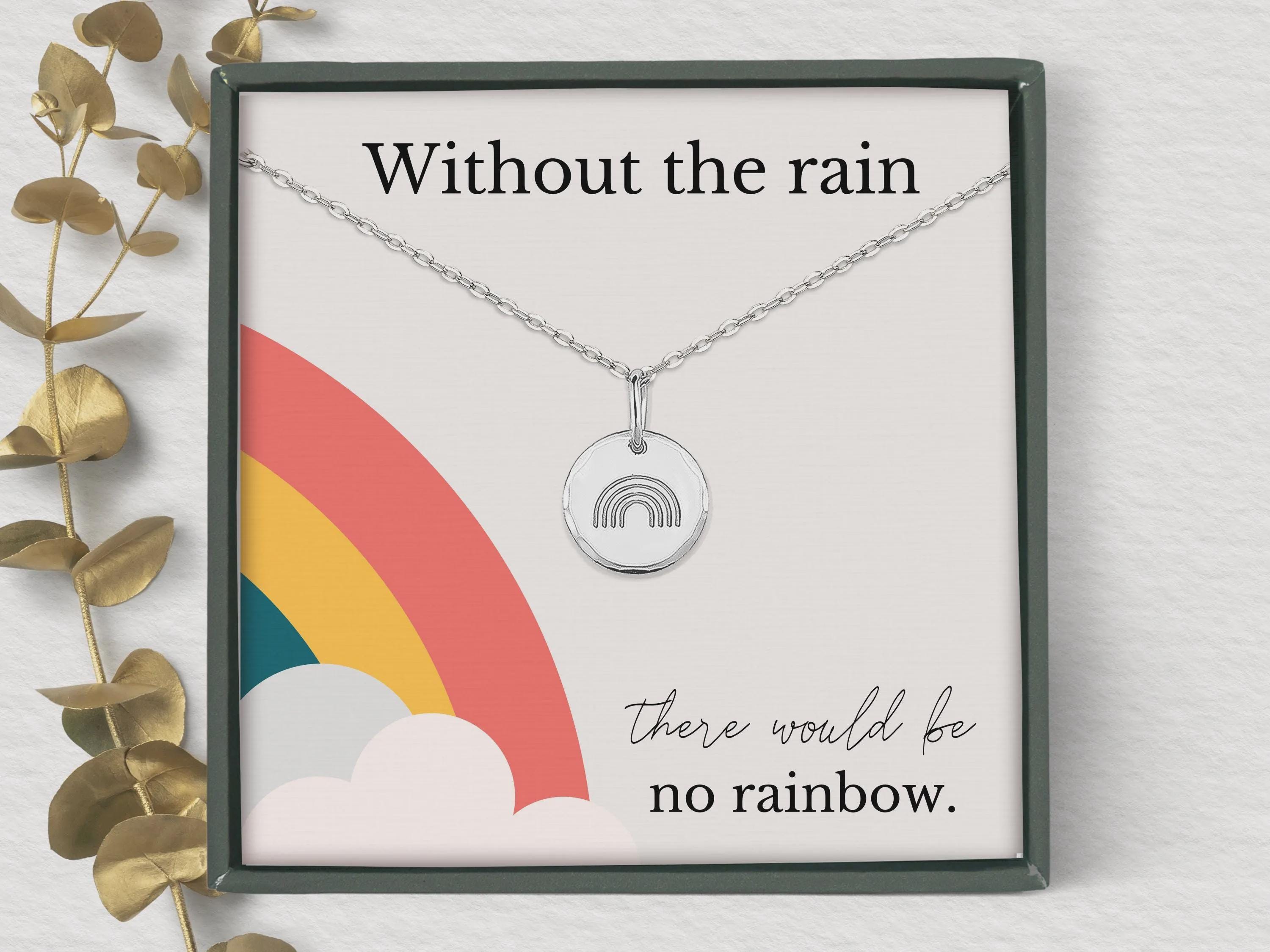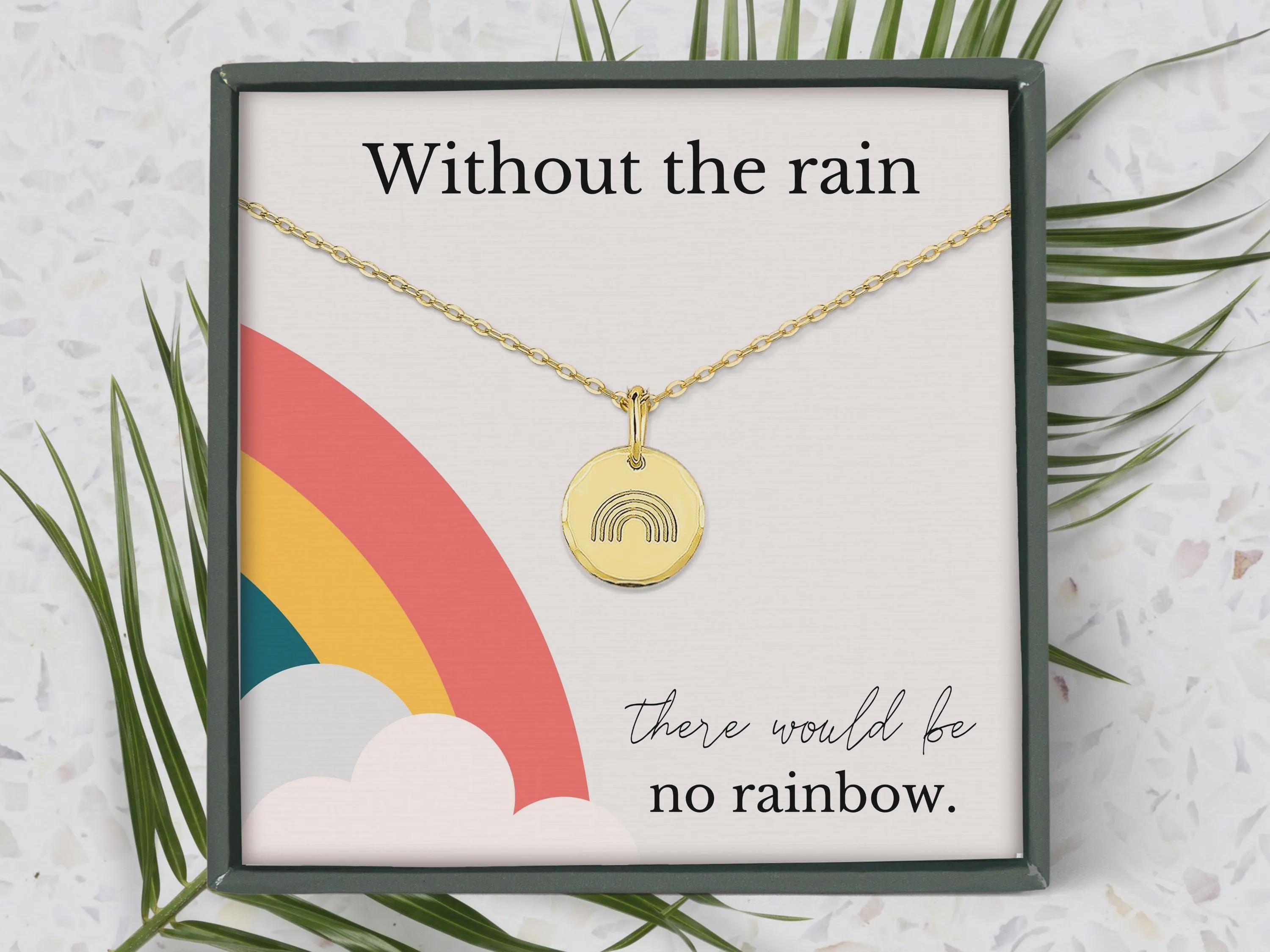 Celebrate strength and hope with this Rainbow Gold Necklace—perfectly embodying the inspiring message that “without the rain there would be no rainbow.” Featuring a delicate gold chain and a charming multi-colored rainbow pendant, this encouragement gift for women serves as a daily reminder of resilience and positivity. Its subtle shine and thoughtful design set it apart from ordinary jewelry, making it a meaningful accessory for anyone facing life’s challenges.