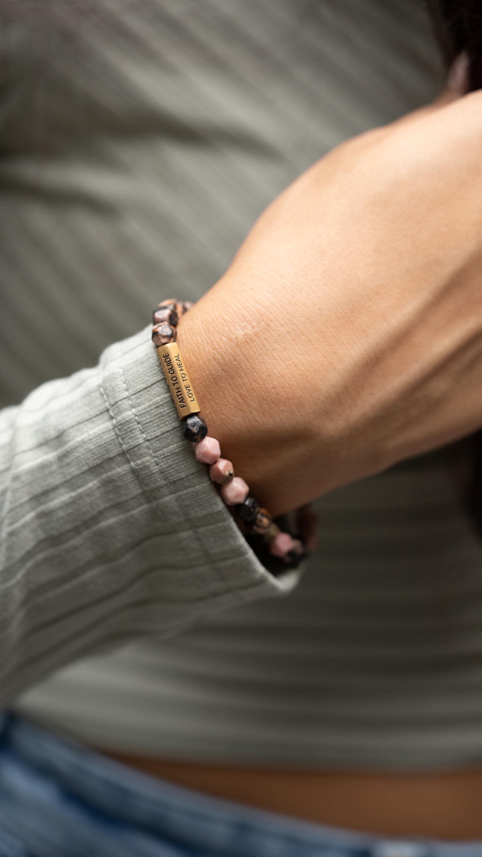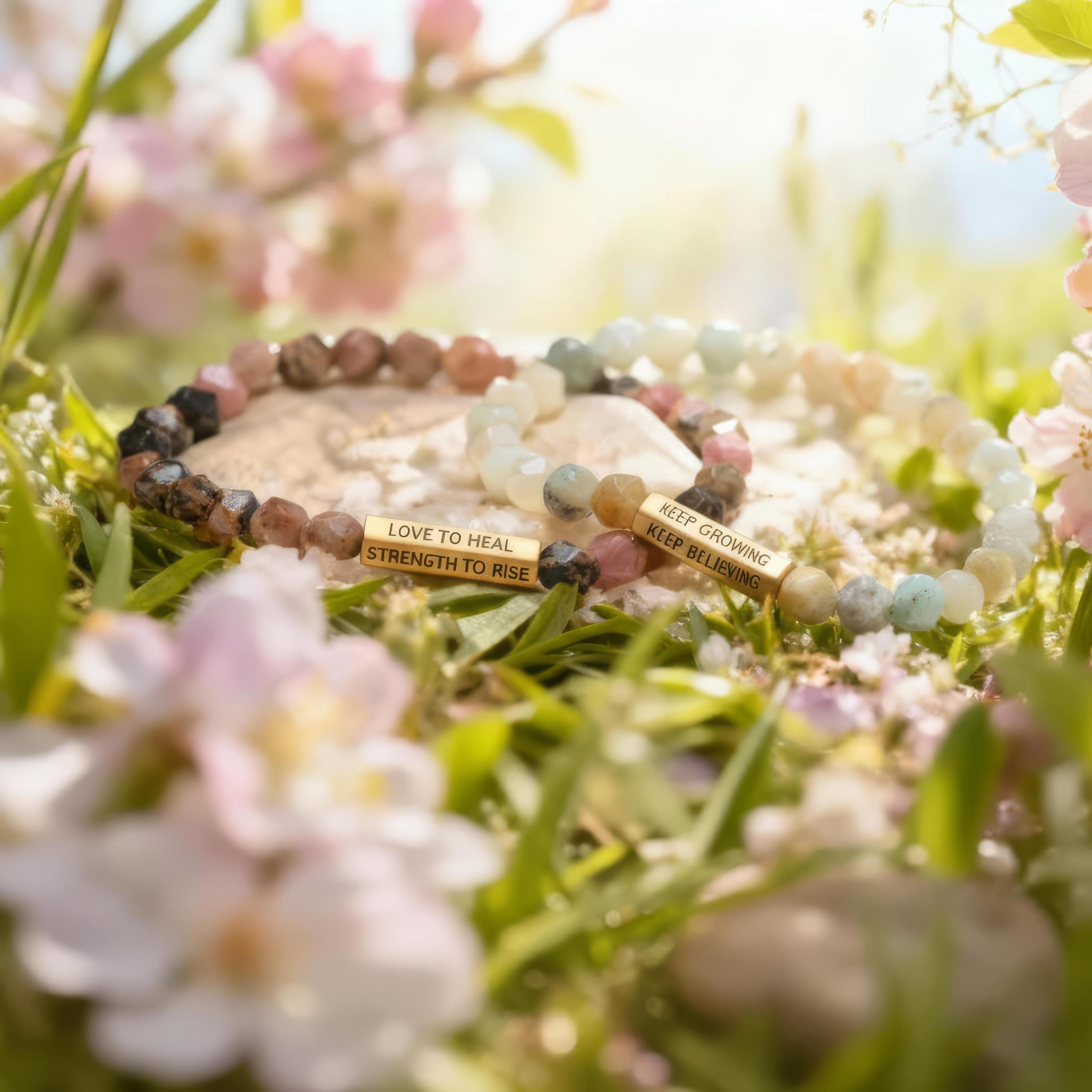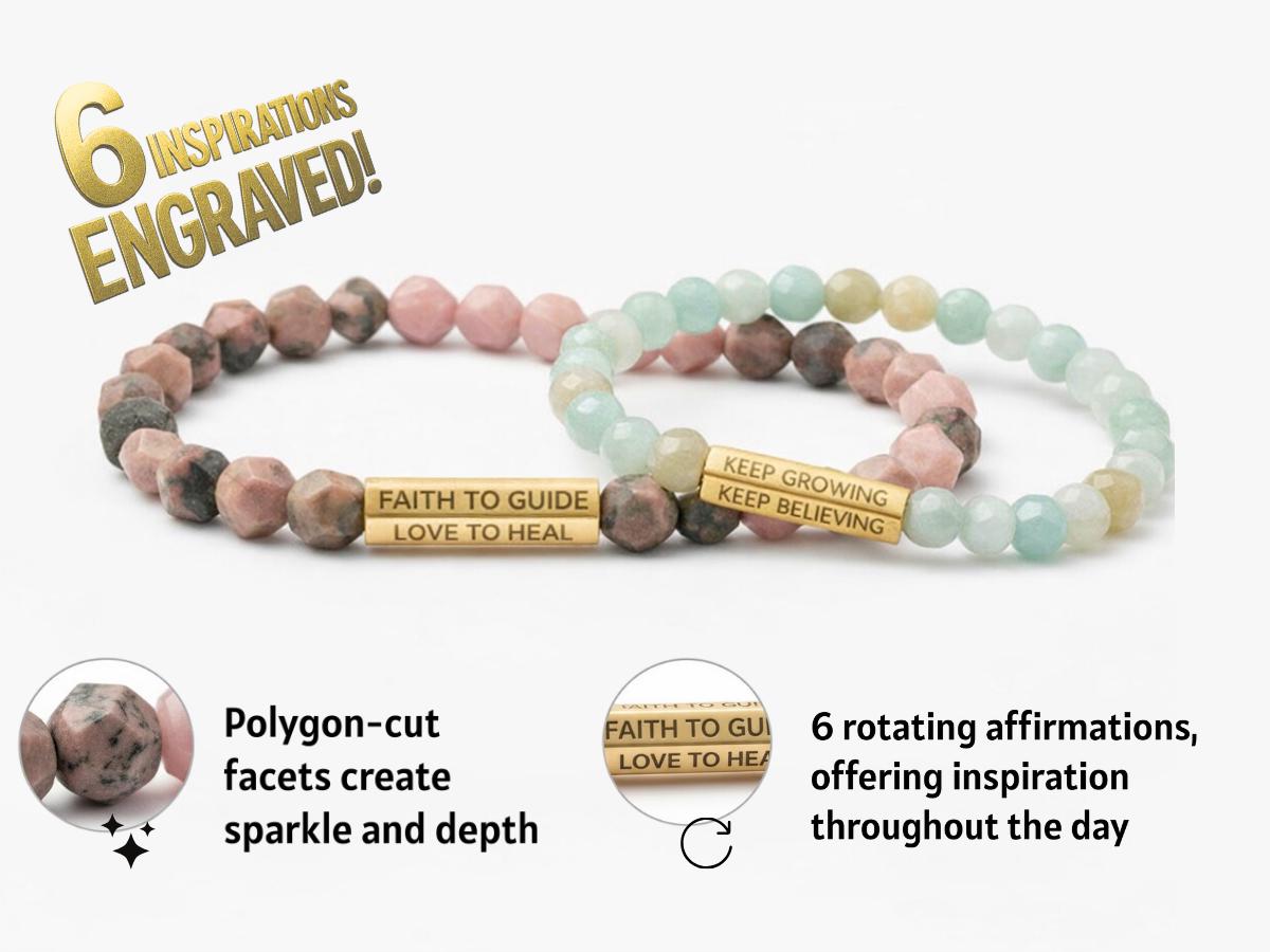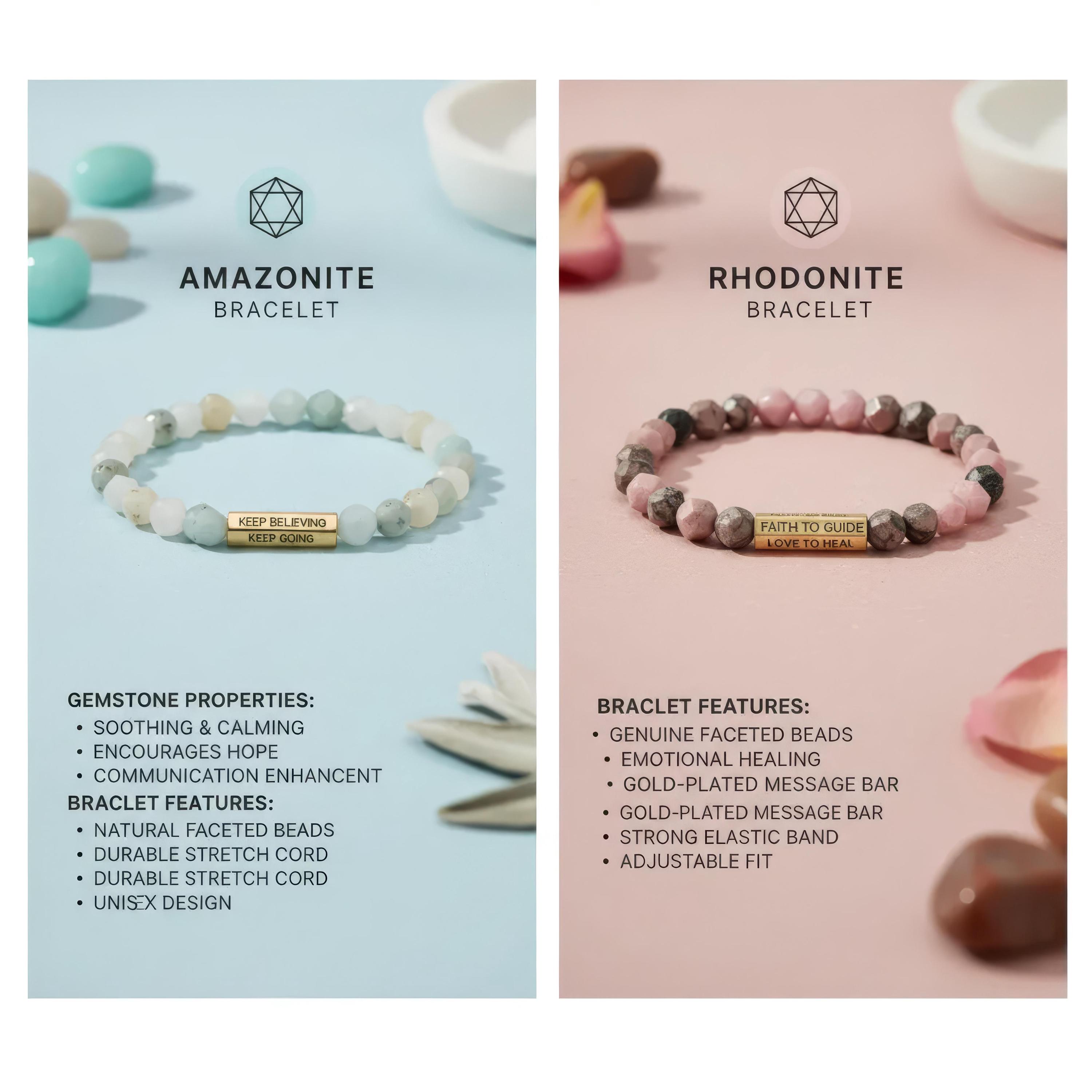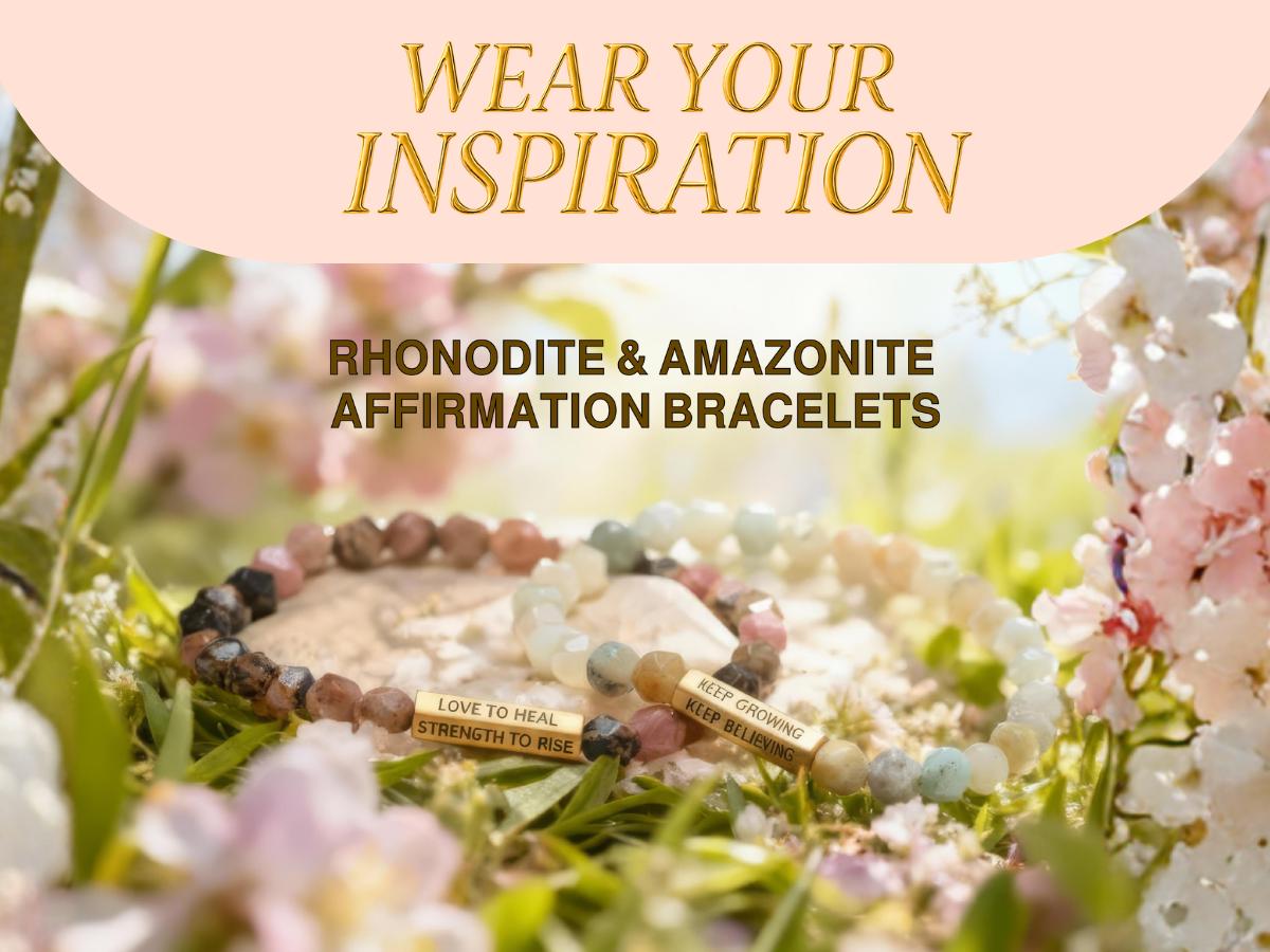 These affirmation gemstone bracelets pair natural faceted stones with a gold-tone engraved bar - designed to bring encouragement, strength, and grounding to your everyday routine. Choose from Amazonite for calm, clarity, and courage, or Rhodonite for heart-healing, harmony, and emotional balance.