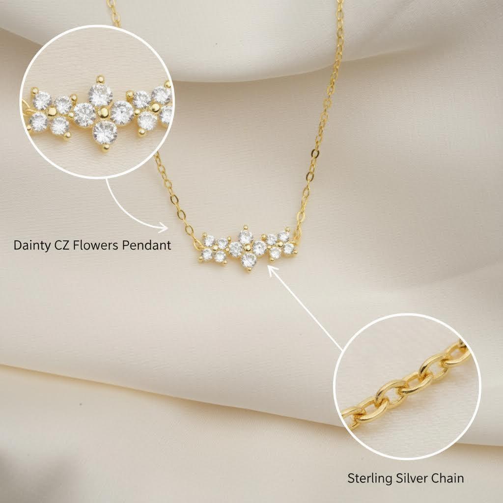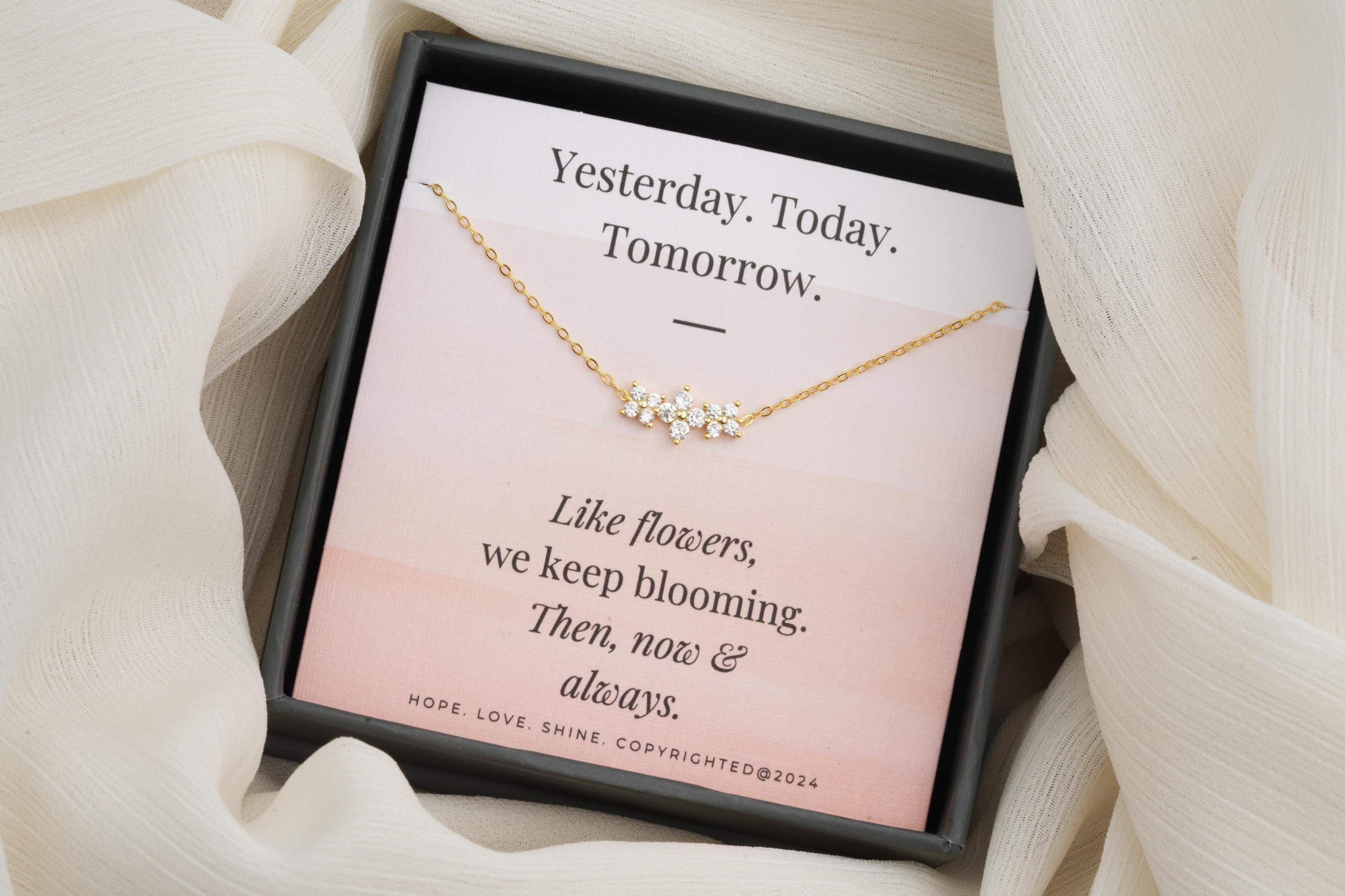 Celebrate the special bond of sisterhood with this delicate and charming Dainty 3 Flower Necklace Pendant, expertly crafted from gold plated sterling silver. Featuring three beautifully detailed flowers symbolizing Yesterday, Today, and Tomorrow, this piece is a meaningful keepsake perfect for everyday wear or as a heartfelt gift for your favorite sister, whether for birthdays, graduations, weddings, or just because.