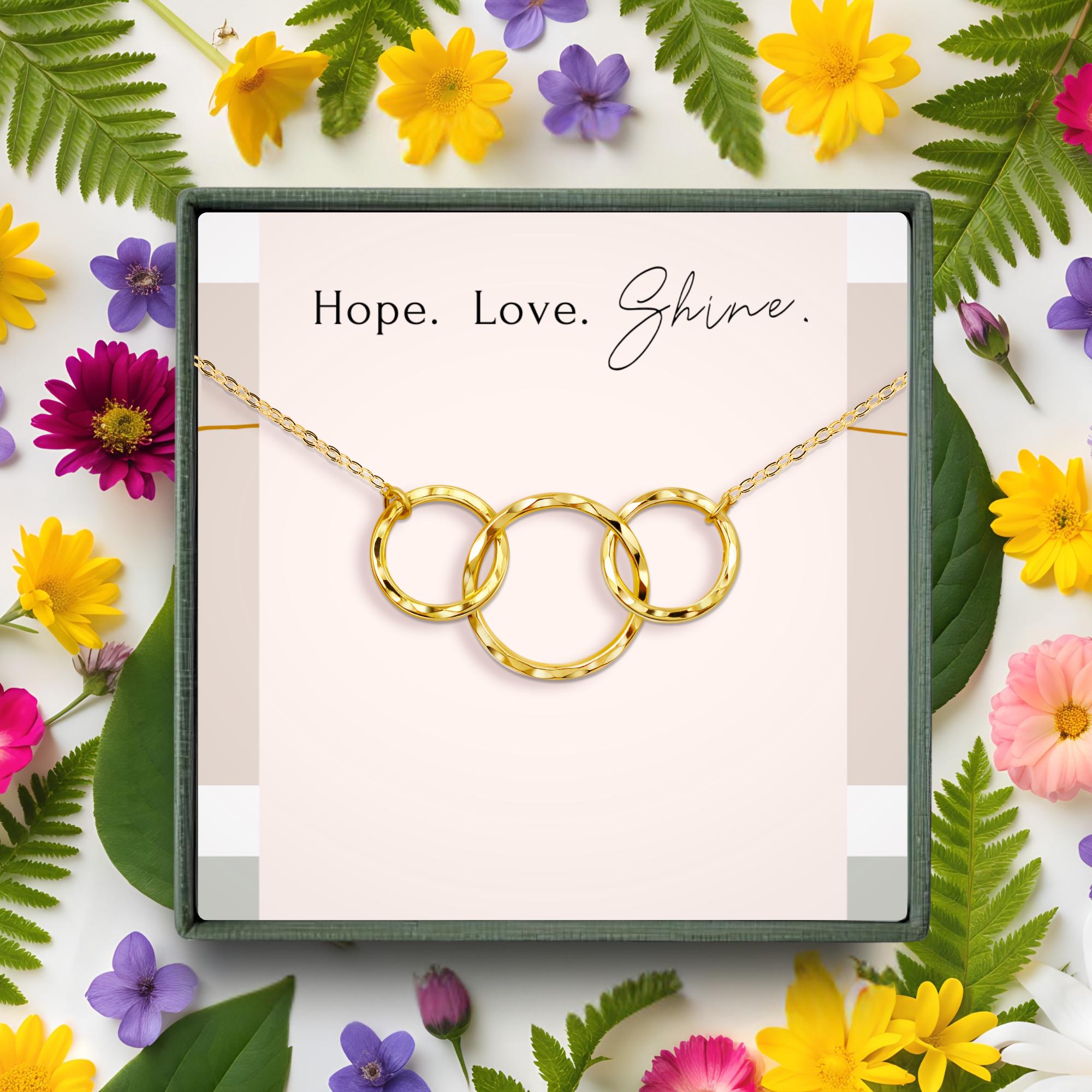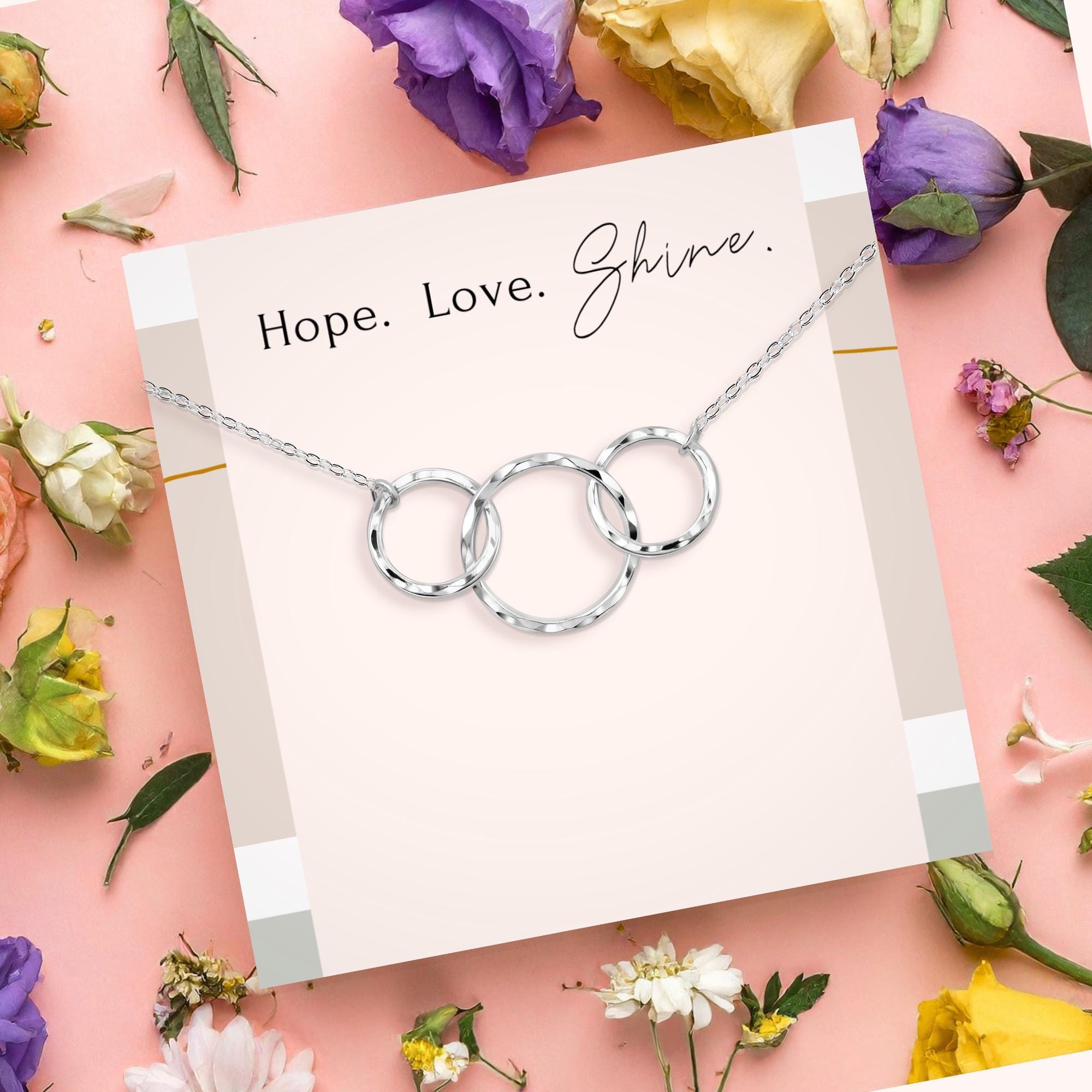This elegant necklace features three hand-interlocking rings that are hand-textured to create a uniquely hammered finish. No two necklaces are exactly alike - giving you a truly one-of-a-kind piece of wearable art.