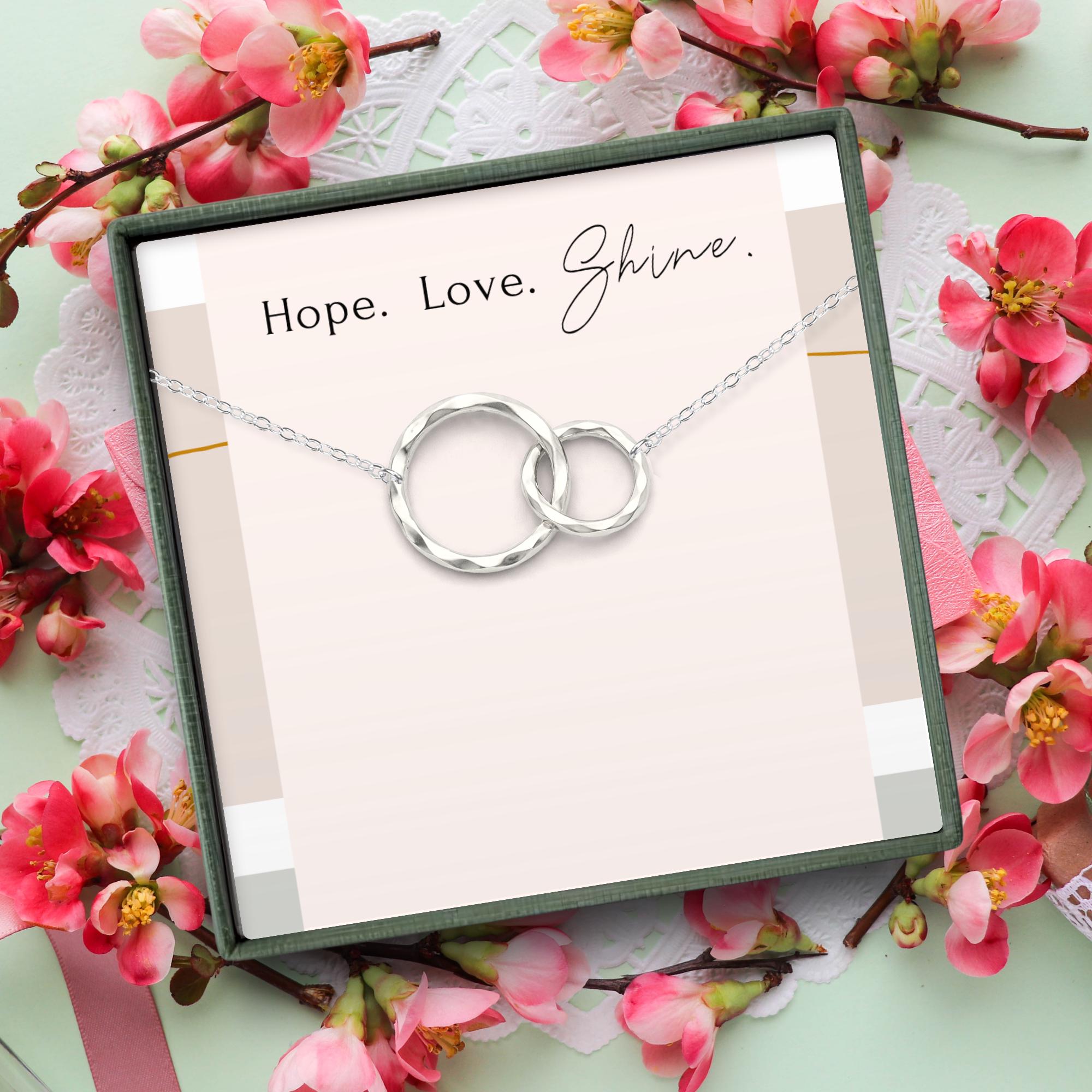 This elegant necklace features two interlocking rings, each meticulously hand-textured to create a stunning hammered finish. Because every piece is textured by hand, your necklace will have its own unique character and organic shimmer.