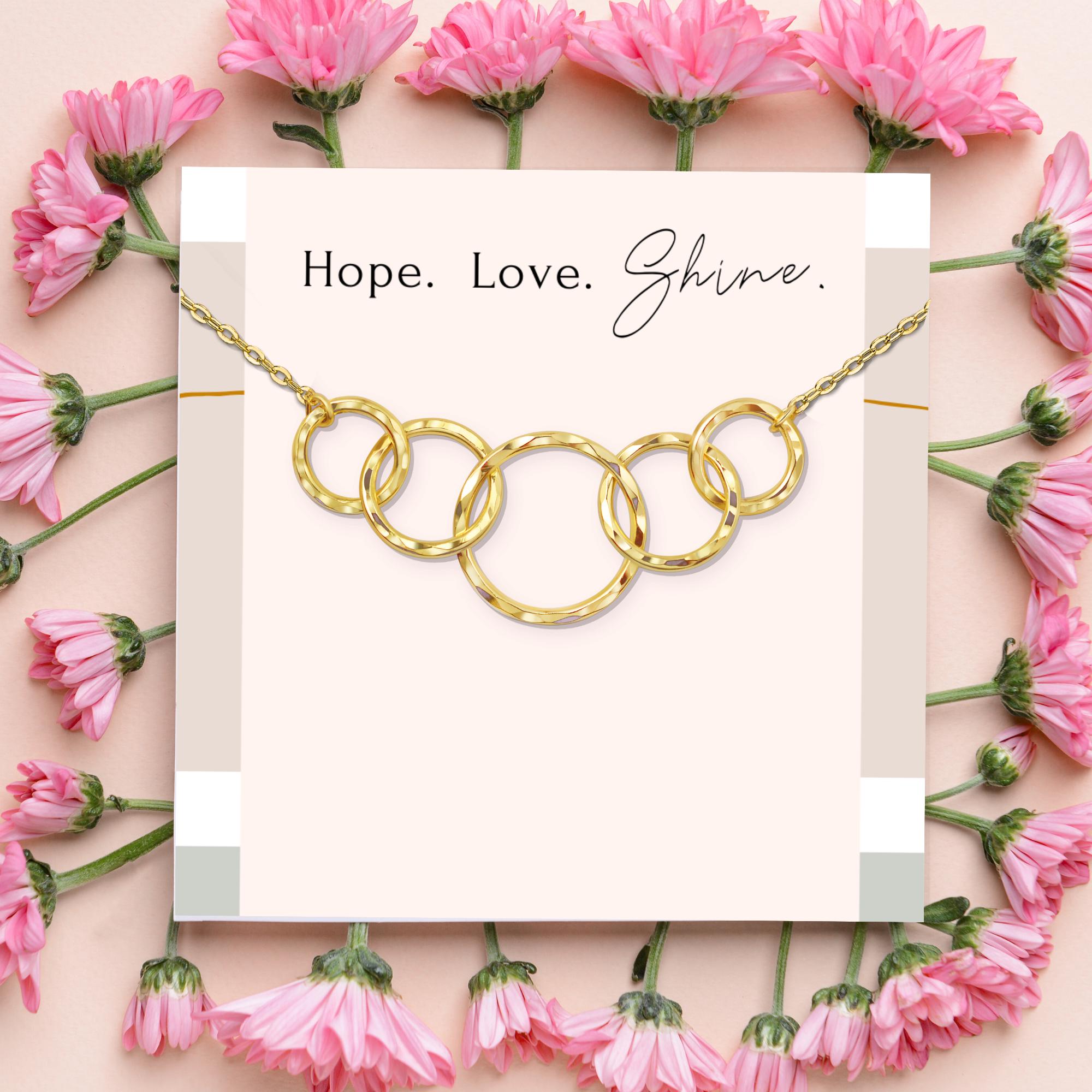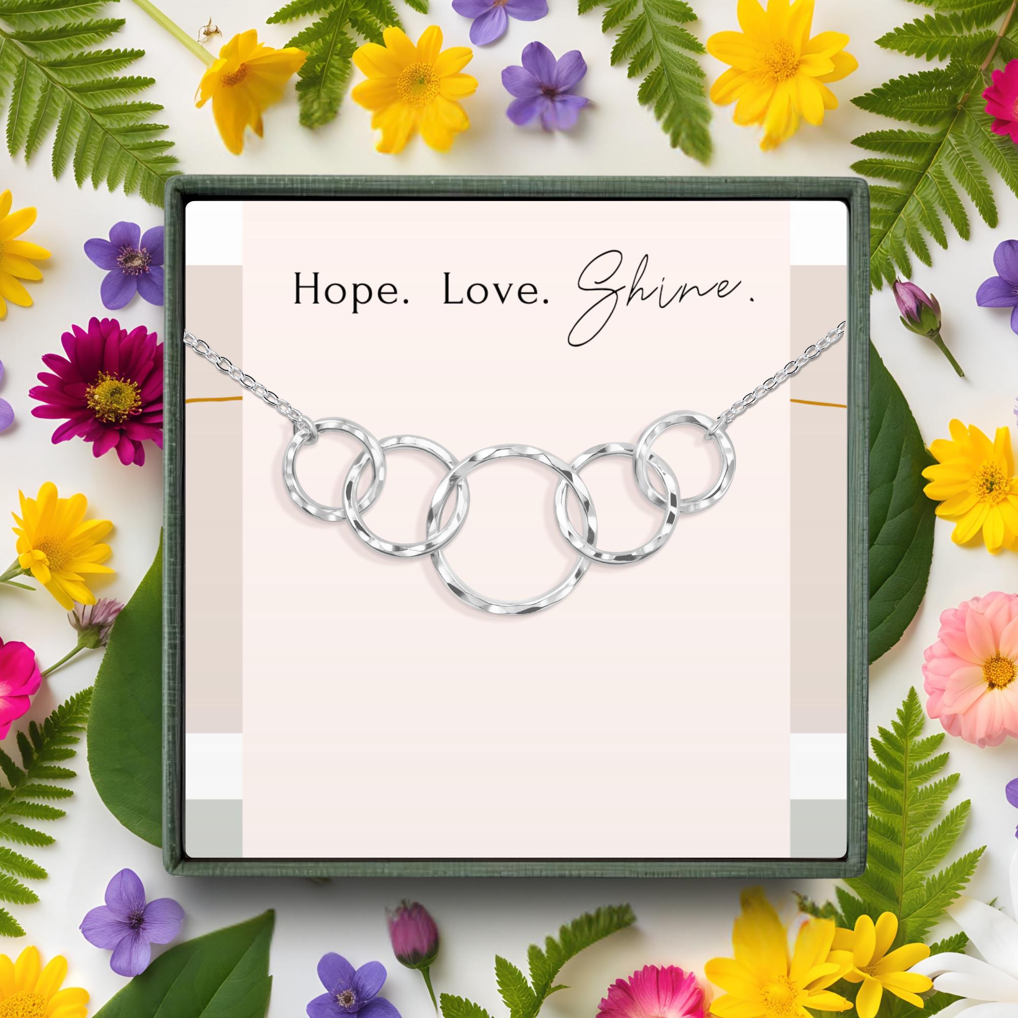 This striking statement necklace features five interlocking rings, each individually hand-textured with a hammered finish. The artisan craftsmanship ensures that the light catches the pendant from every angle, making the oversized 2.3" design a beautiful centerpiece for any outfit.