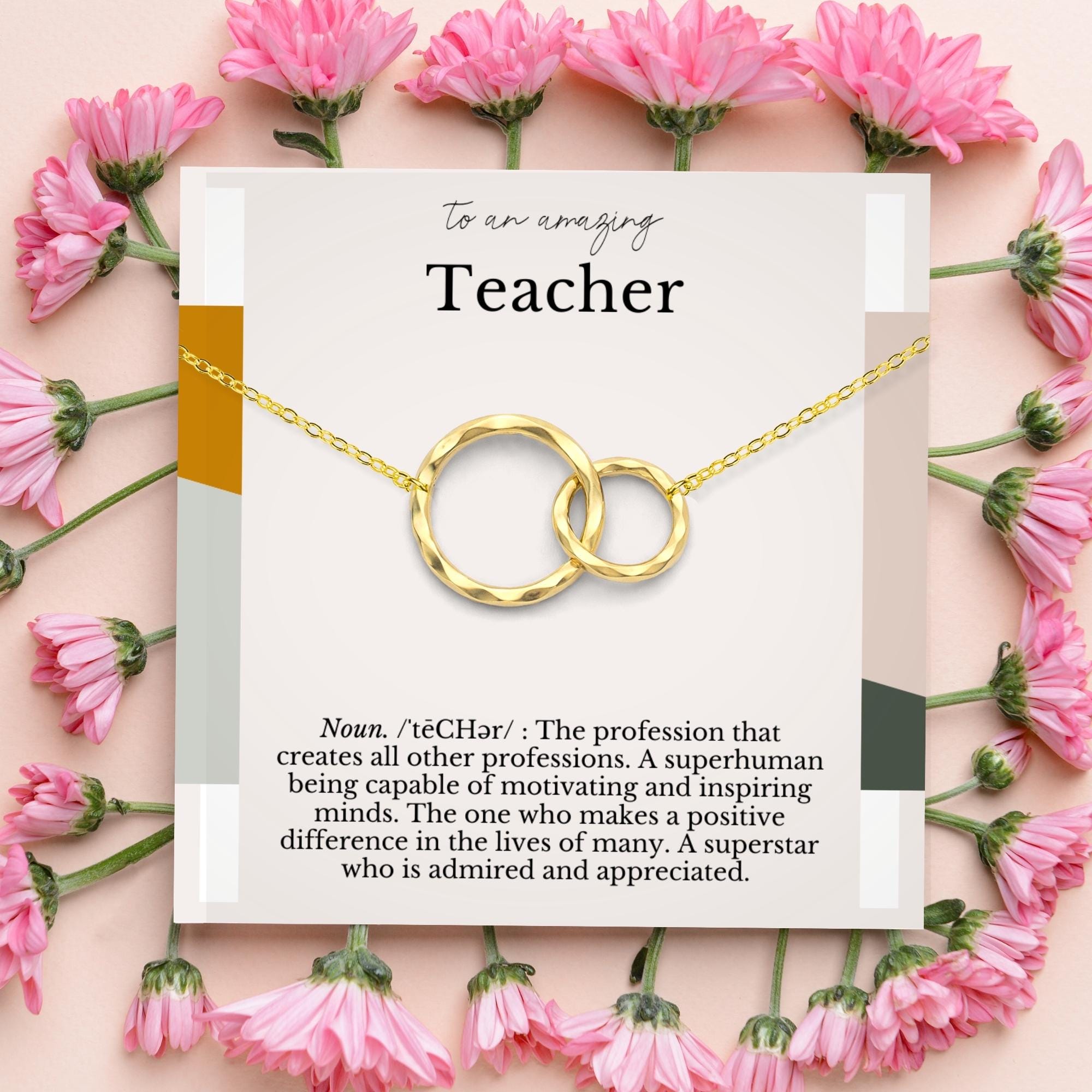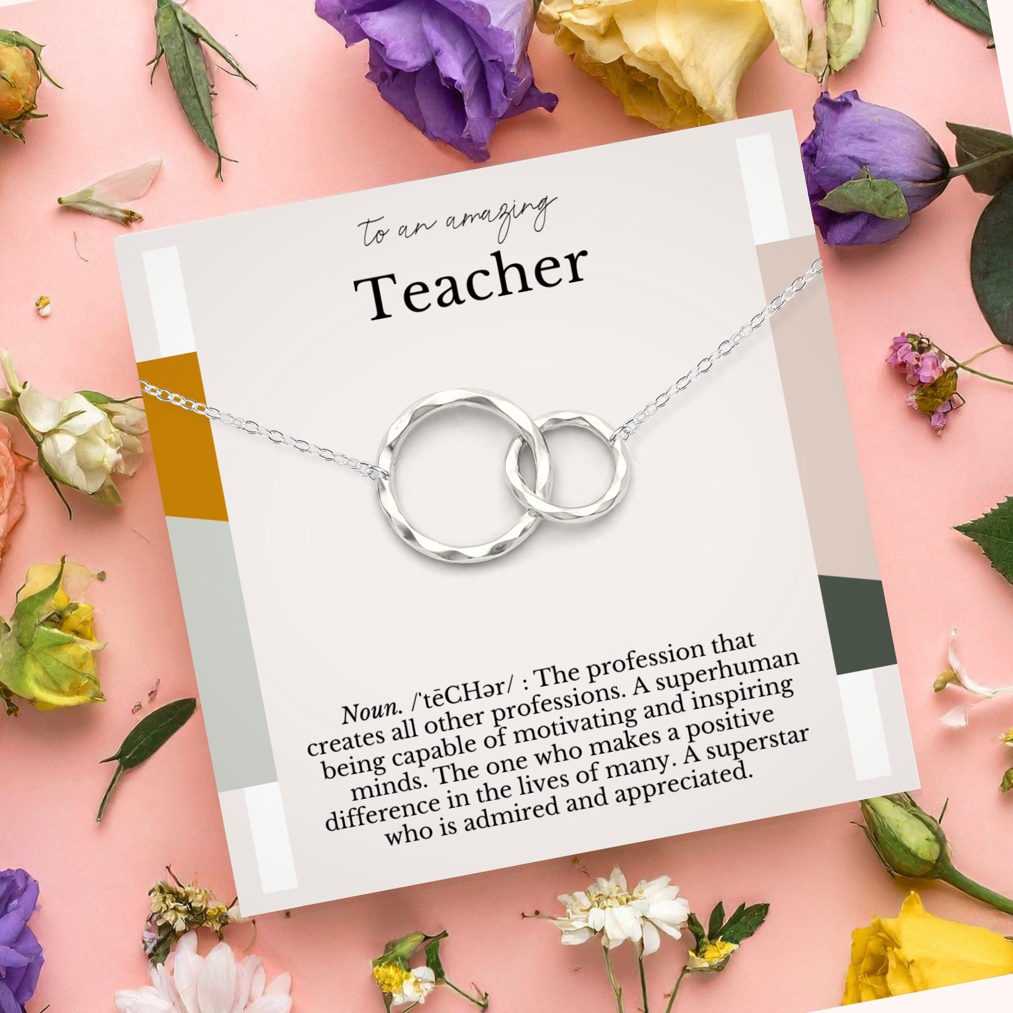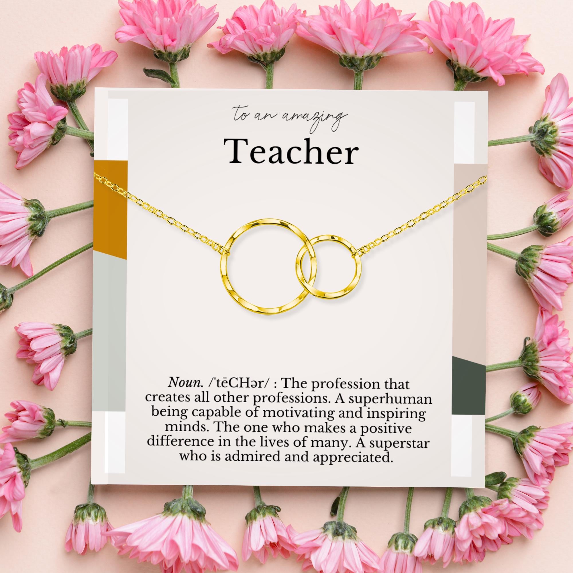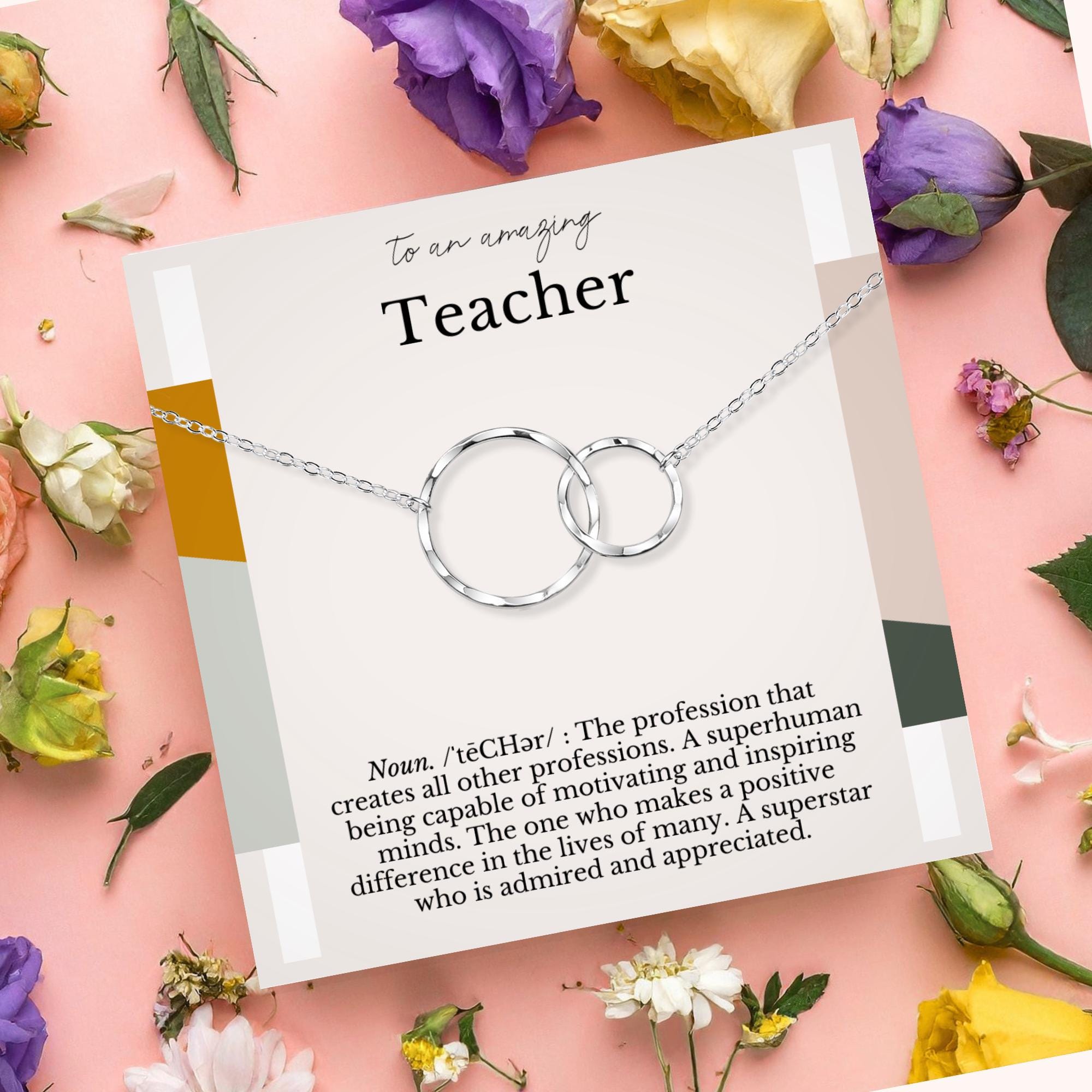 Show your appreciation to an amazing teacher with this meaningful gift necklace, featuring interlocking circle pendant, representing your infinite gratitude.