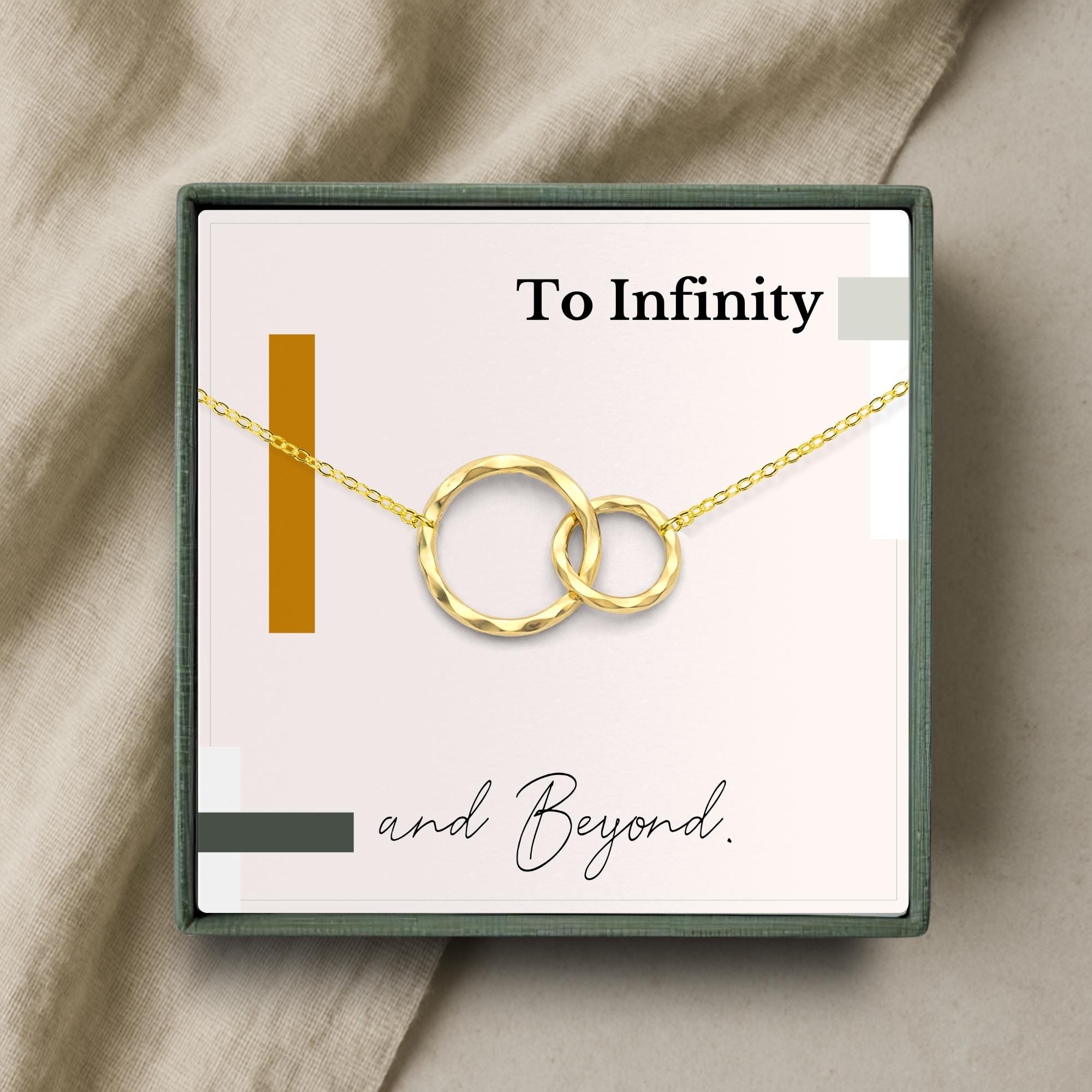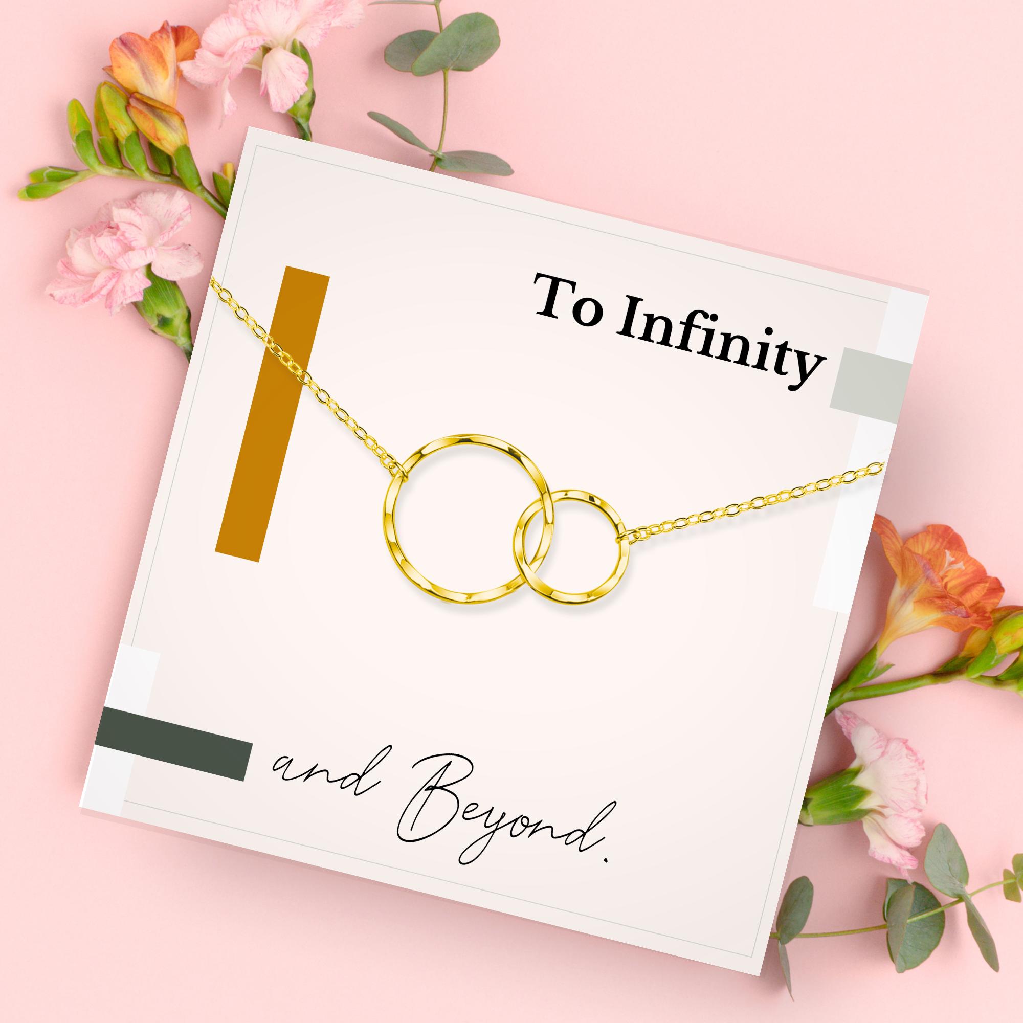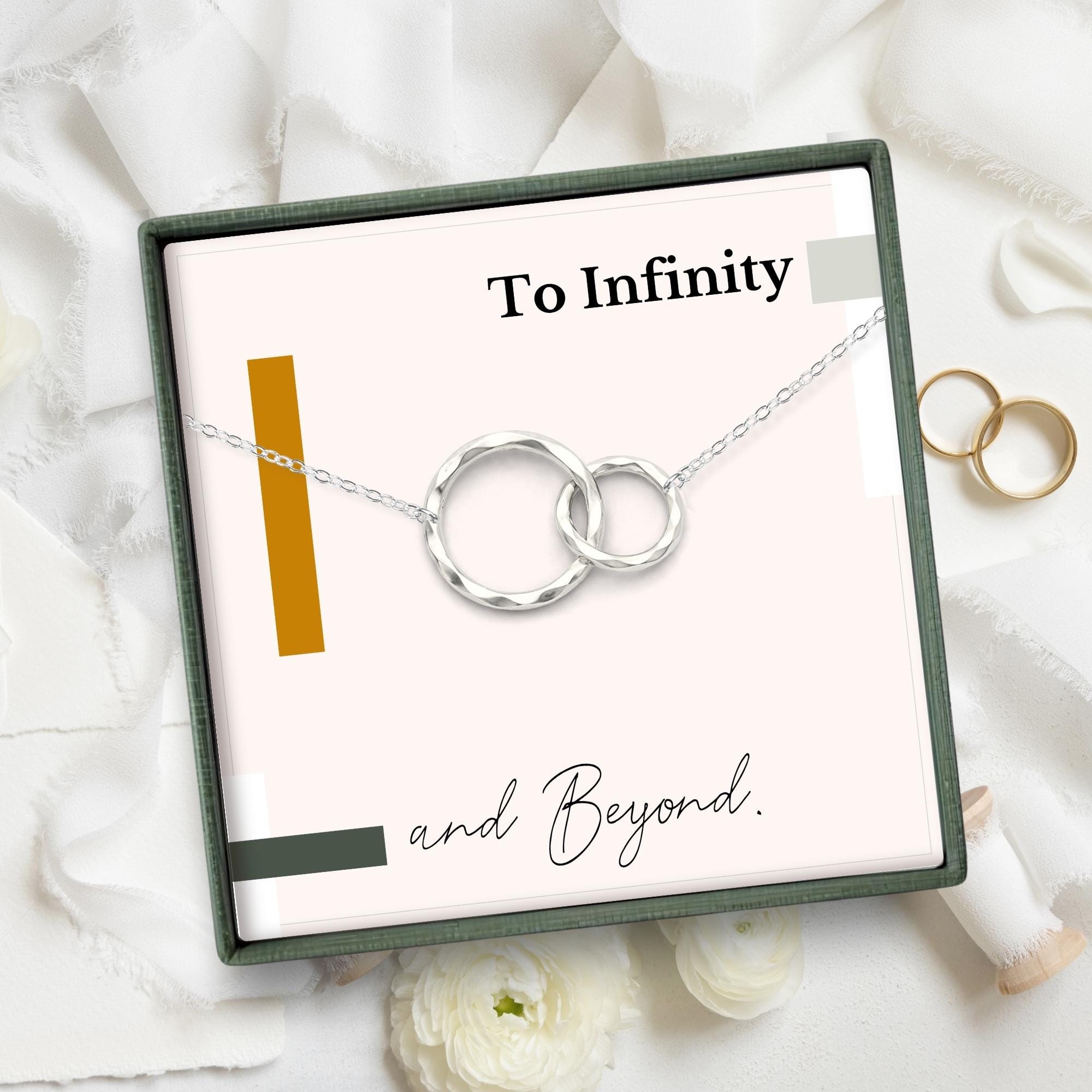 Celebrate an unbreakable bond with this elegant two-ring necklace, symbolizing endless connection and eternal love. Paired with a minimalist message card that reads, “To Infinity and Beyond,” this timeless piece captures the heart of a relationship built to last. Whether gifted on your wedding day, anniversary, or as a spontaneous token of devotion, it’s a beautiful way to say “forever.” Choose from gold or silver to match her style, and enjoy the ease of giving a gift that arrives perfectly packaged and ready to make her feel truly cherished.