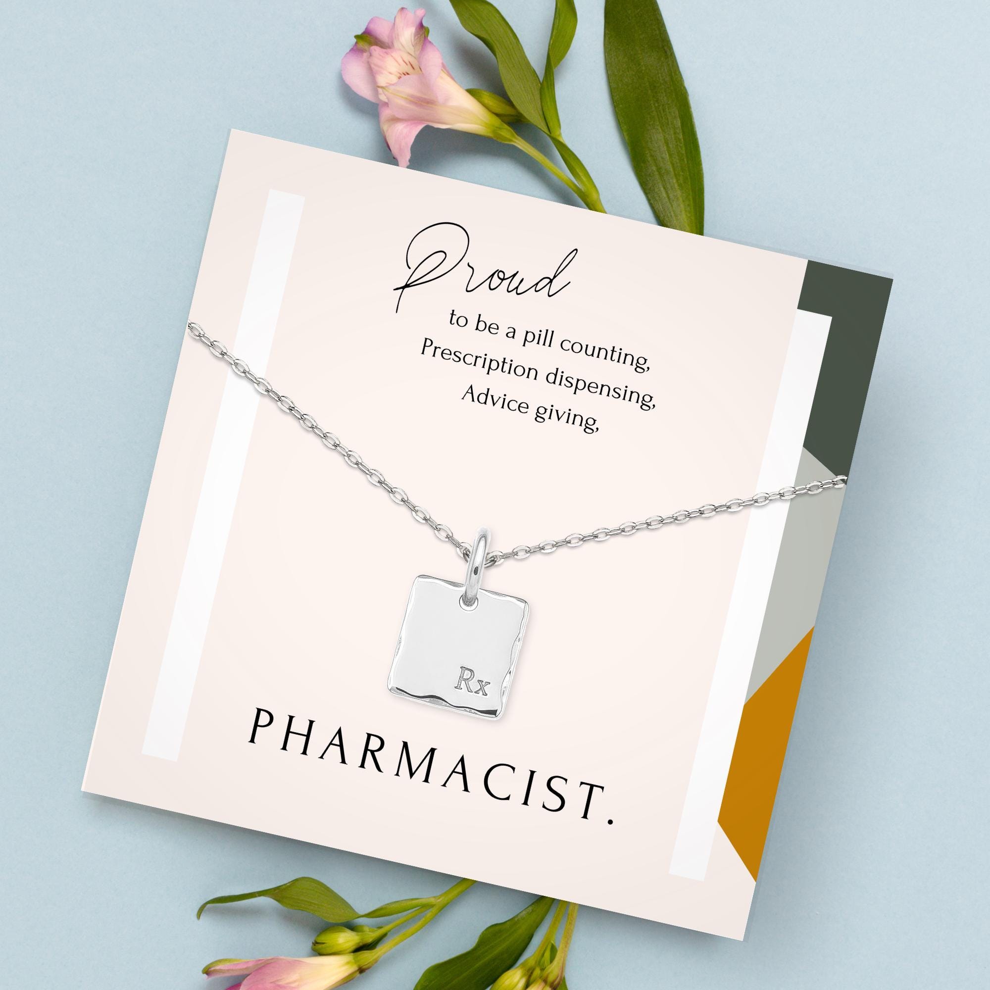 Show your appreciation to an amazing pharmacist with this sparkly necklace, featuring hand stamped "Rx" charm.