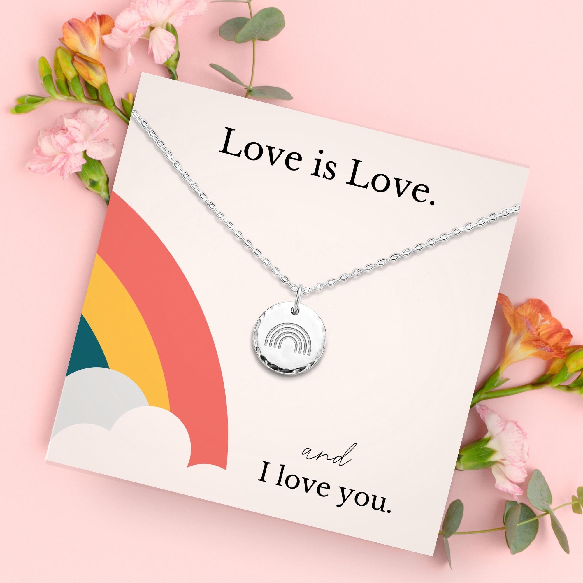 Celebrate love in all its beautiful forms with this “Love is Love” necklace—a heartfelt token of pride and affection. Whether you’re gifting it to your partner, girlfriend, boyfriend, or best friend, this piece is a radiant reminder that love knows no limits. A perfect gift for Pride, LGBTQ weddings, anniversaries, or just because, this dainty necklace arrives gift-ready to honor the love that makes life shine.