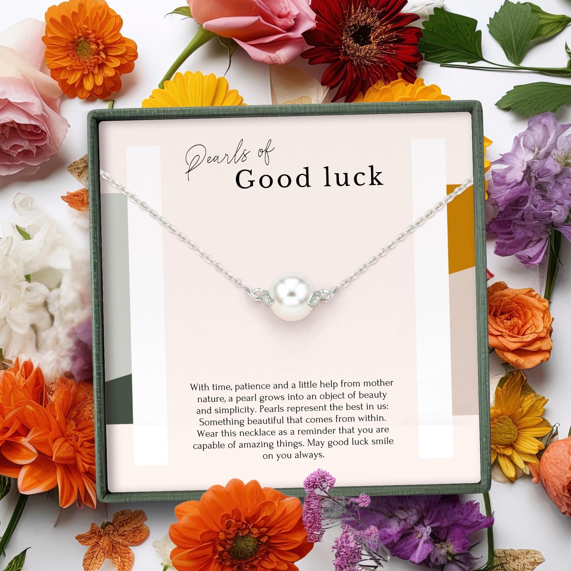 Lucky pearl necklace, Dainty good luck necklace, Graduation jewelry gift for her, Going away gift box with message, Retirement necklace