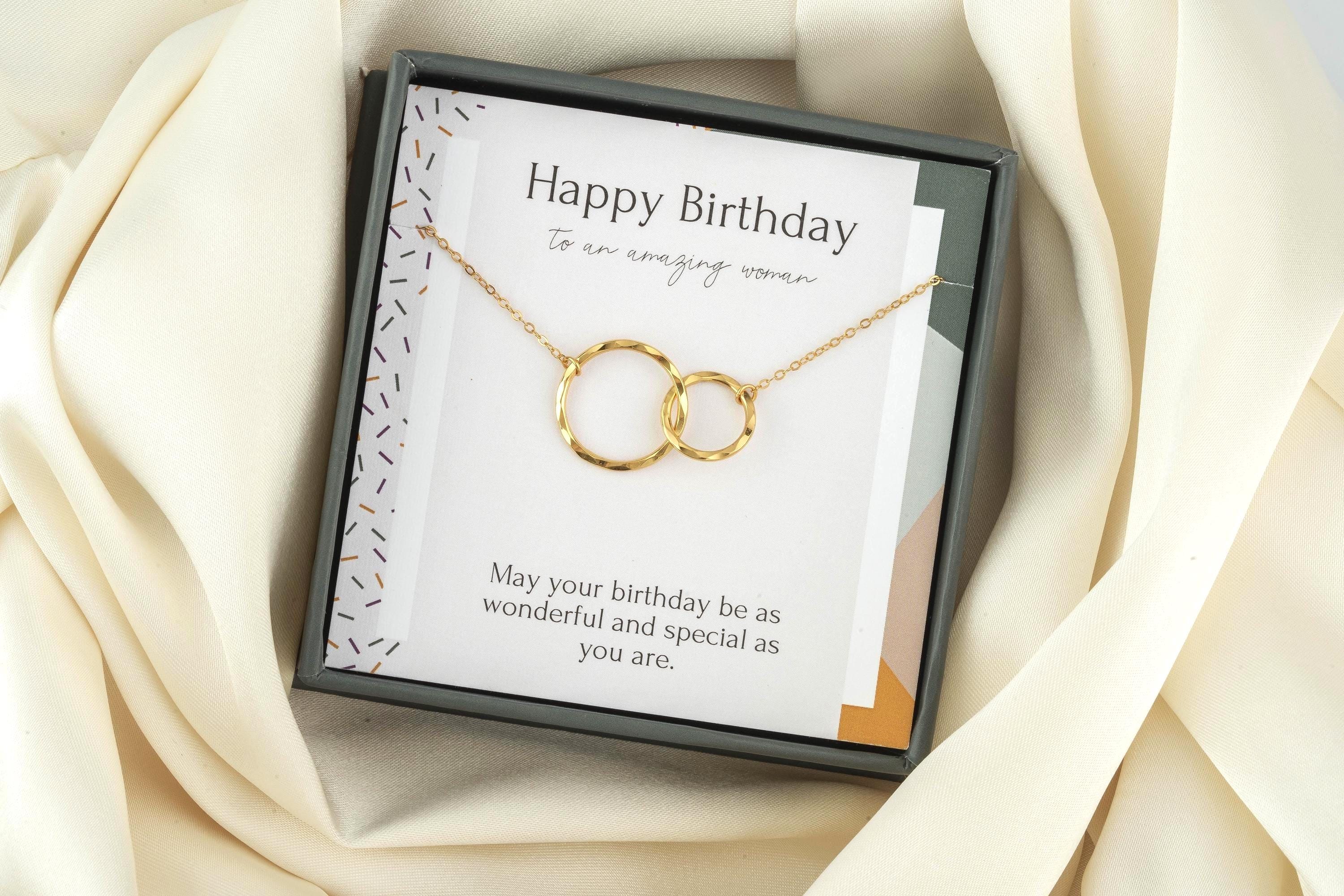 Celebrate the amazing woman in your life with this elegant interlocking circles necklace — a meaningful birthday gift that shines with love and appreciation. Crafted in sterling silver or 14K gold plated over sterling, this dainty minimalist necklace is a timeless piece she'll treasure. Whether it's for your wife, sister, or a cherished friend, this beautiful jewelry comes on a heartfelt birthday message card, making it a perfect ready-to-gift keepsake. Thoughtfully designed for birthdays, this special necklace is a wonderful way to make her feel as special as she truly is.