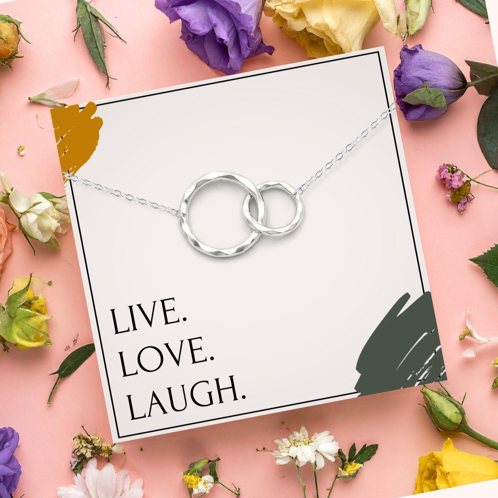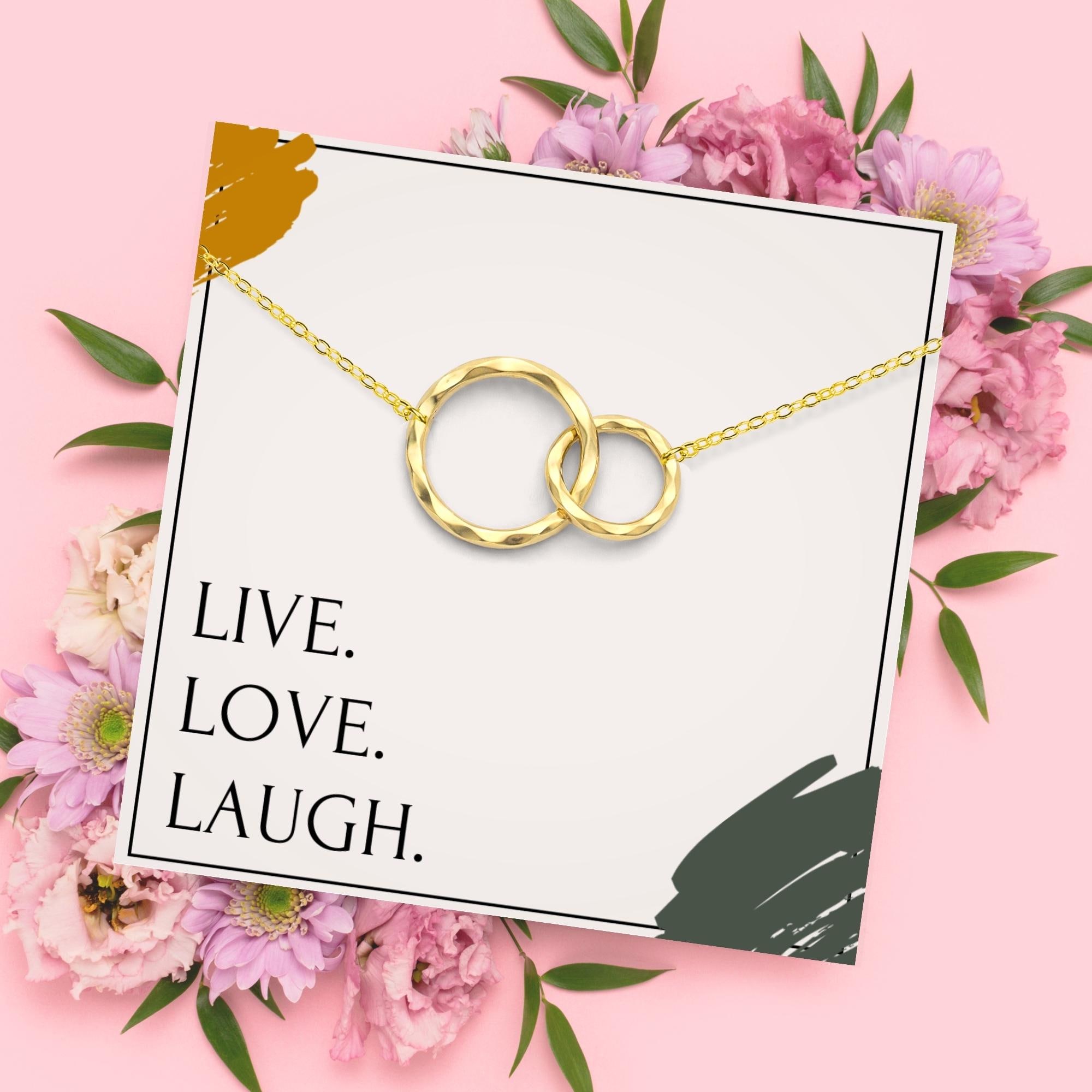Let this classic interlocking circles necklace be a positive reminder of three words to live by! A thoughtful and meaningful symbolic piece that will allow you to keep this mantra close to your heart. A present that will be treasured for many years to come.
