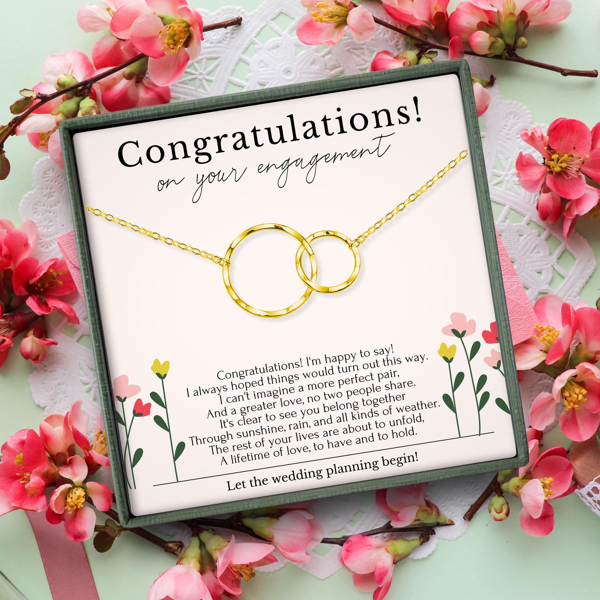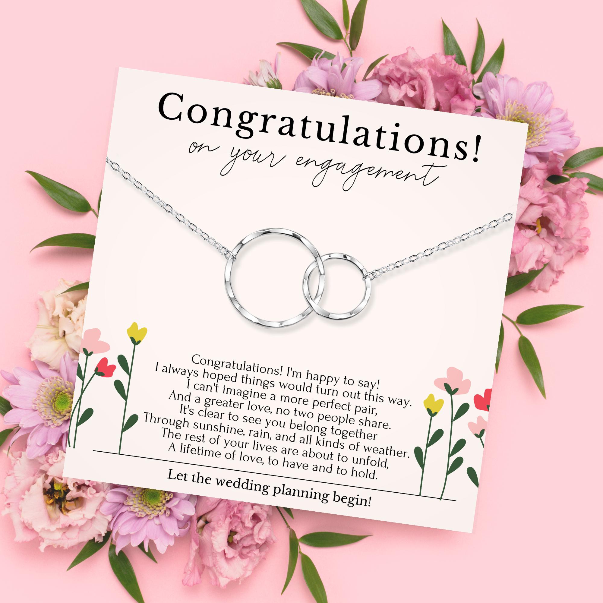 Celebrate the joy of a new beginning with this heartfelt Engagement Gift for Her, a meaningful token of love and congratulations for the happy couple. Featuring a timeless interlocking circles necklace in sterling silver, this elegant piece symbolizes unity, love, and the lifelong connection they share. Paired with a sweet message card expressing heartfelt wishes, this congratulations on engagement necklace makes the perfect keepsake for a bride-to-be. Whether you're a friend, family member, or loved one looking for a thoughtful engagement gift, this piece is a lasting reminder of the love that brought them together — and the lifetime of happiness that lies ahead.