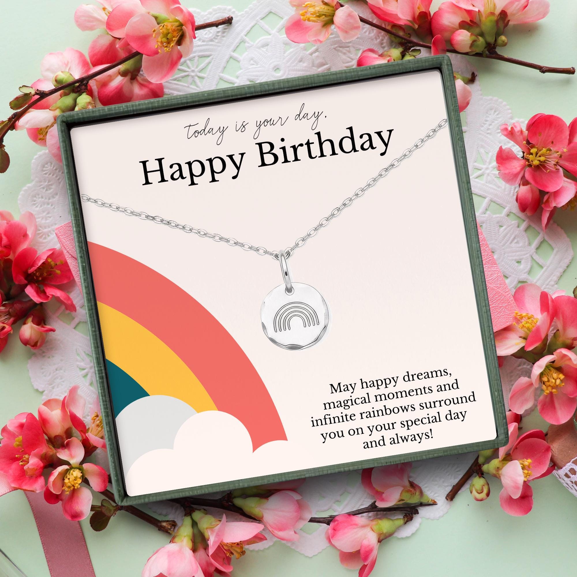 Brighten her special day with this sterling silver rainbow necklace — a joyful birthday gift for teen girls that celebrates happiness, dreams, and magical moments. Designed with a sweet happy birthday message card, this meaningful rainbow necklace makes a perfect keepsake for a 13th birthday, 14th birthday, or any milestone celebration. Whether you’re gifting your daughter, a young friend, or a loved one, this happy birthday jewelry is a heartfelt reminder that today is her day — surrounded by happy dreams, infinite rainbows, and love that lasts always.