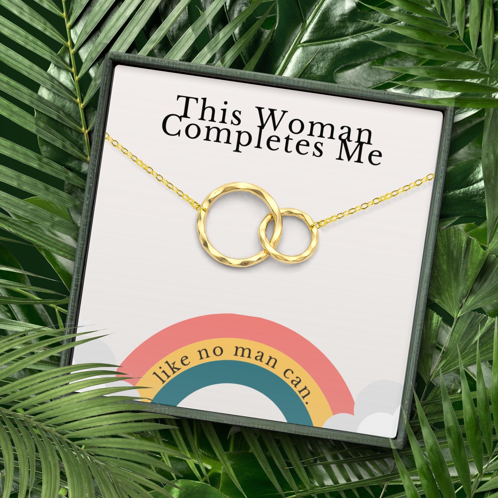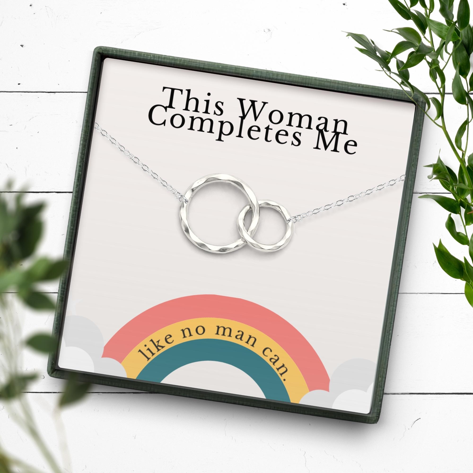 Celebrate a love that completes you with this meaningful “This Woman Completes Me” necklace—a powerful and romantic gift designed for LGBTQ+ couples. Whether it’s for your bride on your wedding day, your girlfriend on your anniversary, or simply to say “I love you” in a way that honors who you are together, this charm necklace captures the strength of your bond. A perfect symbol of love, pride, and commitment, it arrives beautifully packaged and ready to gift.
