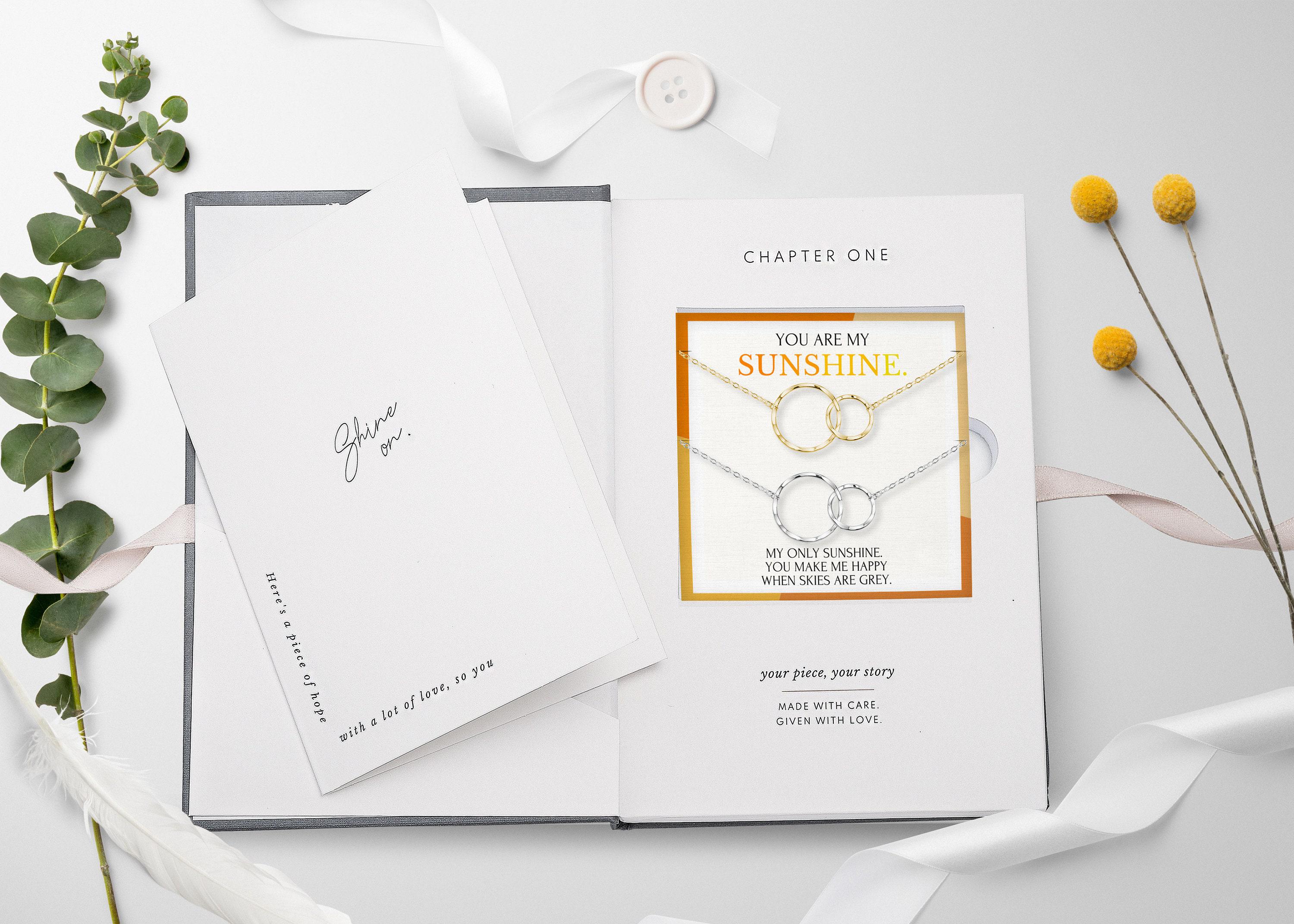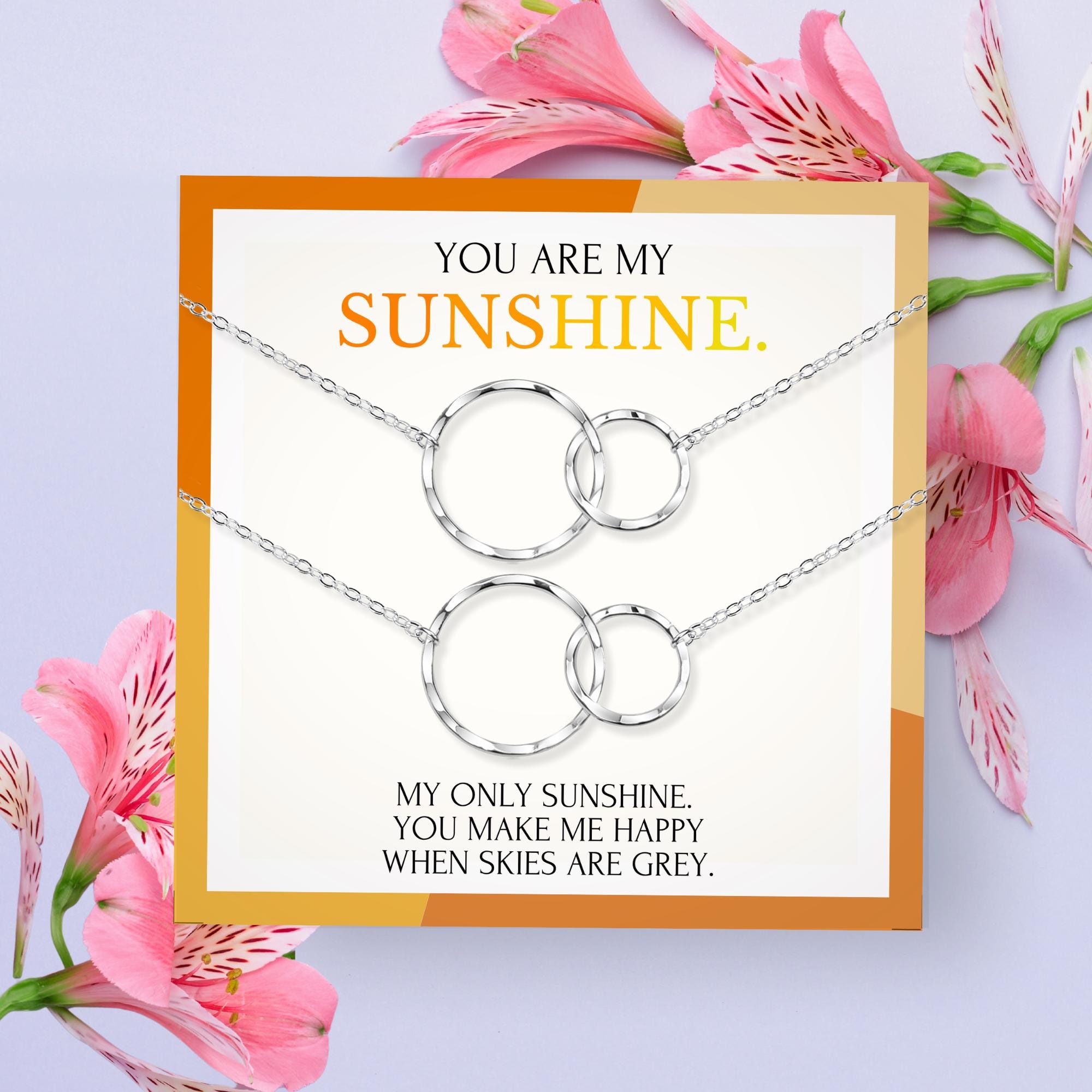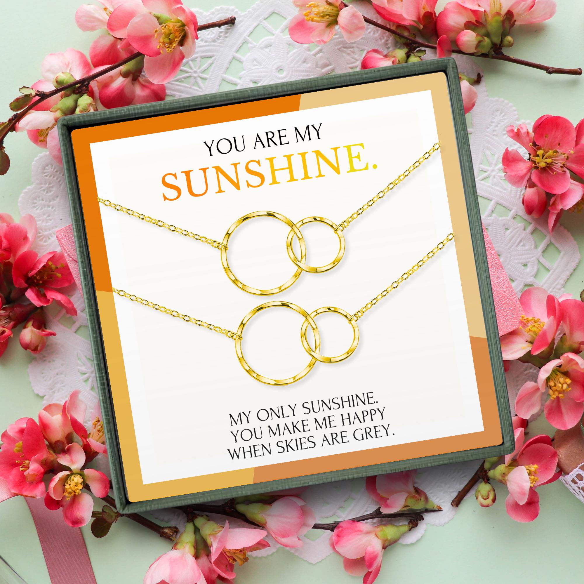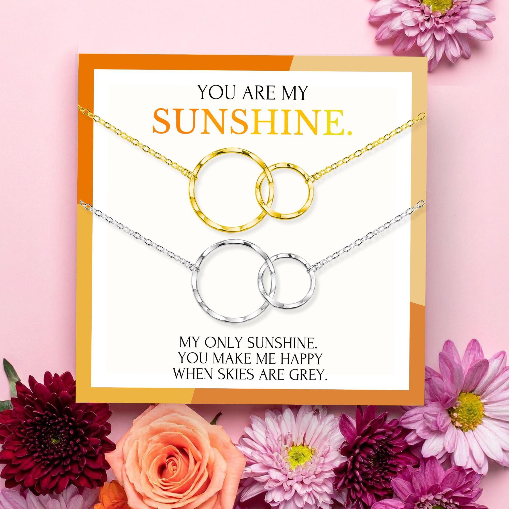 This “You Are My Sunshine” double circle necklace is a radiant reminder of the love that lights our lives. With its symbolic gold design, it captures the bond between a mother and daughter—a connection that brings joy even in grey skies. Whether you're gifting it for a daughter’s birthday, graduation, or just because, this meaningful necklace is a way to say “you make me happy” every day. Ideal for daughters, granddaughters, or goddaughters, this sunshine necklace is a heartfelt expression from mom, grandma, or any loving figure. Beautifully gift-boxed and ready to give, it’s the perfect token of encouragement, warmth, and lifelong connection.