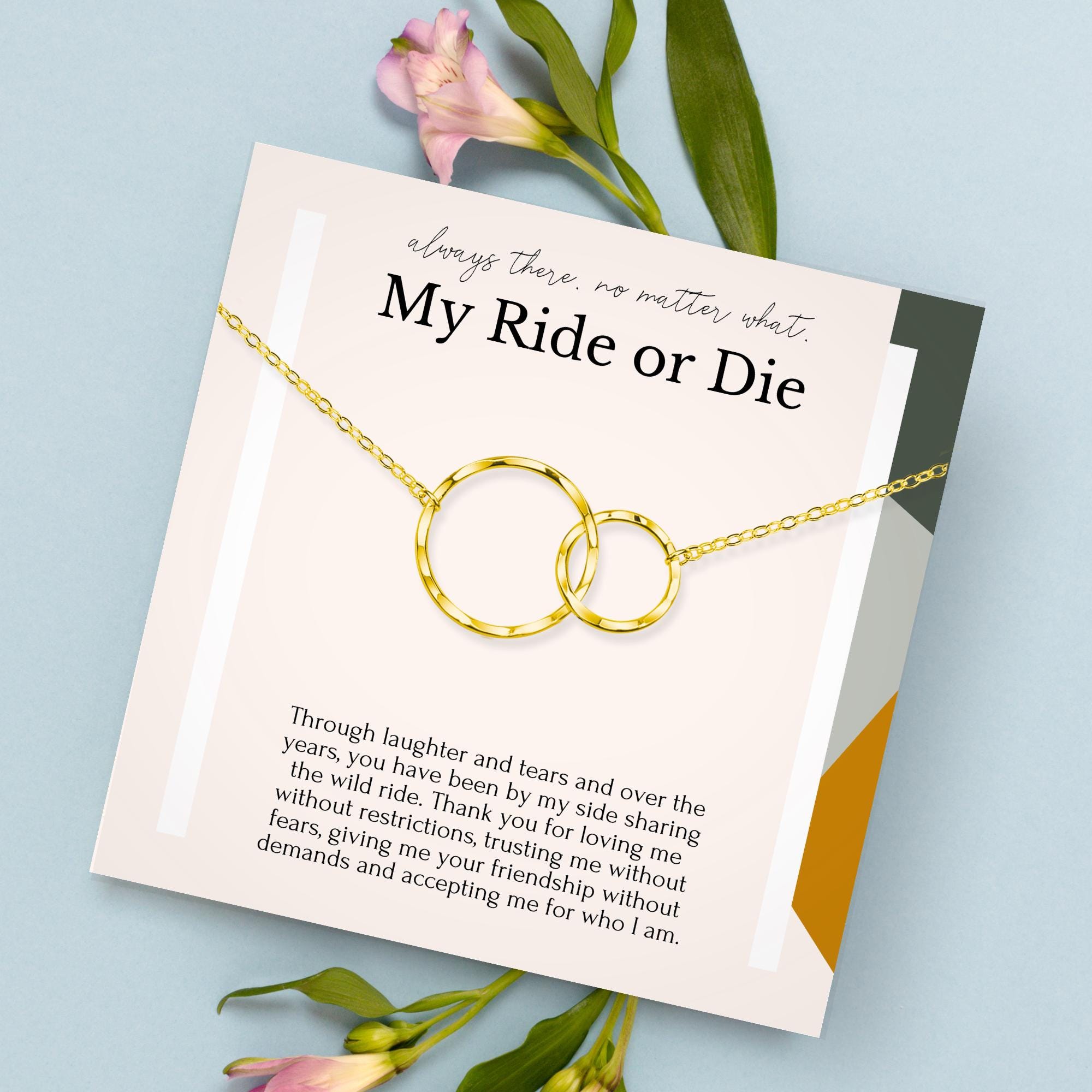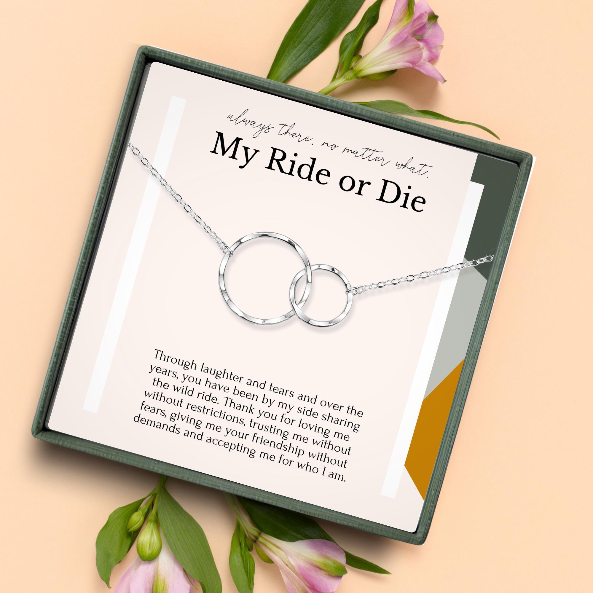Thoughtful gift ideas if you are looking for: ride or die necklace, best friend gift for women, soul sister necklace, gift for chosen family, friendship necklace for her, 2 ring best friend jewelry, meaningful bestie gift, ride or die friend necklace, interlocking friendship necklace, loyal friend appreciation gift.
