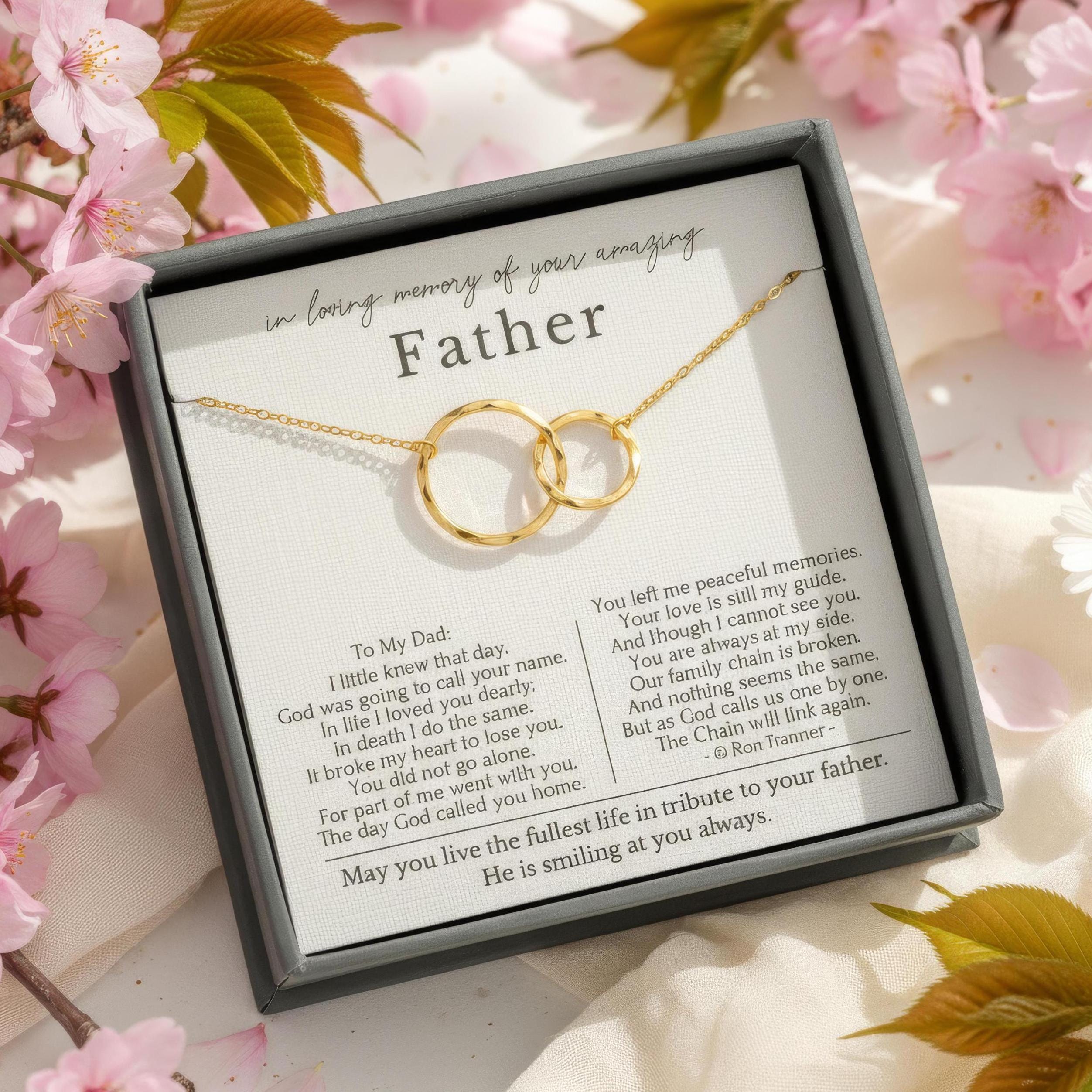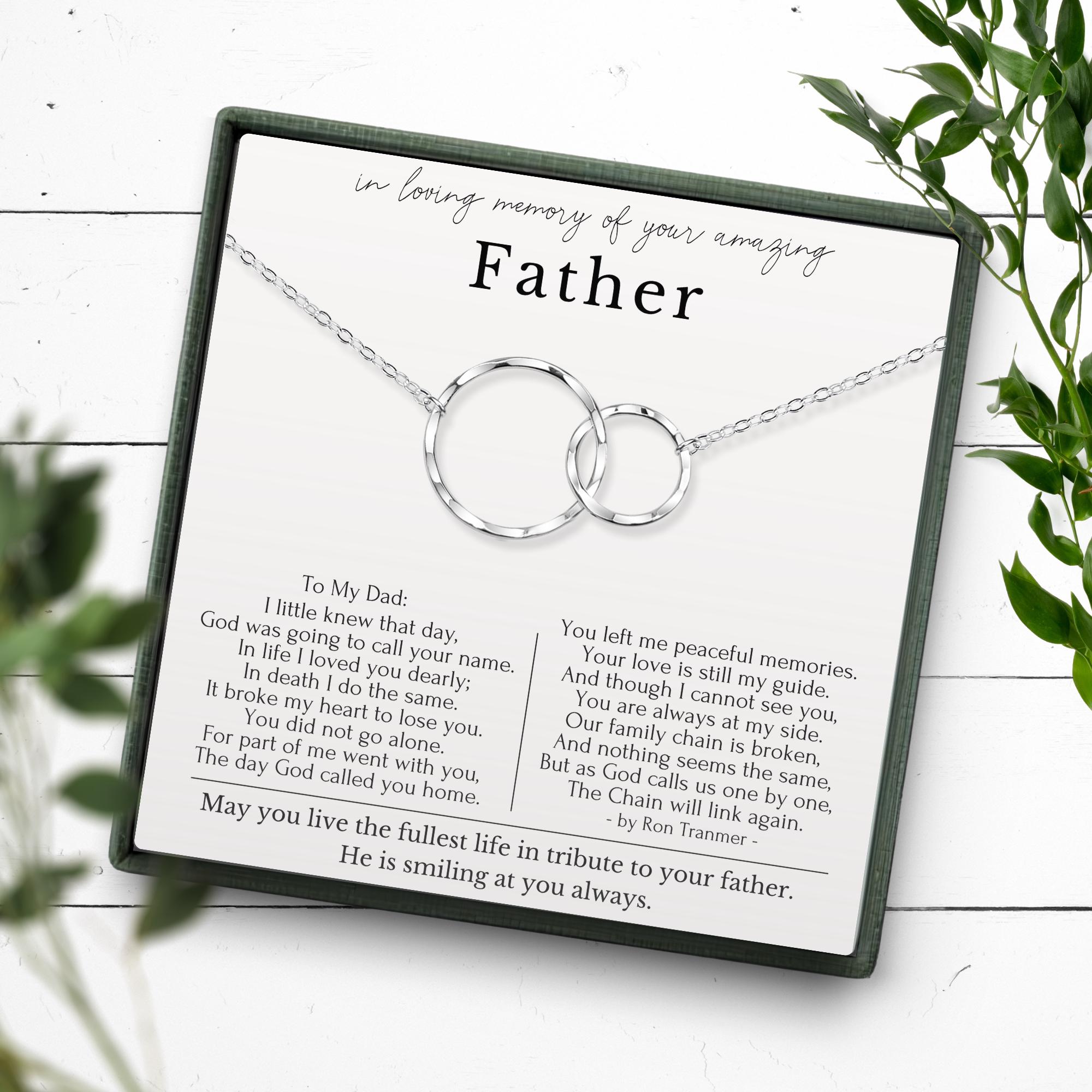 Honor your father's love with this beautiful necklace, a treasured reminder of his presence. This Loss of Father gift features an elegant infinity circle pendant, symbolizing the everlasting bond you share. Wear it close to your heart as a Father Remembrance Gift and keep his memory alive. This necklace comes with a meaningful message so you can let her know you are thinking about her during these hard times.