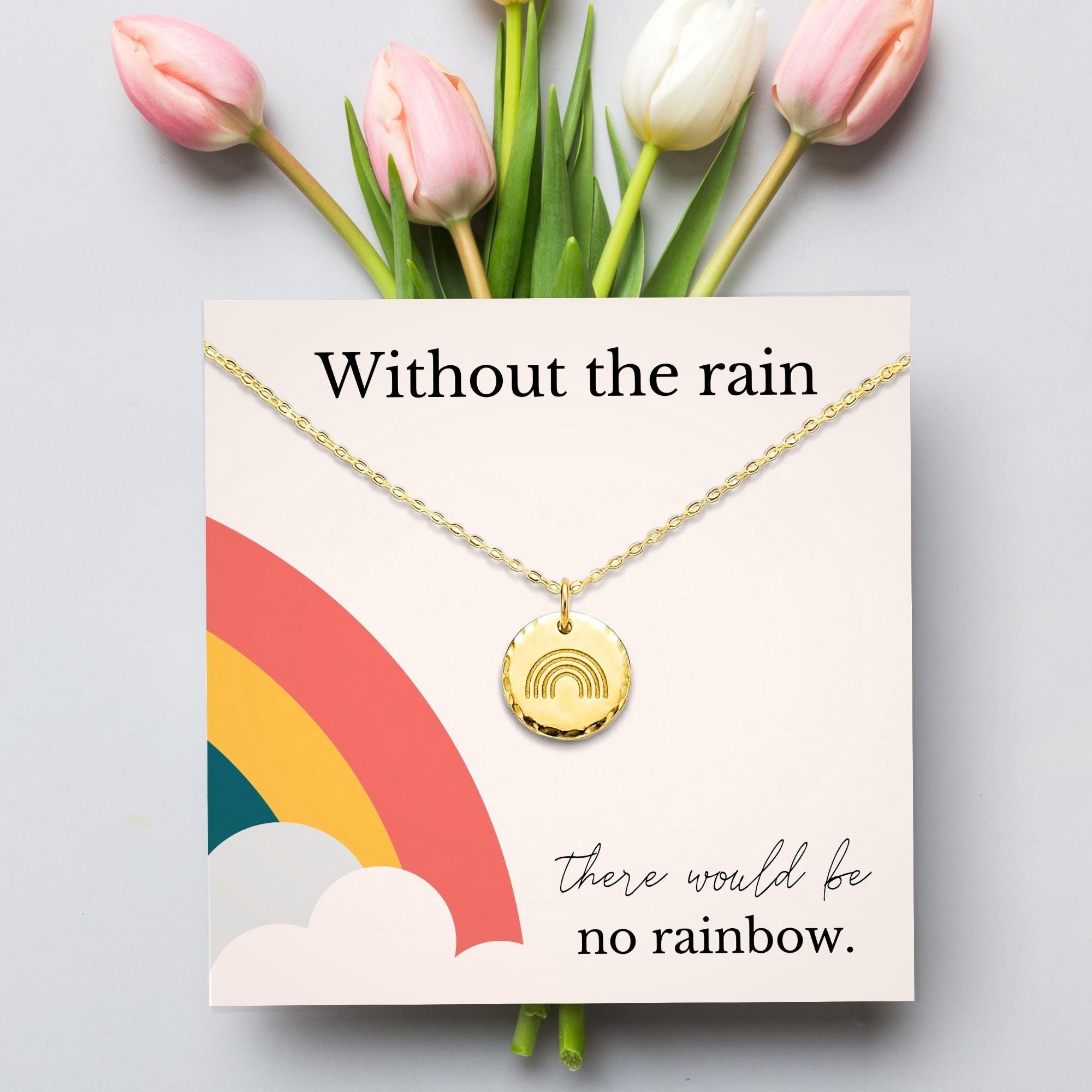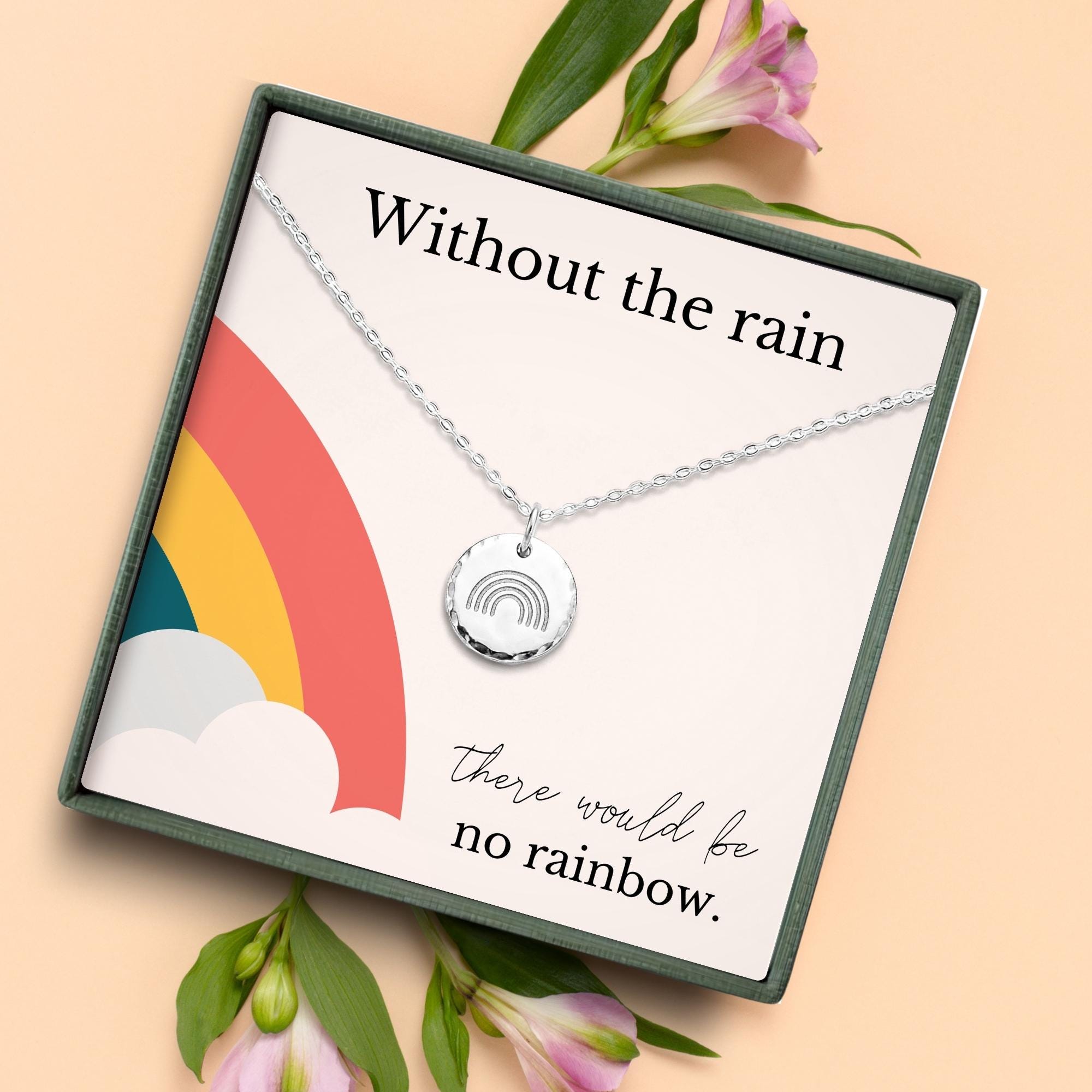 Celebrate the journey of motherhood with our "Without the Rain" necklace, a heartfelt rainbow baby gift for moms. This meaningful piece serves as an encouragement gift, symbolizing strength and resilience during challenging times. Crafted with care, it's a reminder that even in the darkest moments, there's hope for brighter days ahead. Show your support and love with this thoughtful necklace, a perfect token of strength for her.