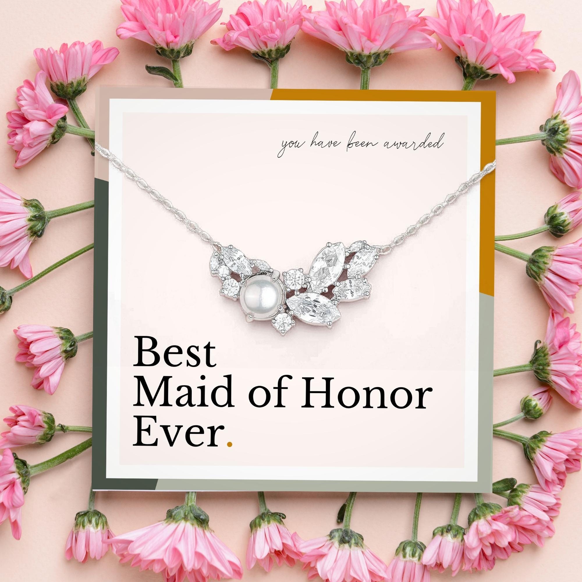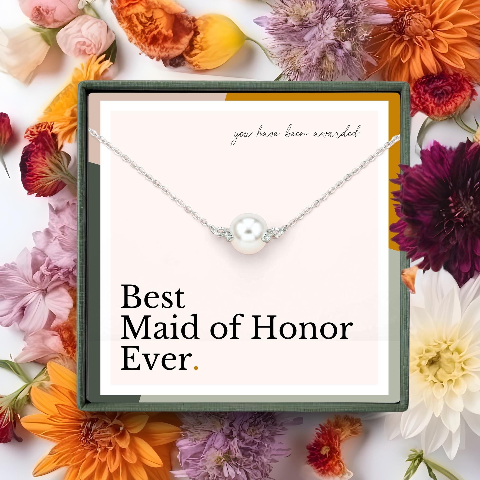 A beautiful way to ask or thank your Maid of Honor. This “Best Maid of Honor” jewelry card features a timeless freshwater pearl or pearl and crystal necklace, symbolizing love, gratitude, and lasting friendship. A meaningful keepsake she’ll cherish forever.