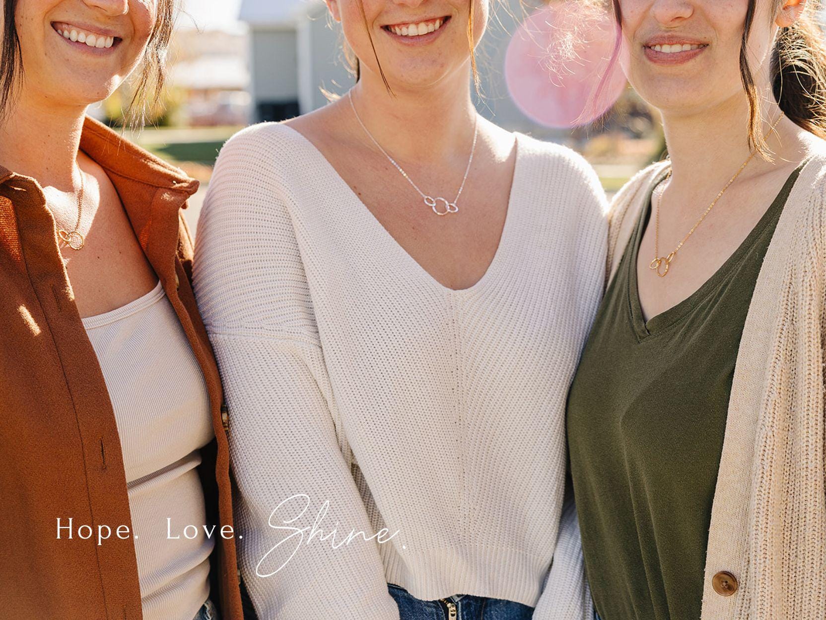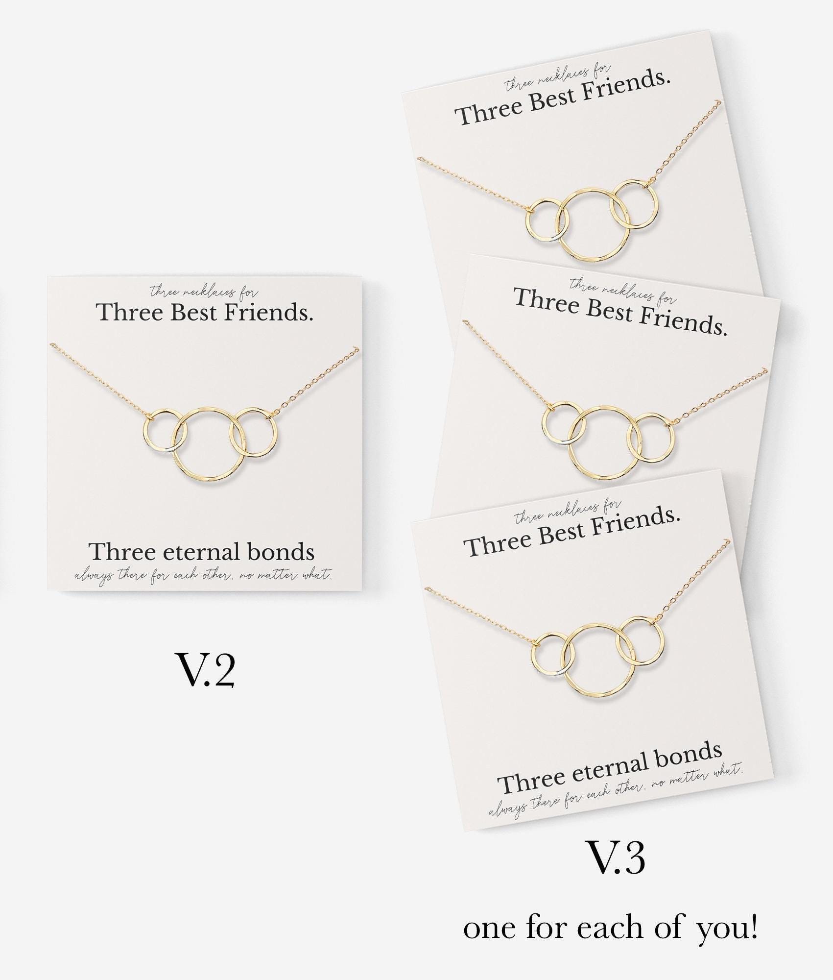 With option V.1 you will receive a set of 3 two ring necklaces - one for each sister. Option V.2 includes a single necklace with 3 interlocking rings. This 3 ring necklace is also available as a set of 3 separate necklaces by choosing option V.3. Please note that with option V.3, each necklace will be packaged separately in it's own box.