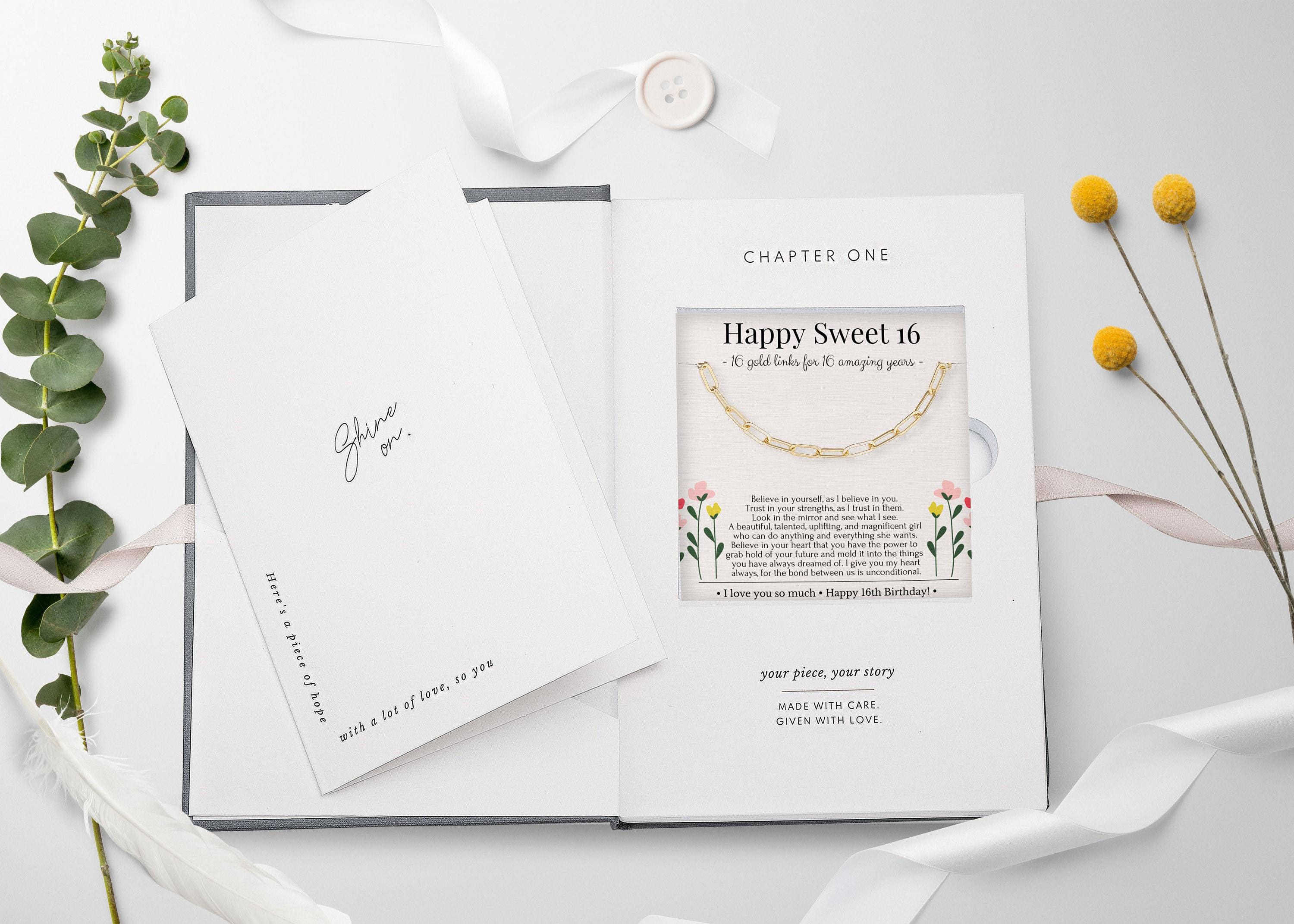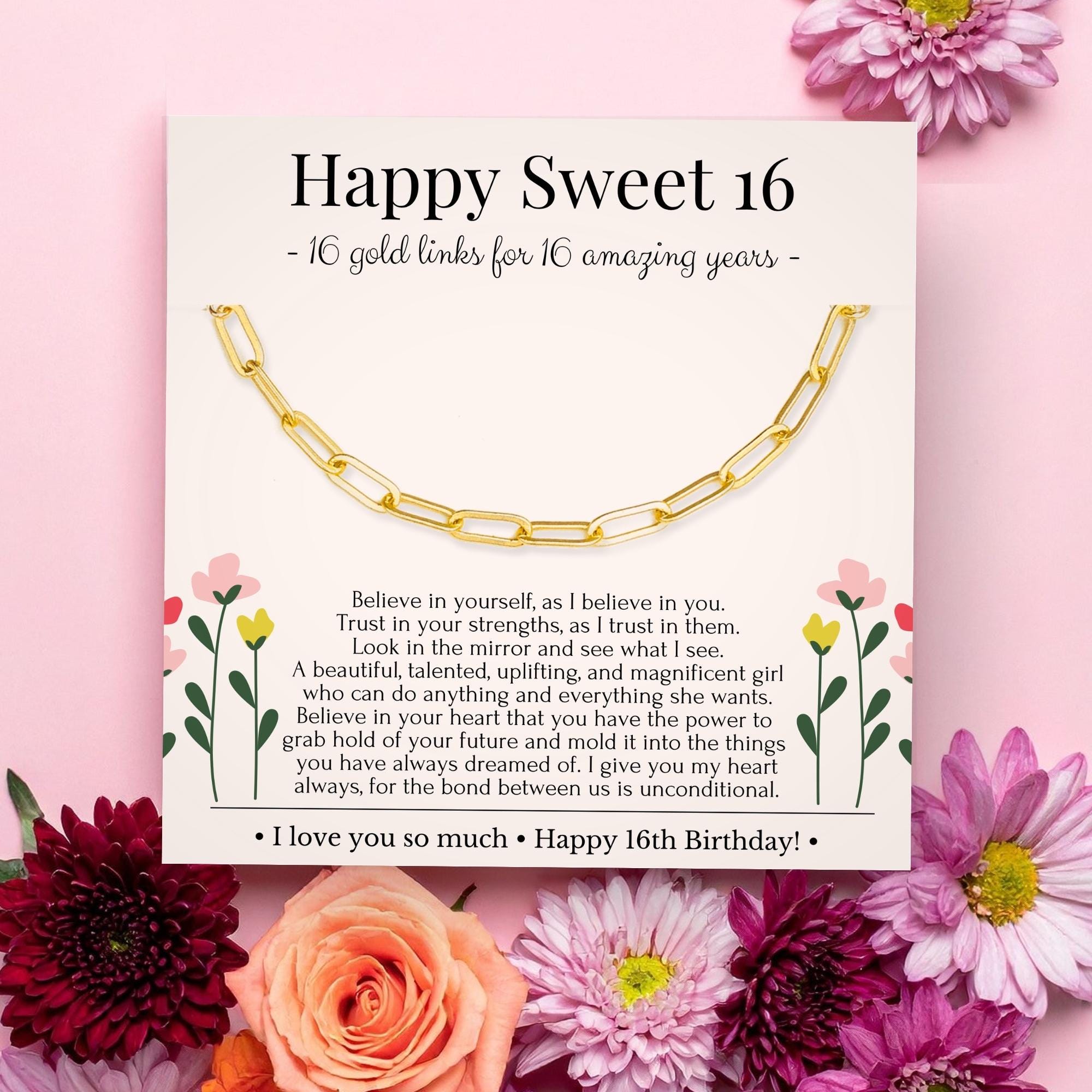 A special birthday girl deserves something beautiful for her birthday! Give her this classic and meaningful necklace, featuring 16 links of gold to represent 16 amazing years! A perfect thoughtful and meaningful gift for your wonderful birthday girl.