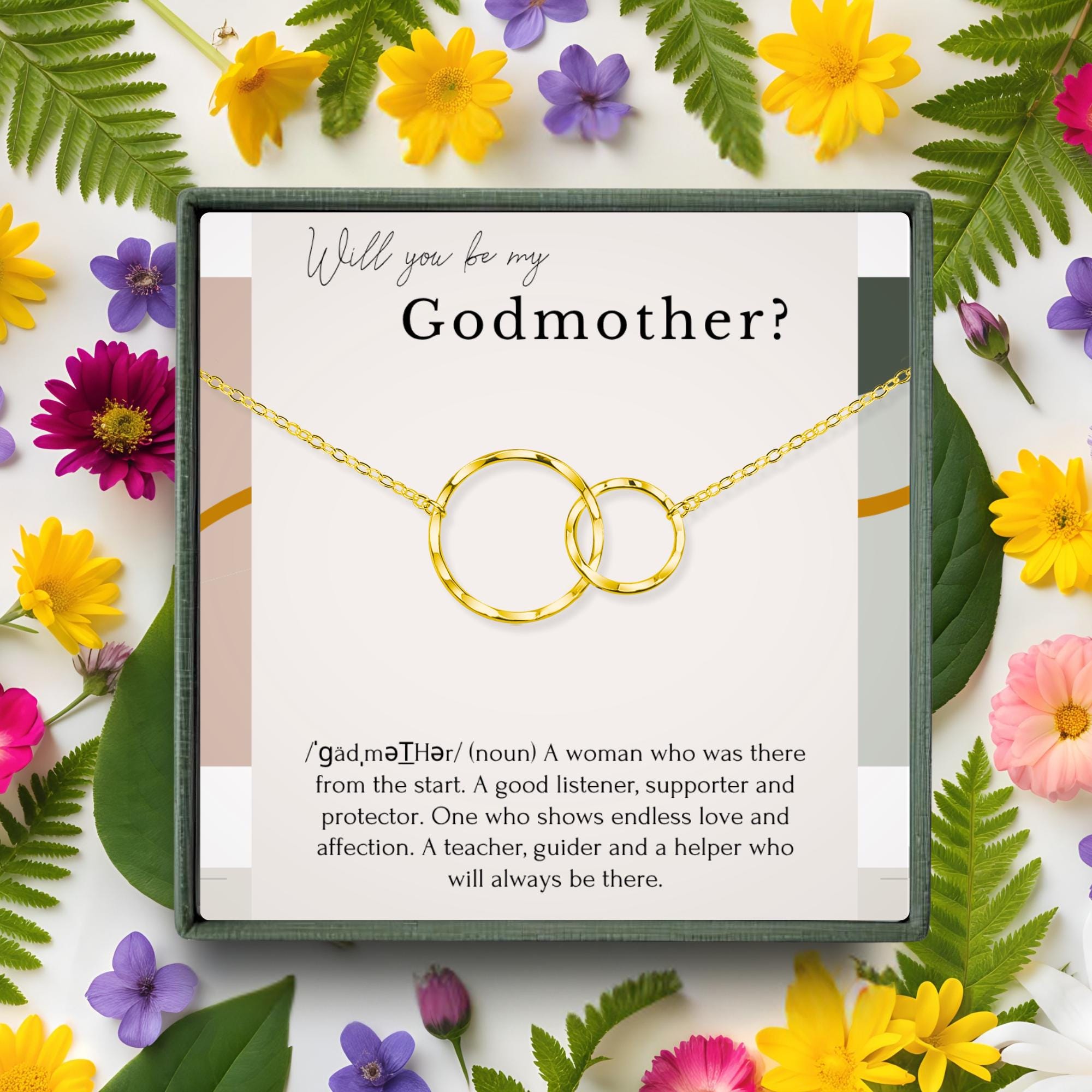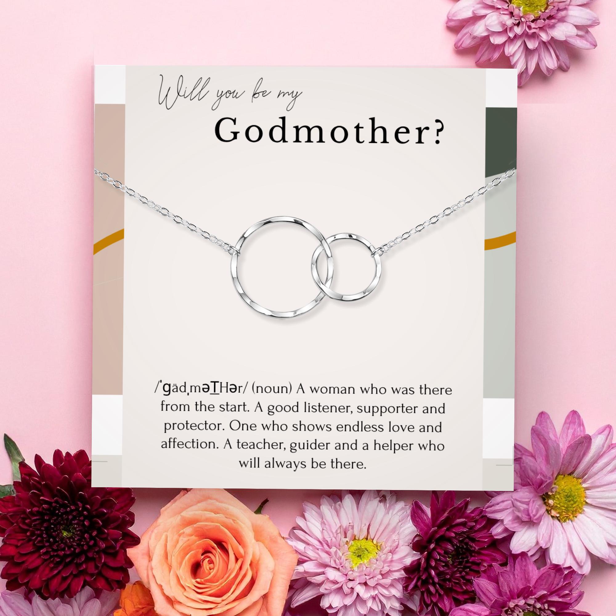 This beautiful Godmother proposal necklace is the perfect way to ask someone special to be your child's godmother. The 14K gold-filled or sterling silver Eternity Circle necklace features a delicate pendant symbolizing your everlasting bond. It comes with a heartfelt message card, making this a truly meaningful gift she'll cherish forever.
